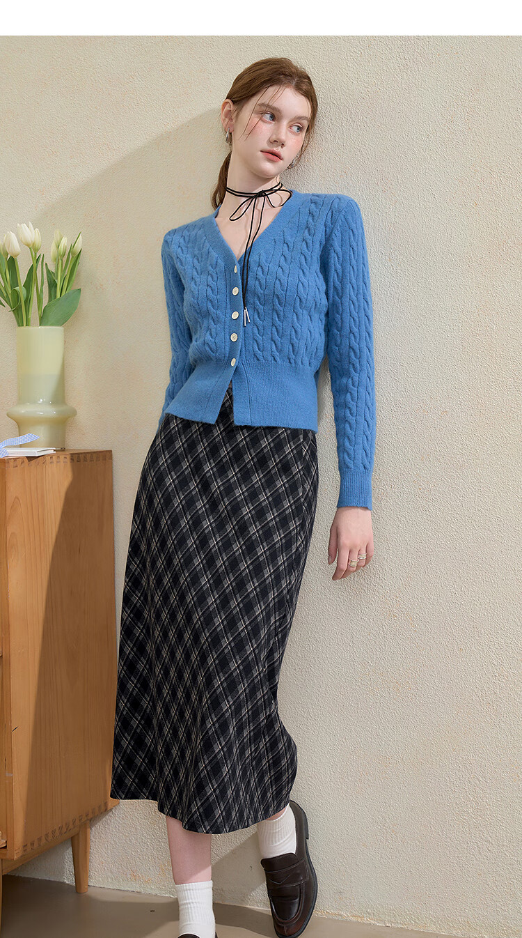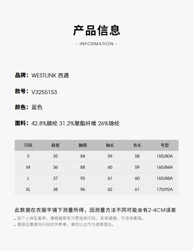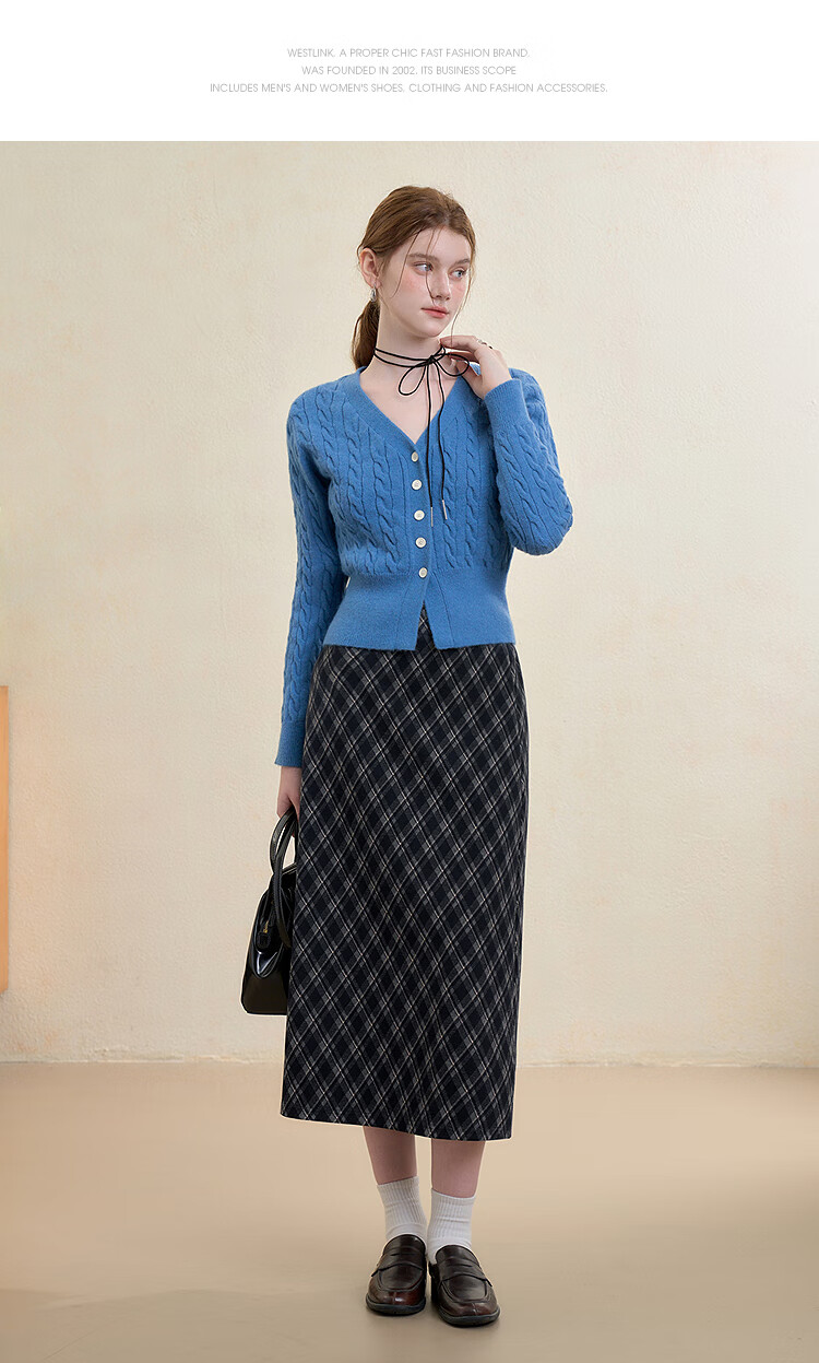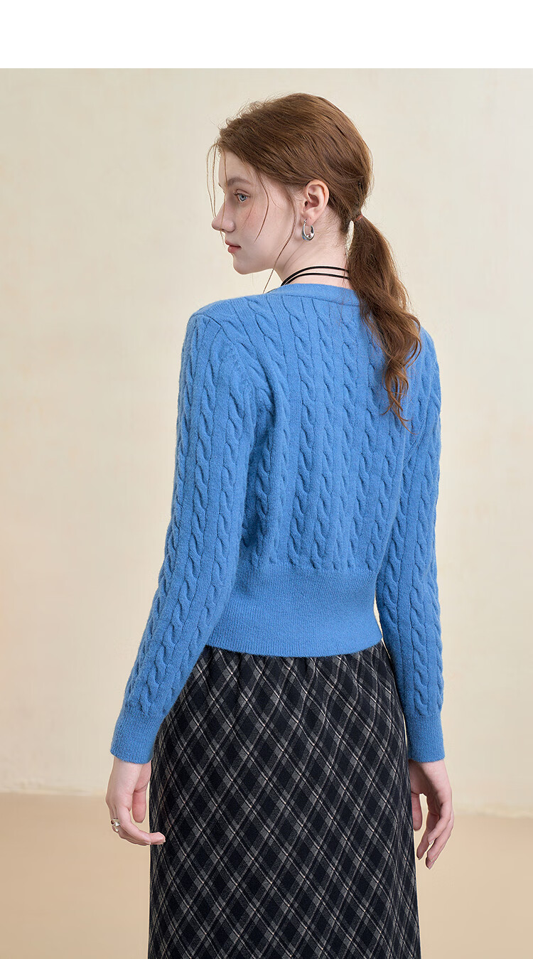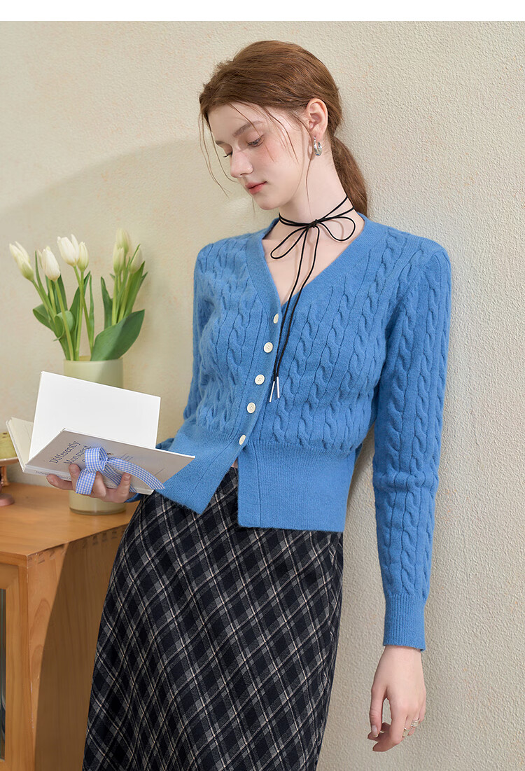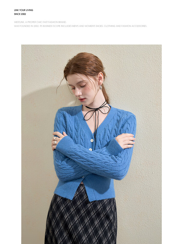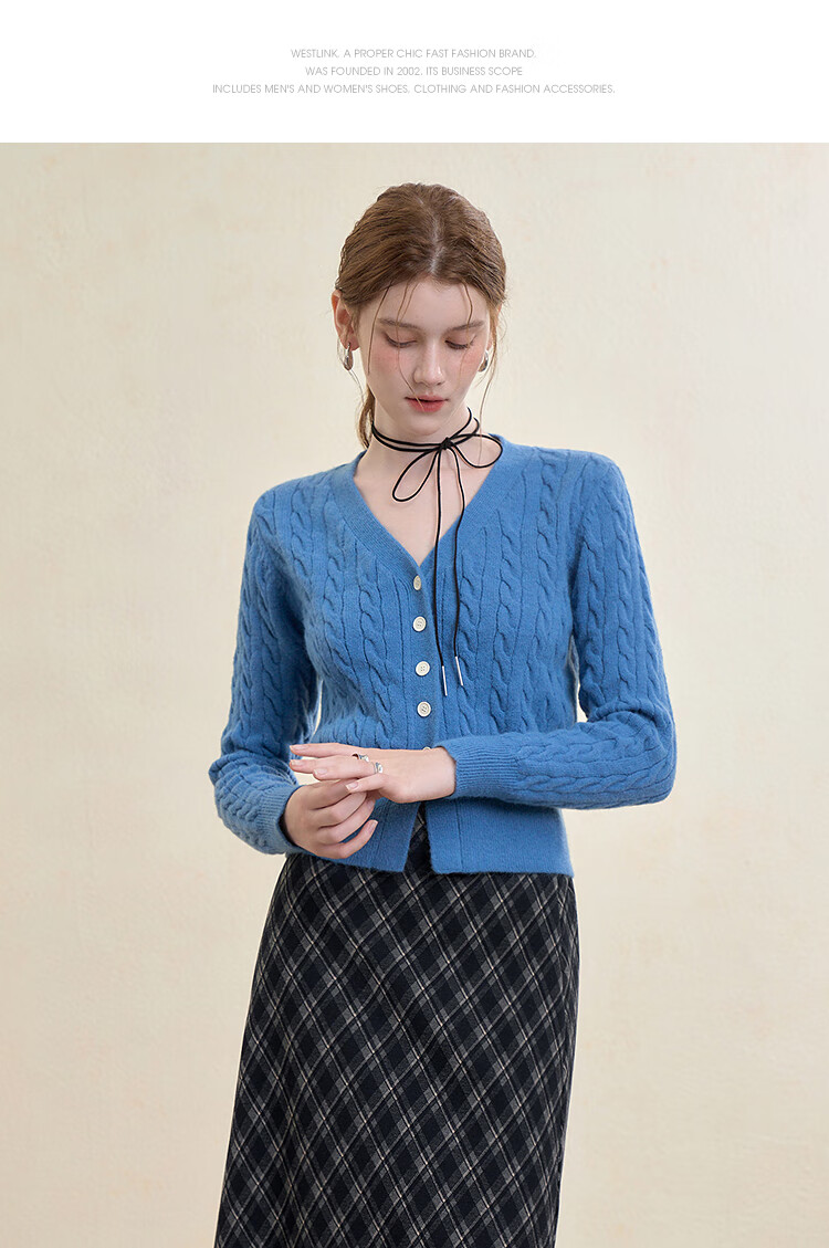 西遇(Westlink)法式复古绞花V领针织衫女秋季新款收腰显瘦短款毛衣外套 蓝色 (预售10月13日) S (155)
