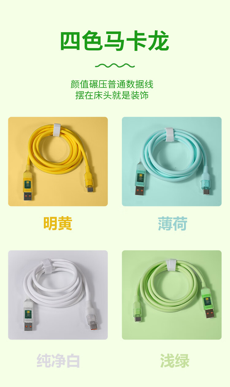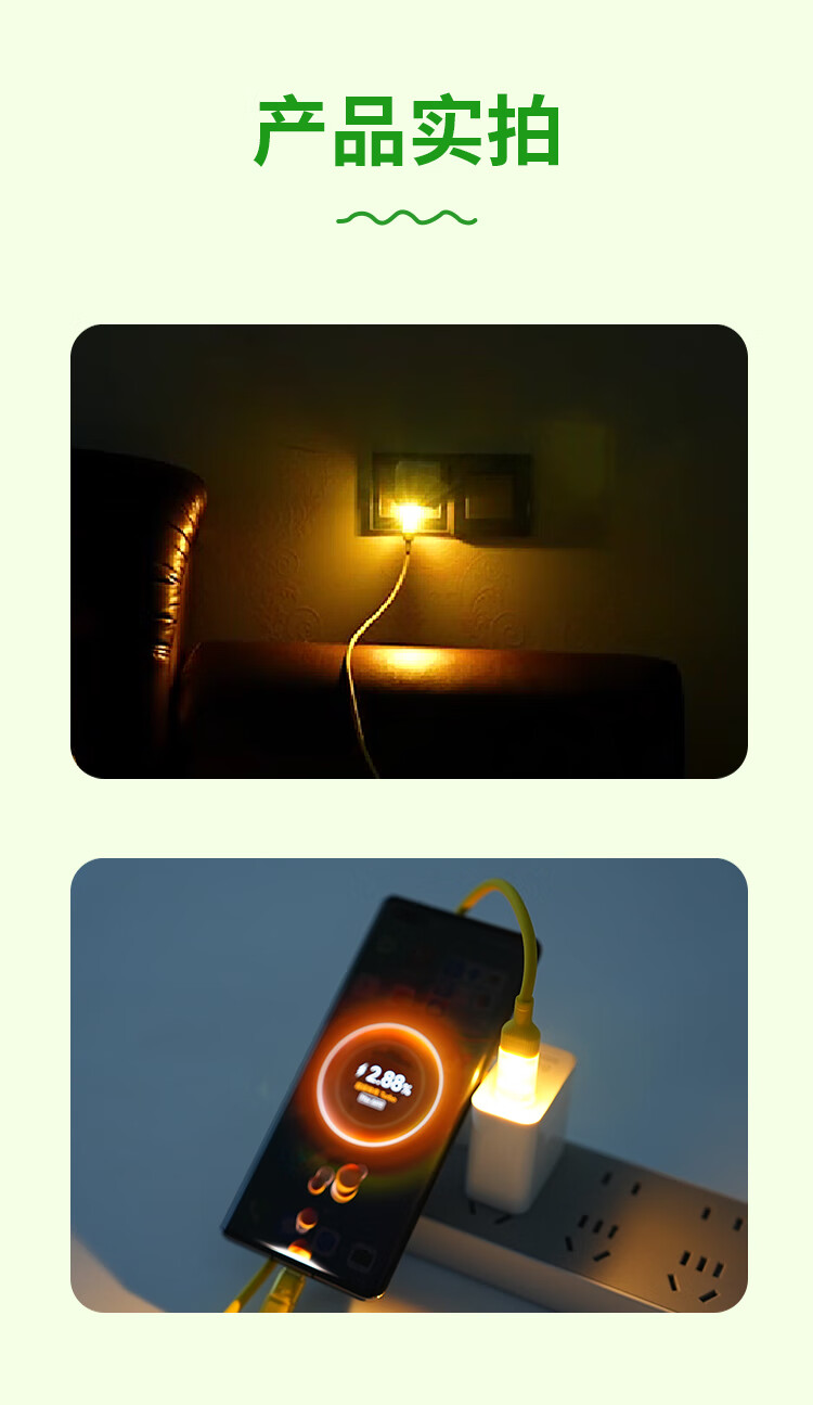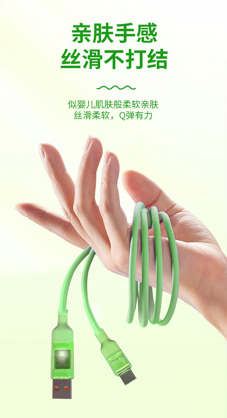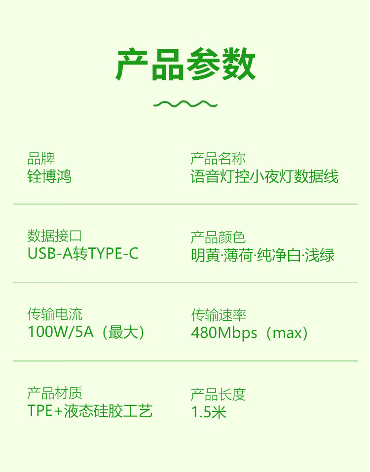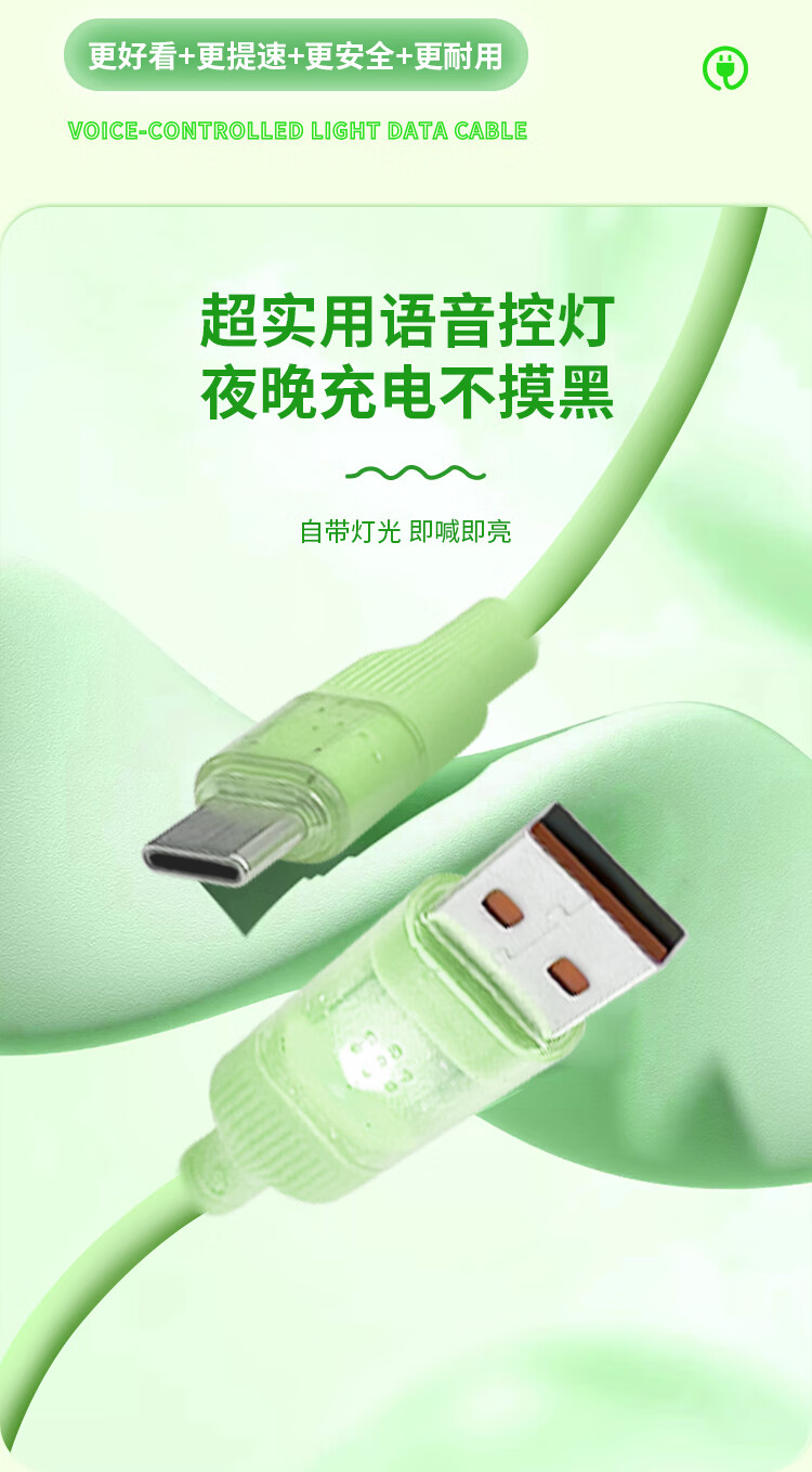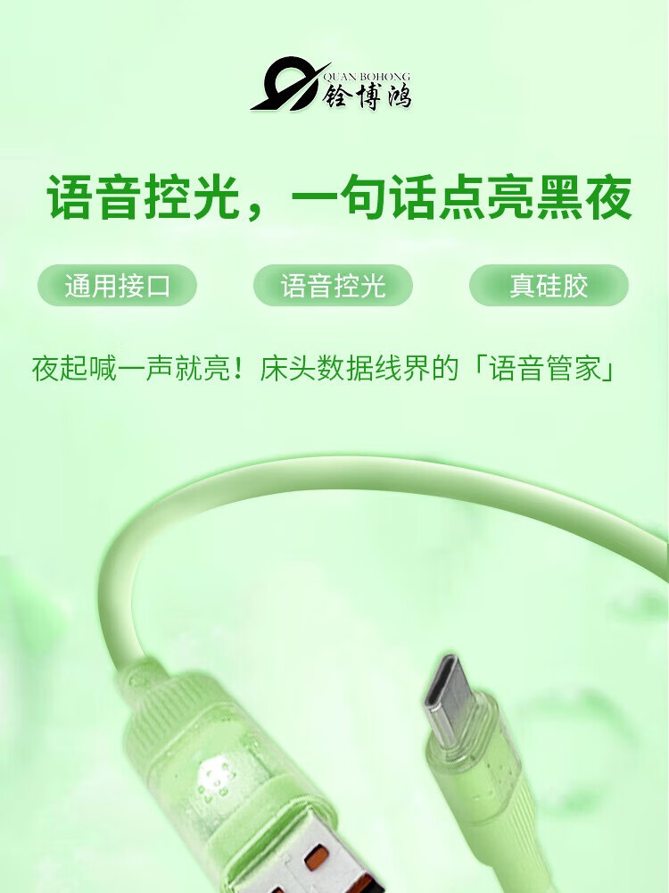 铨博鸿语音控灯小夜灯100W快充1.5米数据线USBA - C充电线 液态硅胶安卓智能手机平板电脑通用语音照明 薄荷色/华为充电线/语音亮灯+100W 快充