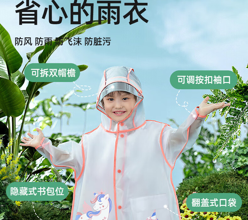 贝肽斯儿童雨衣防水防湿大帽檐雨披带书包位卡通男女童幼儿园上学专用 独角兽【加厚16丝+按扣+双帽檐】 M