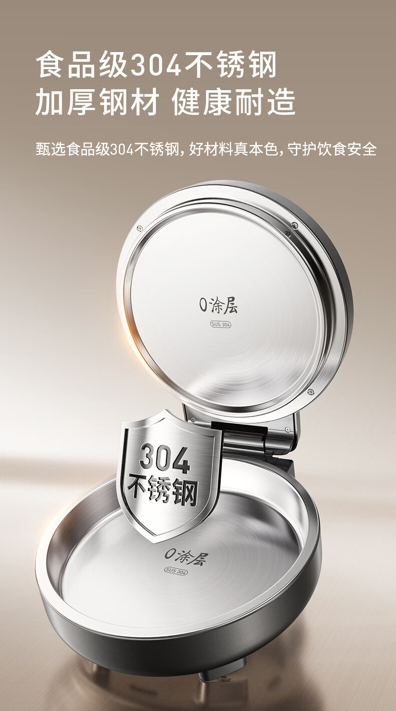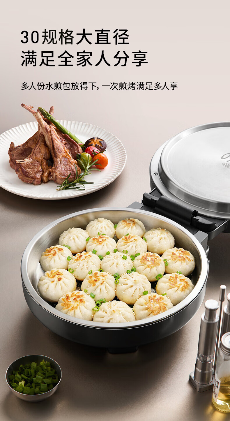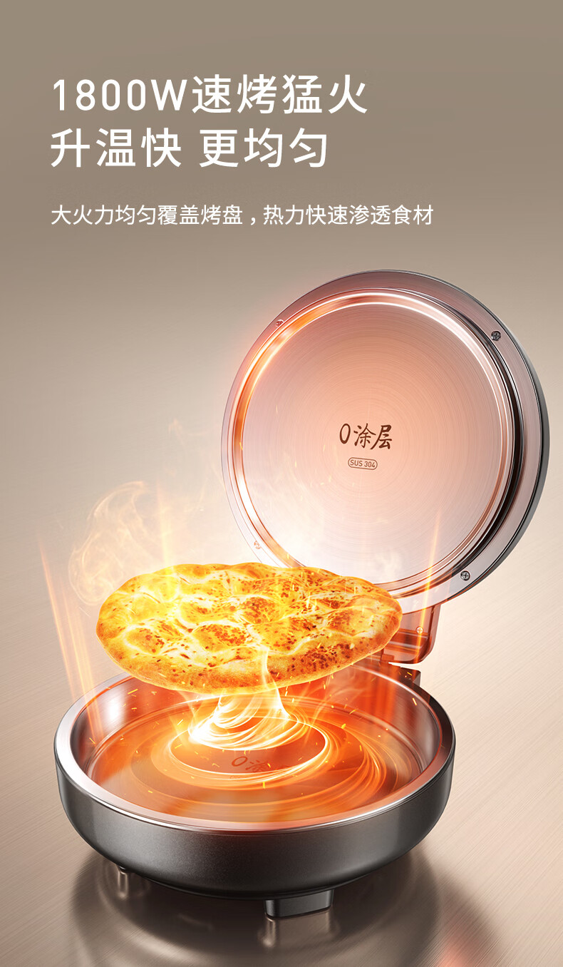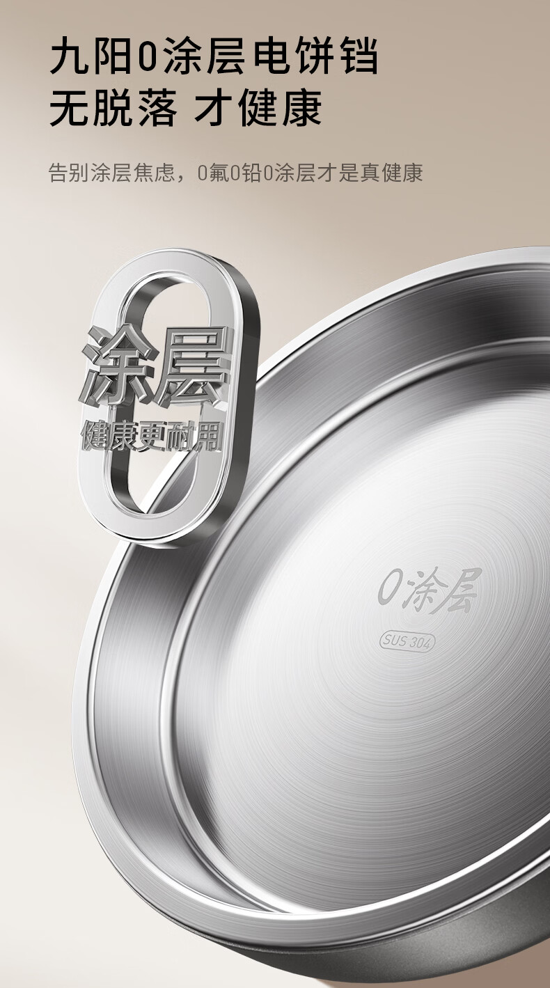九阳电饼铛不锈钢家用0涂层烙饼锅1800W双面加热煎饼锅烤肉锅小精钢多功能40mm加深加大早餐机无涂层锅 30JN02