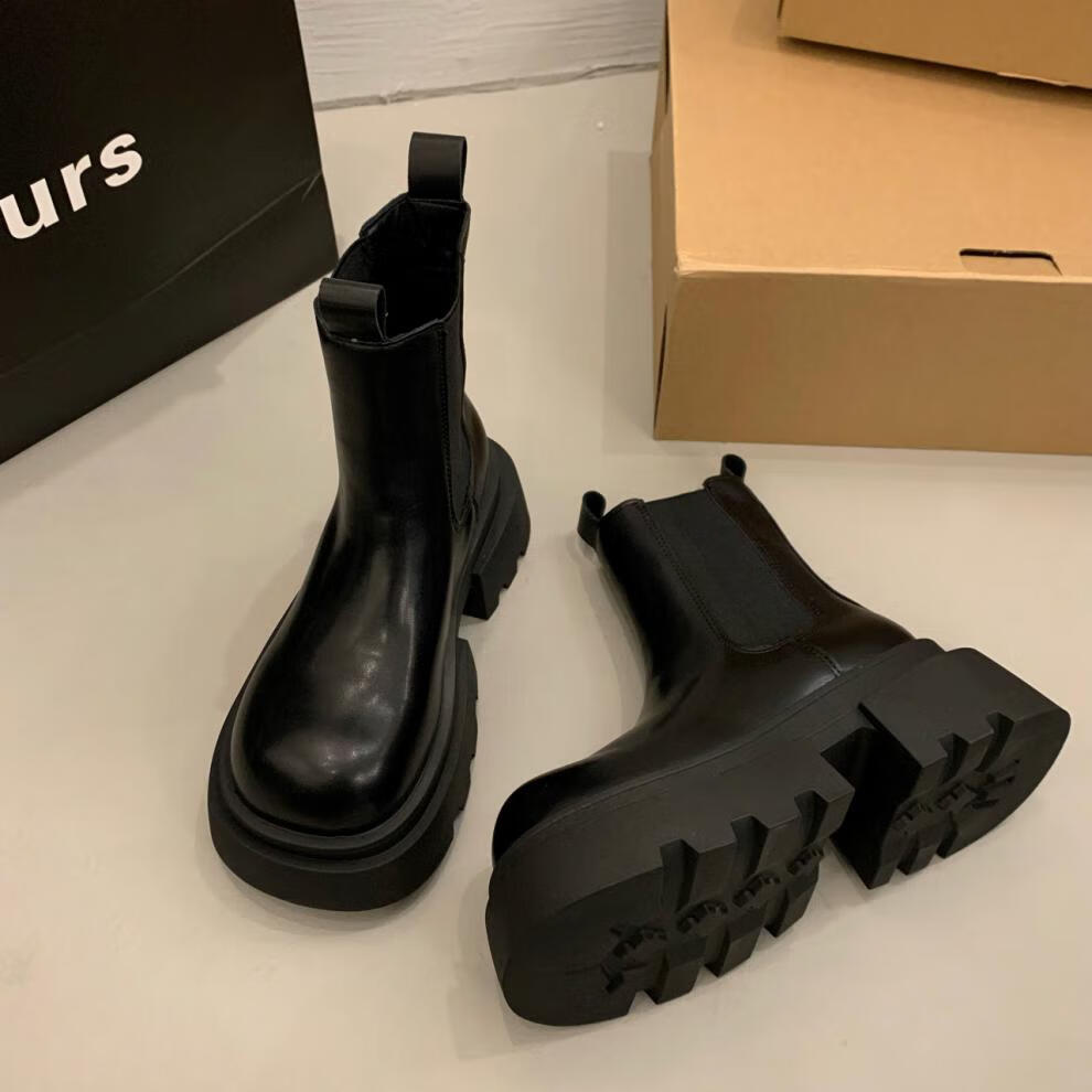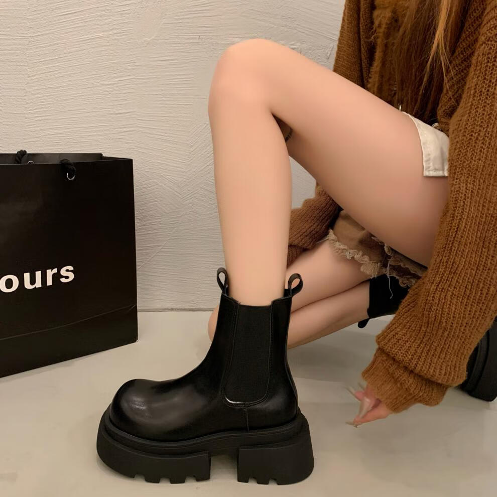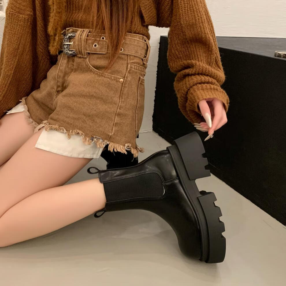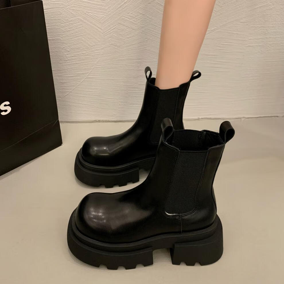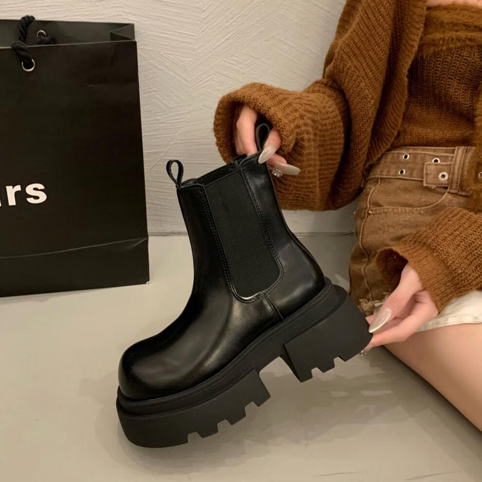 稻草人(MEXICAN)增高厚底马丁靴女2026秋冬新款小个子英伦风烟筒靴加绒切尔西短靴 黑色【专柜版】 【用料升级质保180天】 35