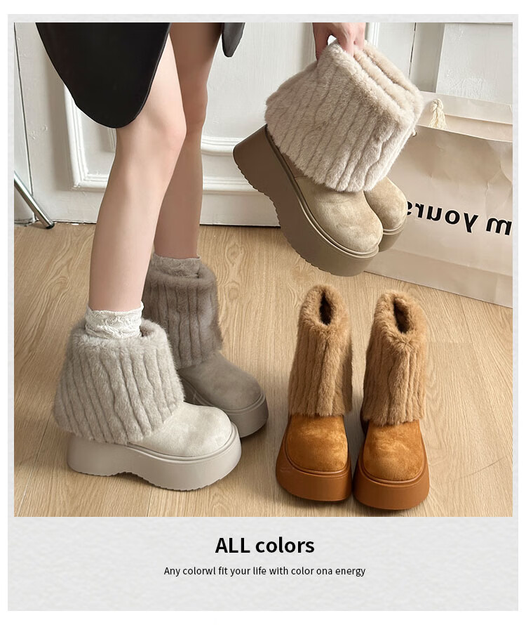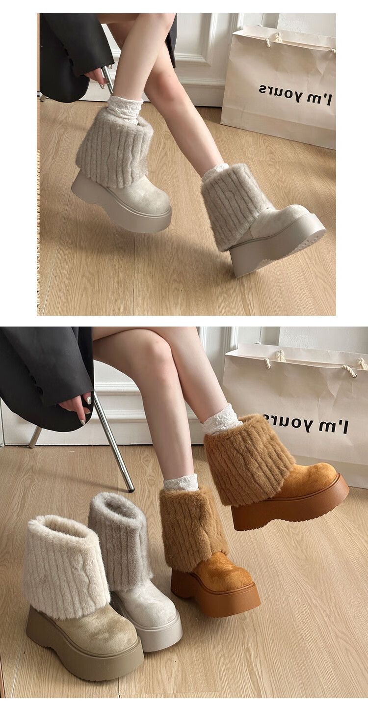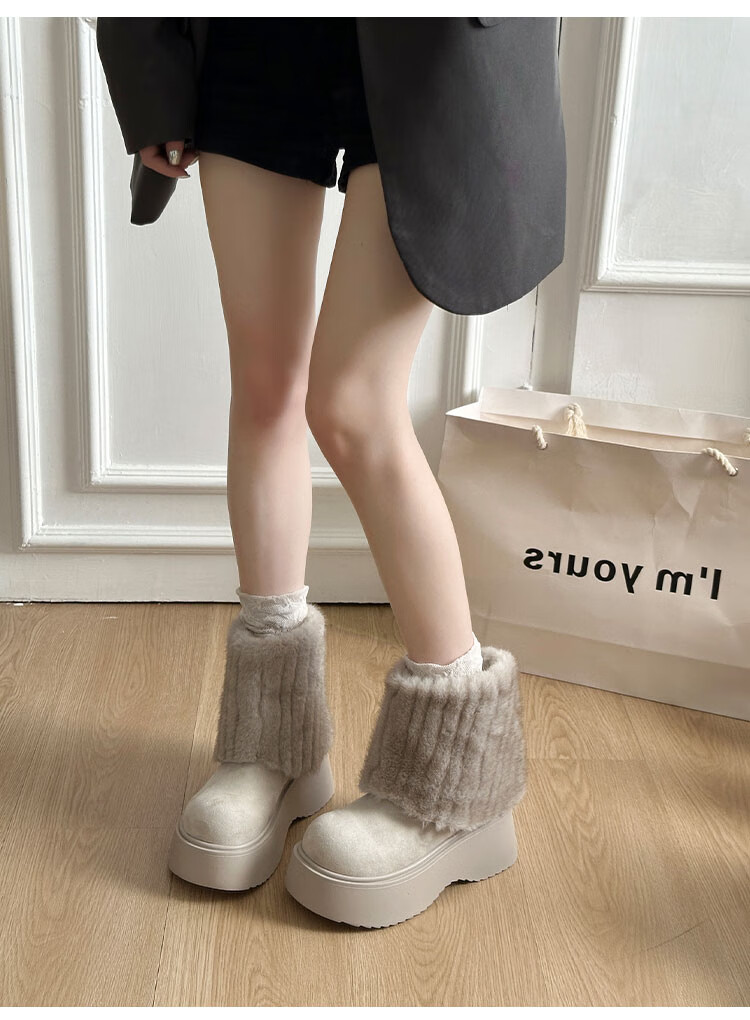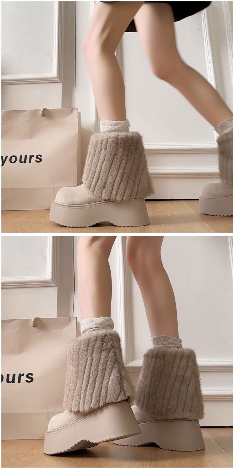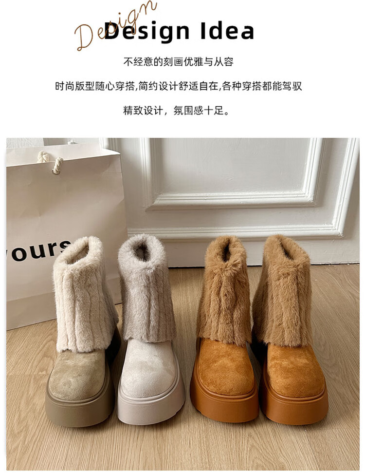 稻草人(MEXICAN)真皮版厚底冰岛雪地靴女秋冬季新款棉鞋加绒加厚毛毛短靴裤管靴 卡其色【精品专柜版】 39