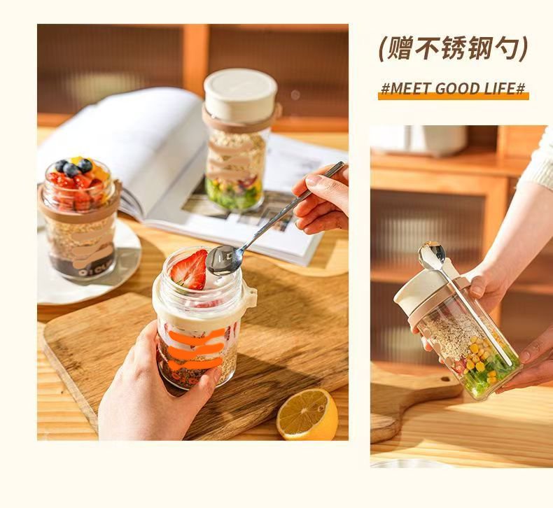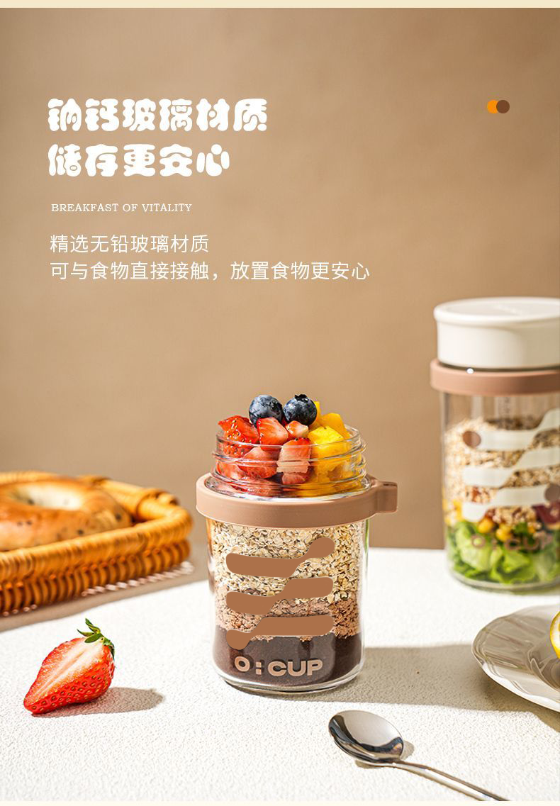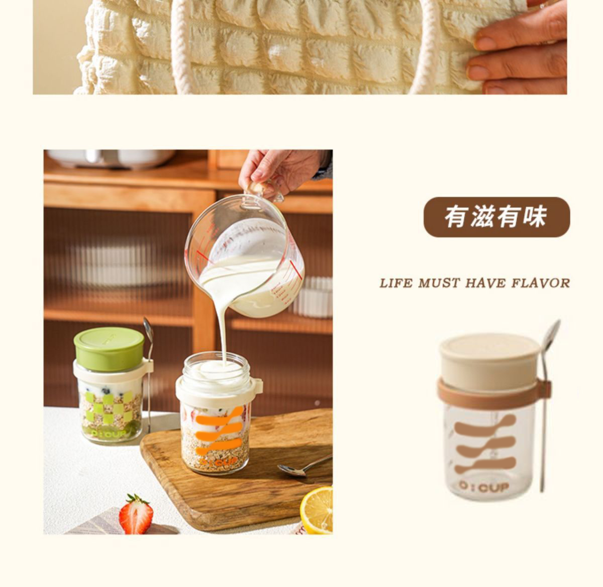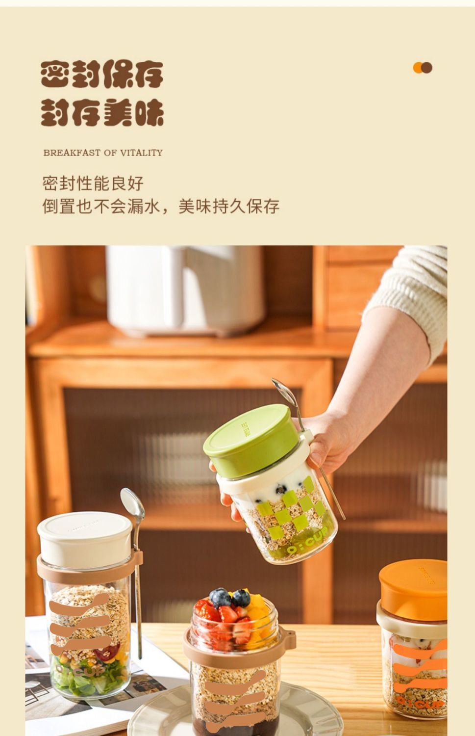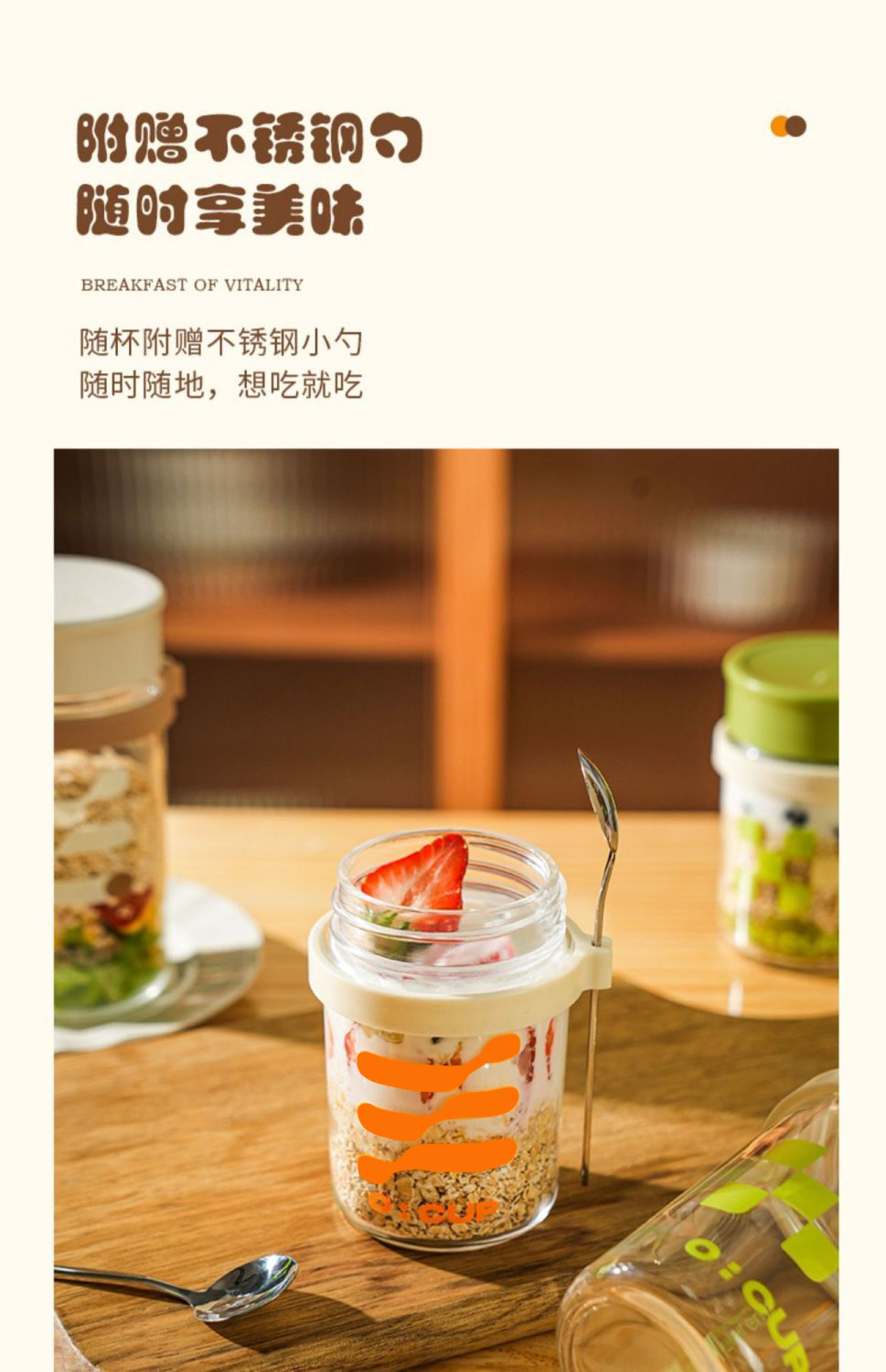 隔夜燕麦杯早餐杯玻璃杯密封便携带盖带勺子麦片杯梅森酸奶杯子 白色350ml【送勺子】单只装