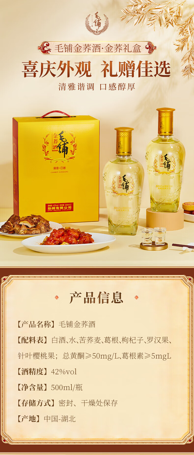 毛铺金荞酒礼盒装 42度 苦荞酒 500ml*2 送礼佳品 42度 500mL 2瓶 礼盒装