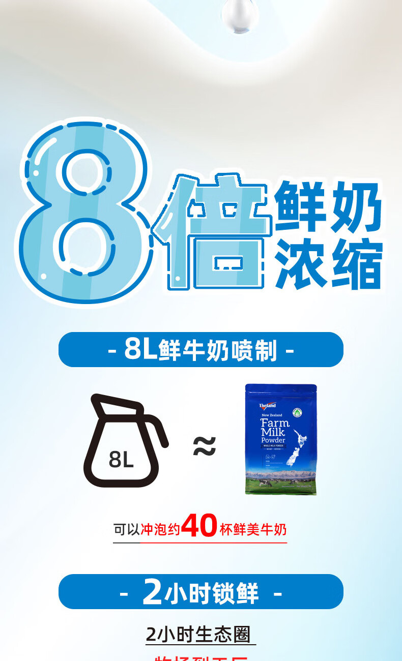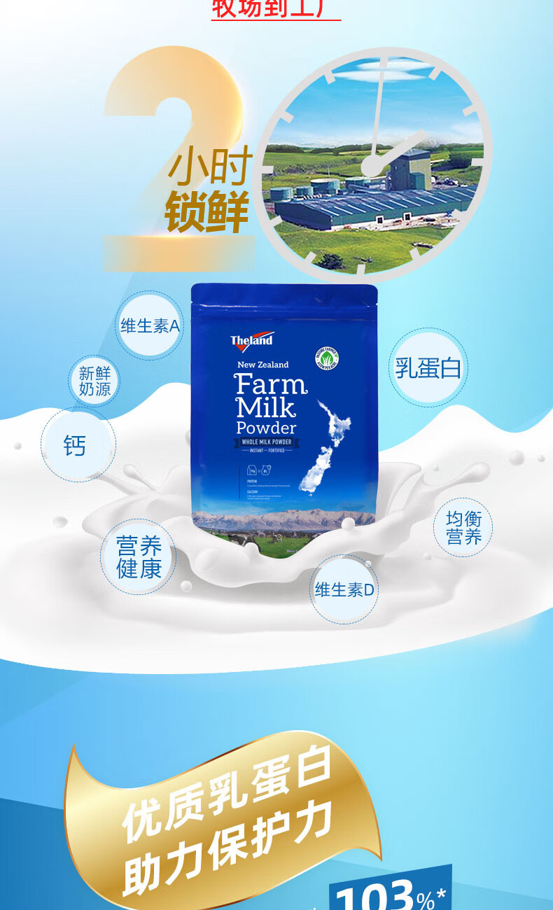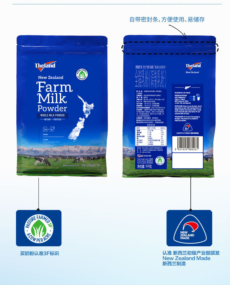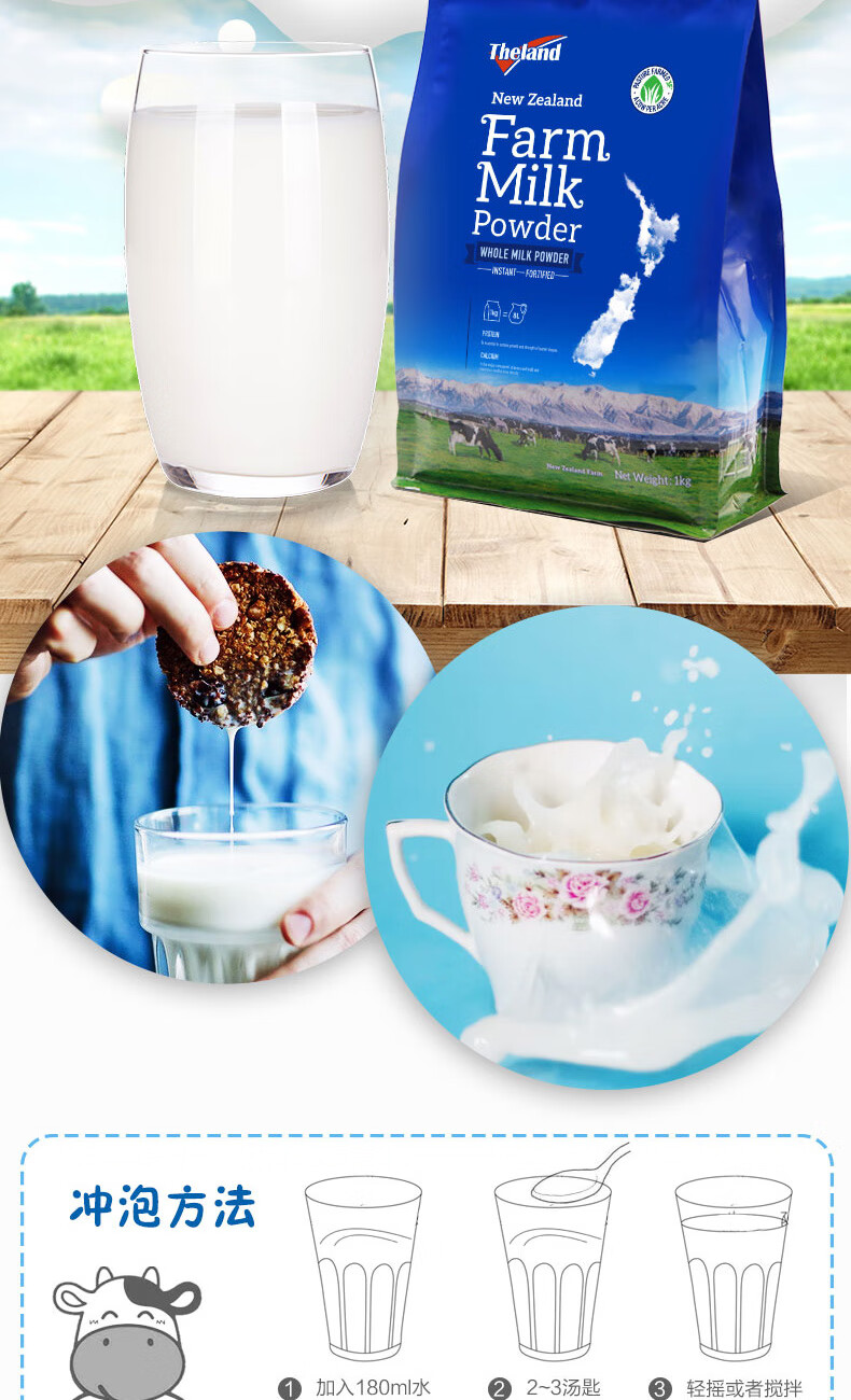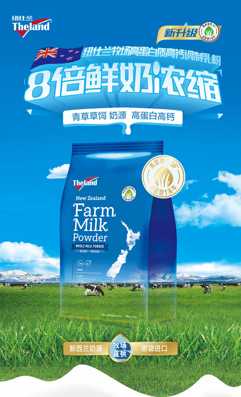 纽仕兰(Theland)官方正品 全脂牛奶粉 高钙高蛋白 1KG袋装 学生成人奶粉