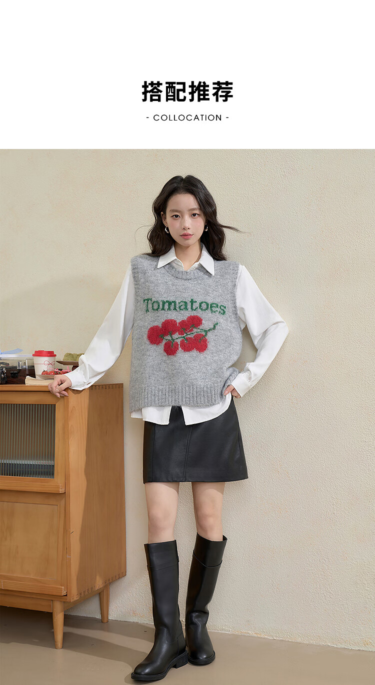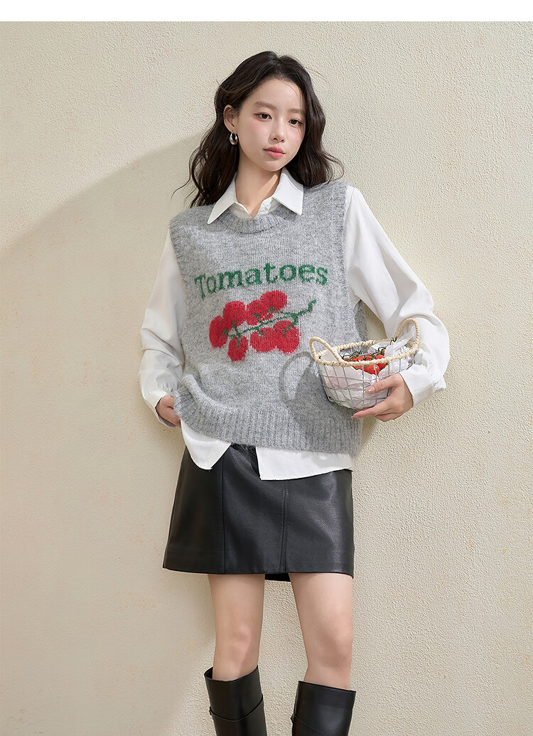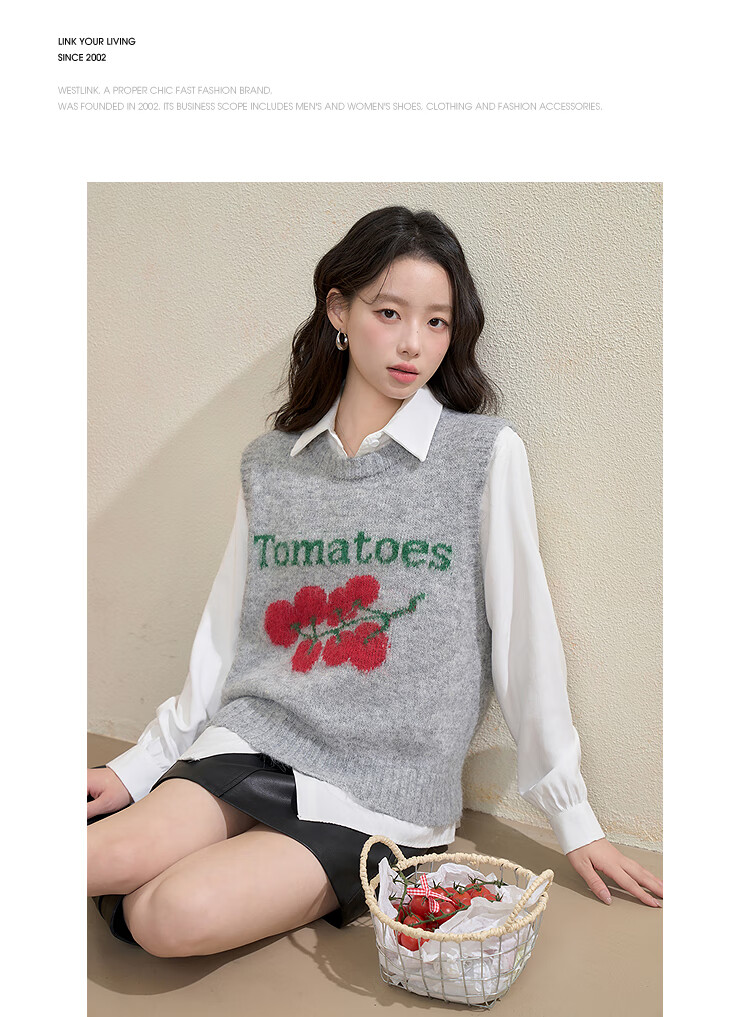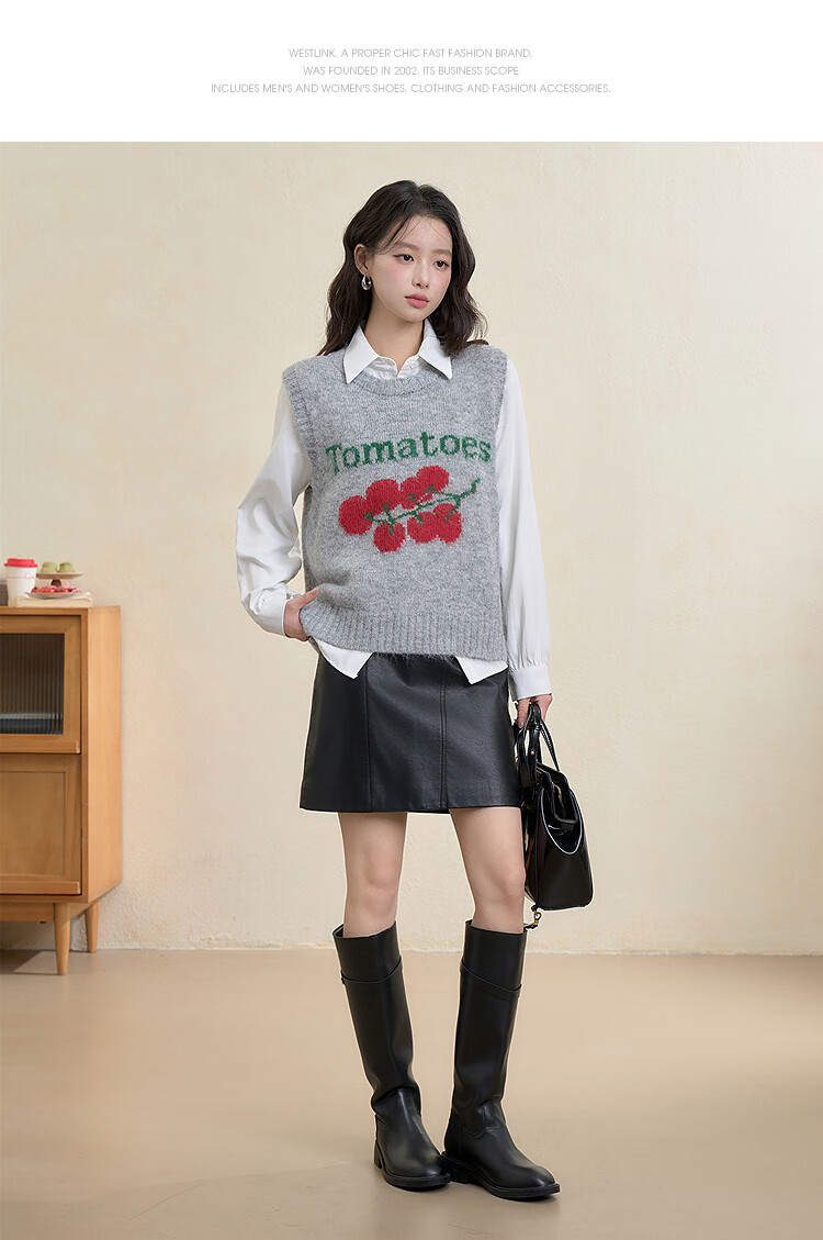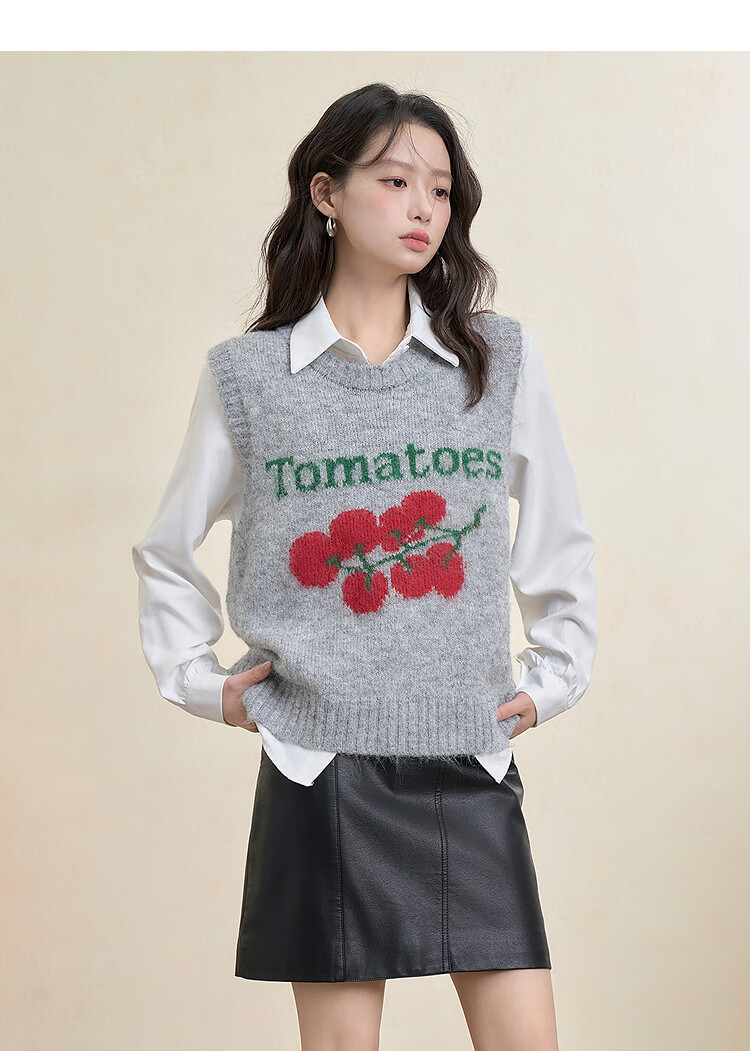 西遇(Westlink)西遇圆领宽松套头毛衣女2025年秋季新款叠穿印花无袖针织马甲背心 灰色 (预售15天) M (160)
