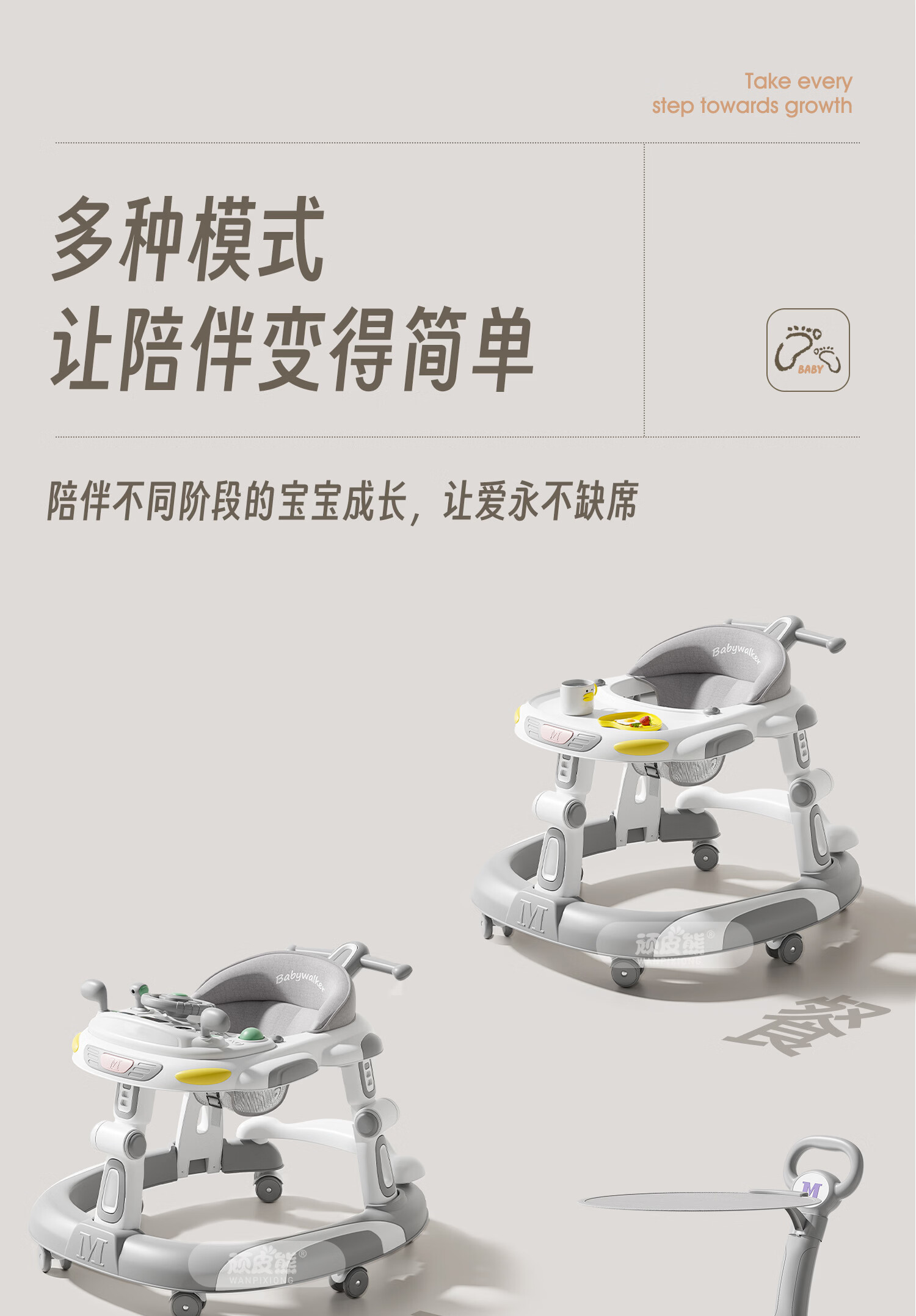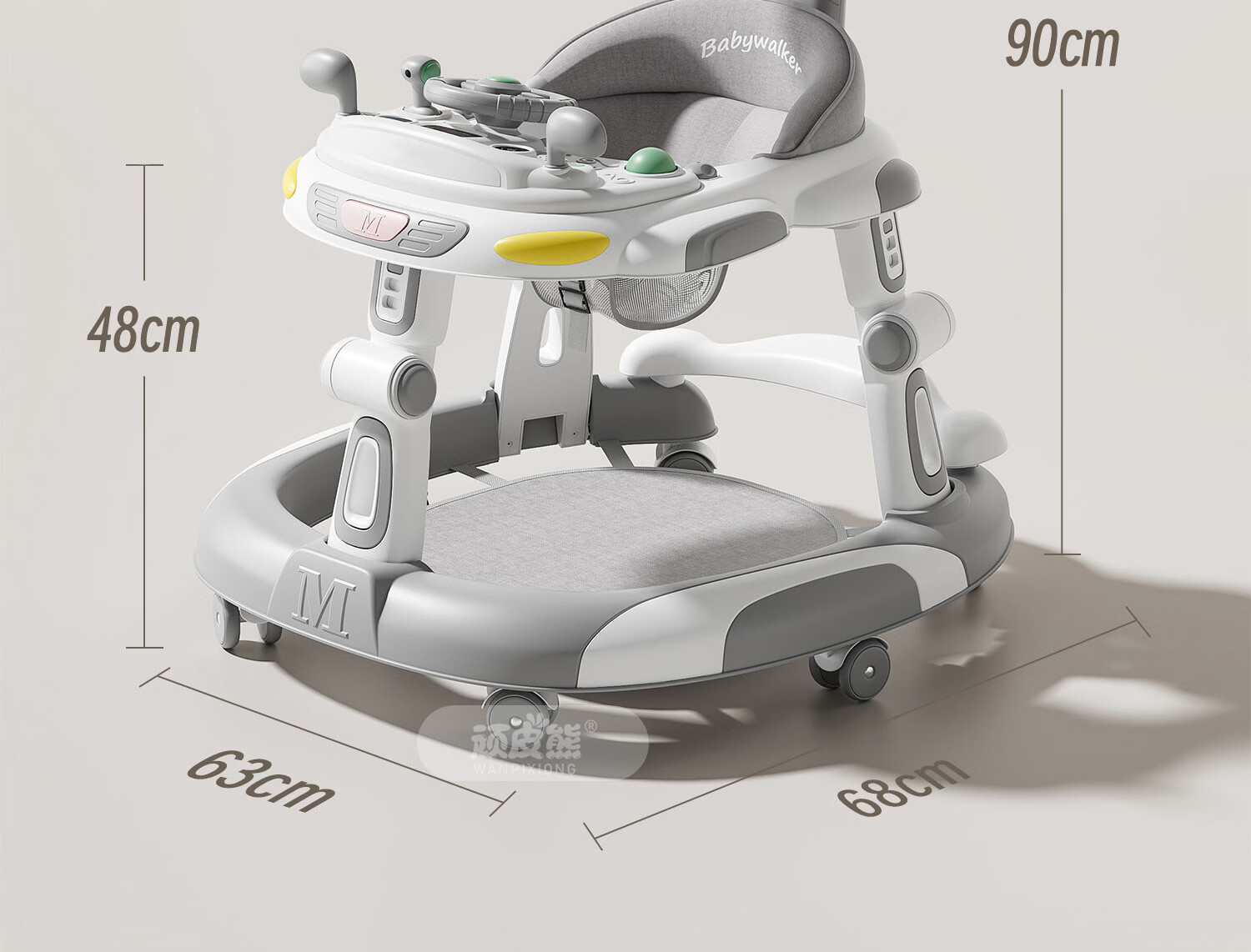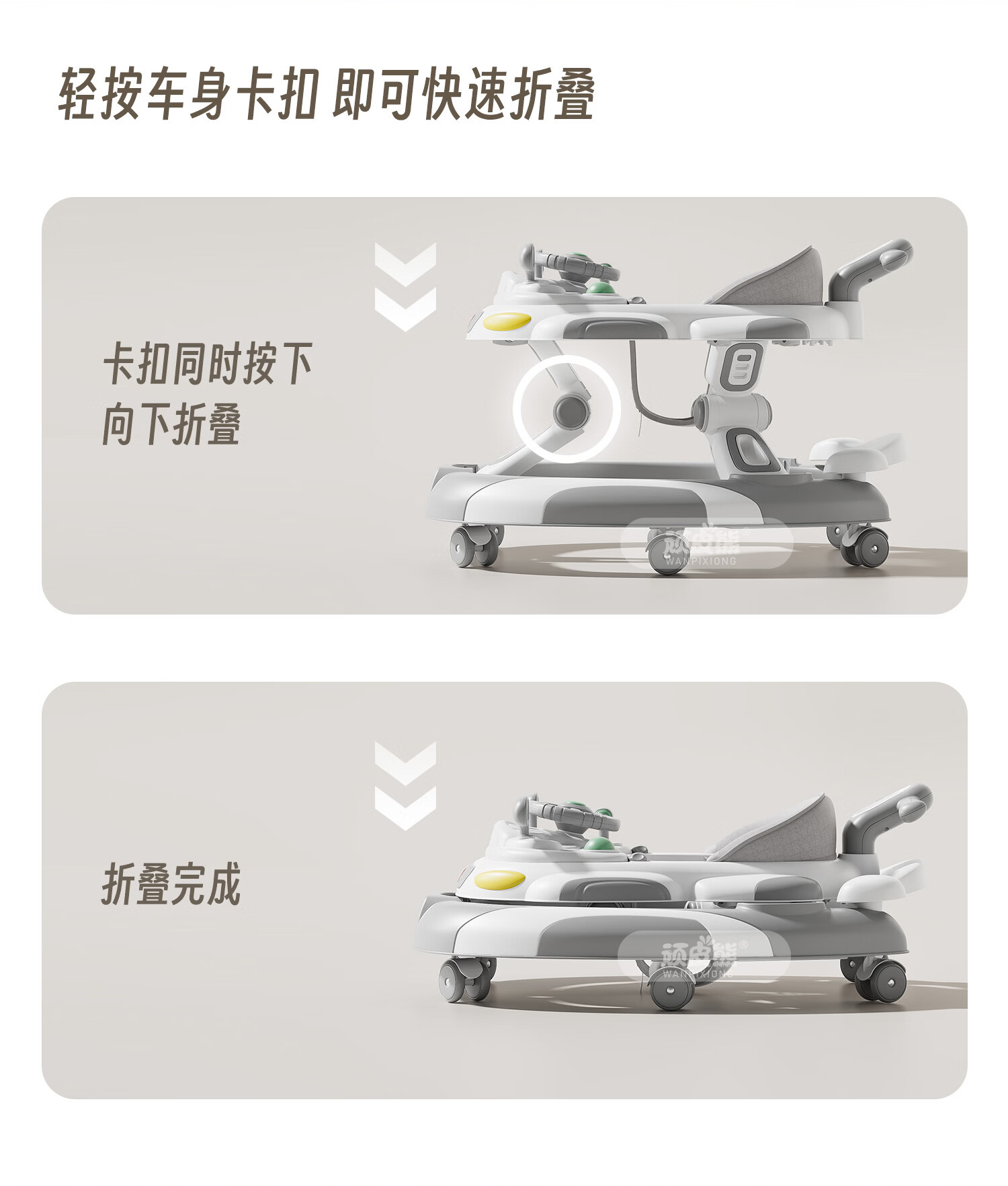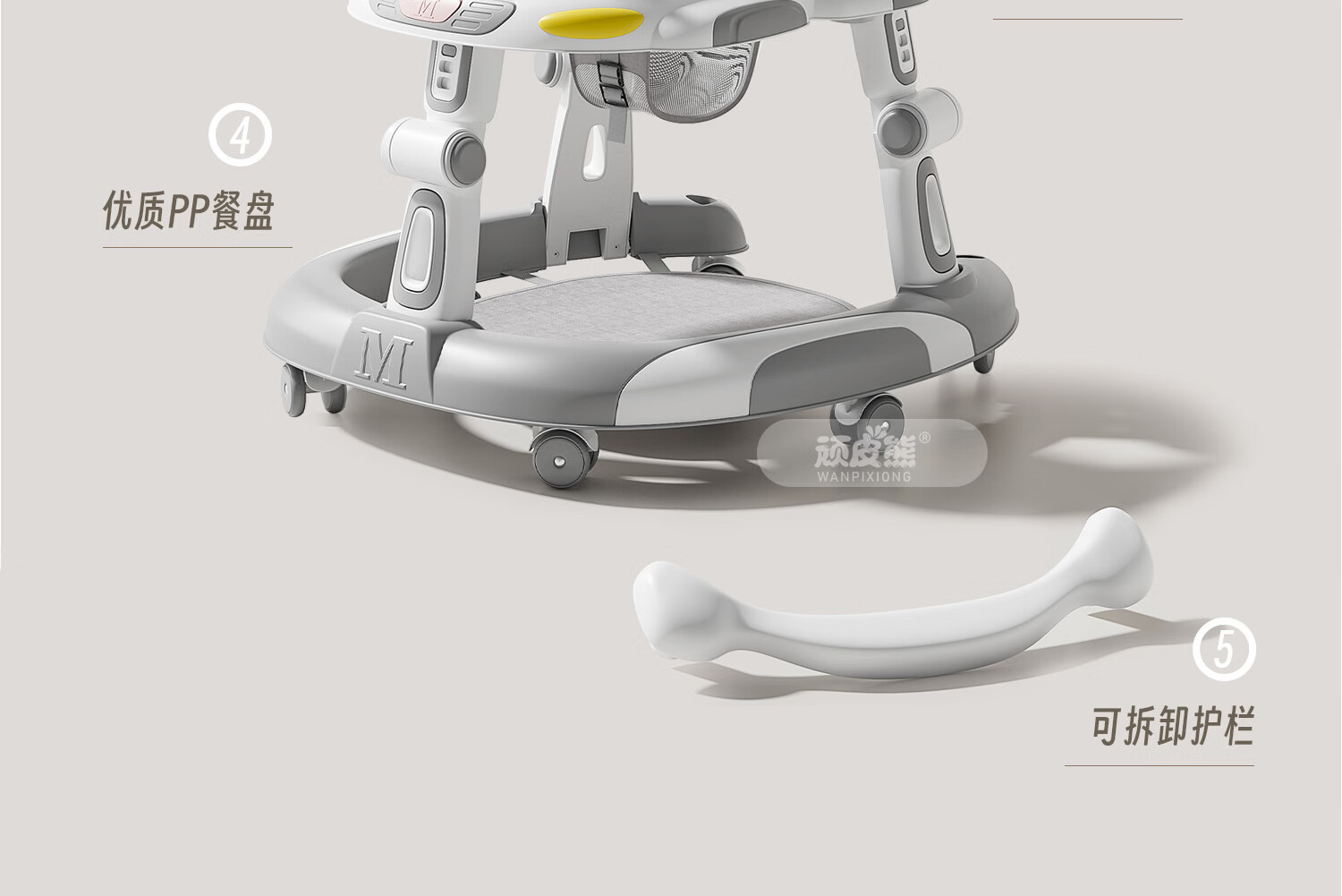 顽皮熊婴儿学步车新款多功能助步车宝宝学走路可推可坐可折叠防侧翻 612灰+餐盘+音乐+脚垫+双推把+棚