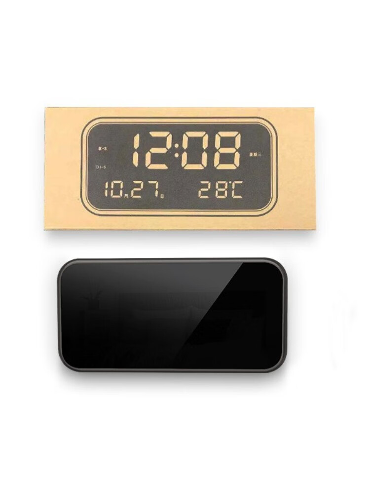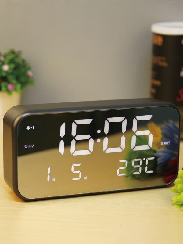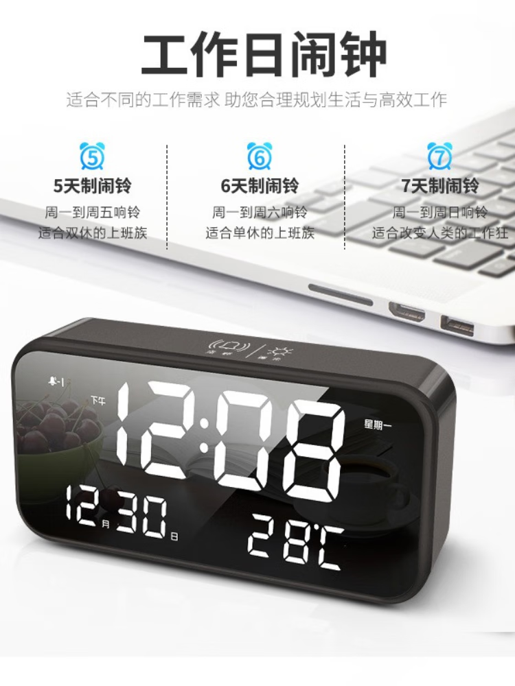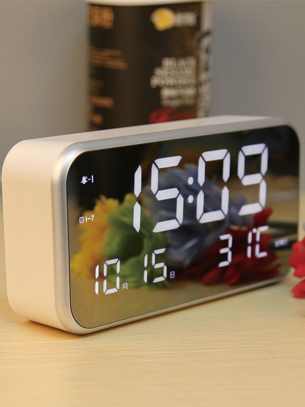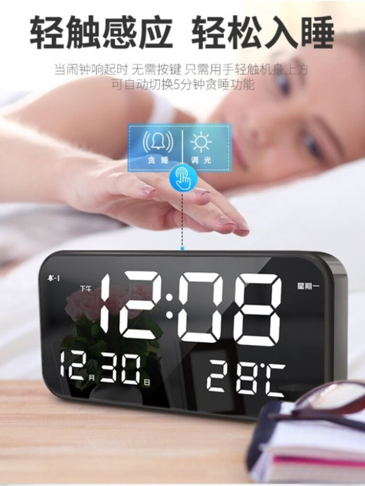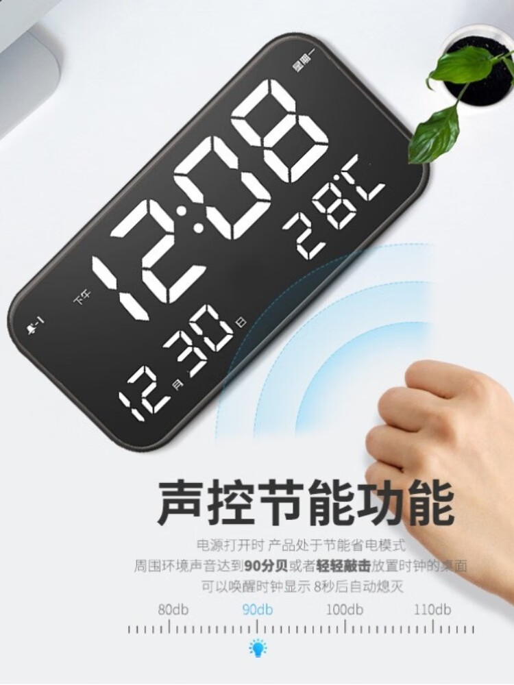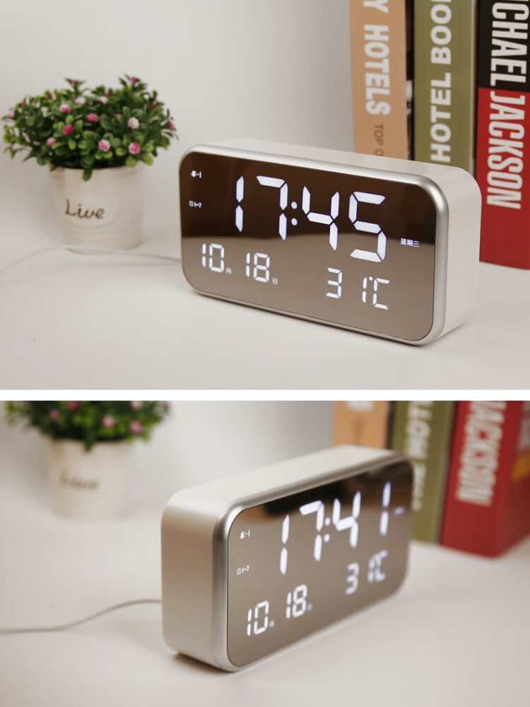 床头台钟大尺寸镜面时钟充电式音乐数字电子钟静音声控聪明闹钟 白色