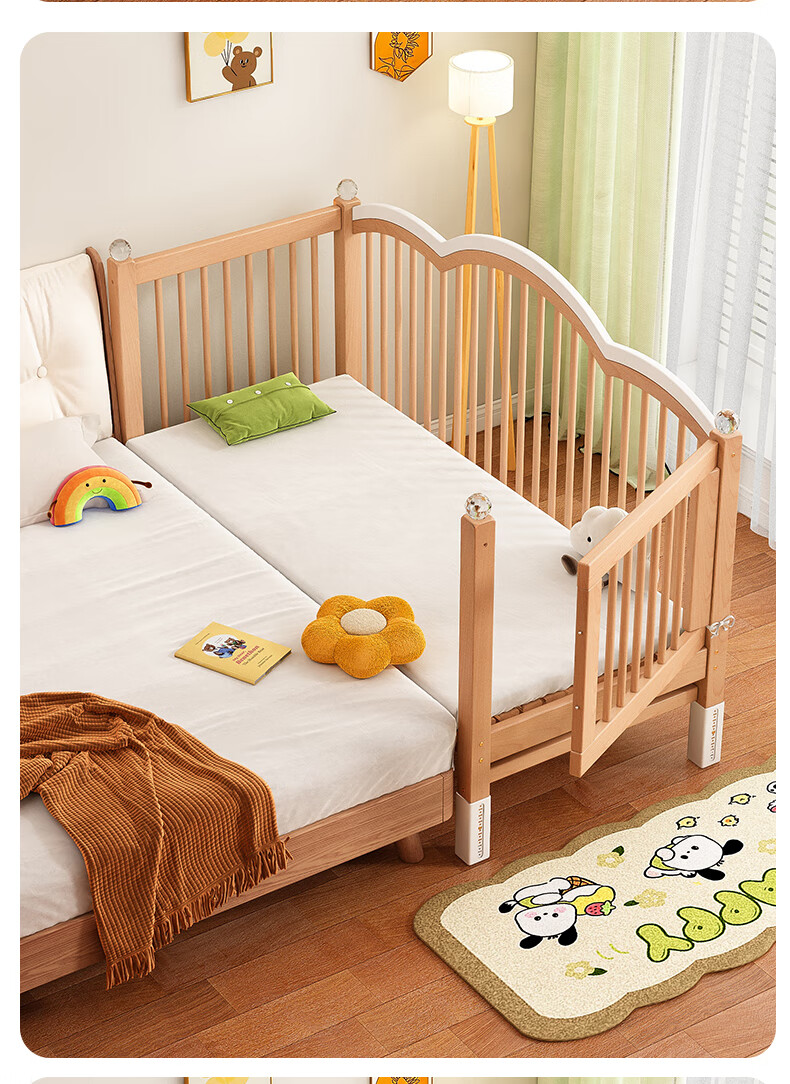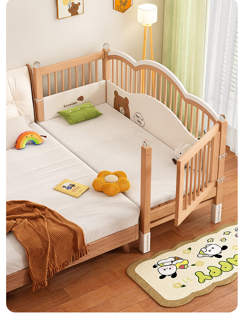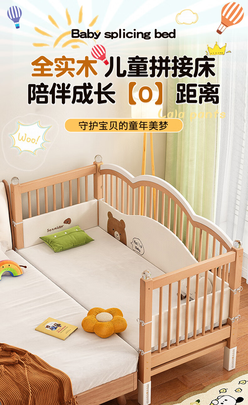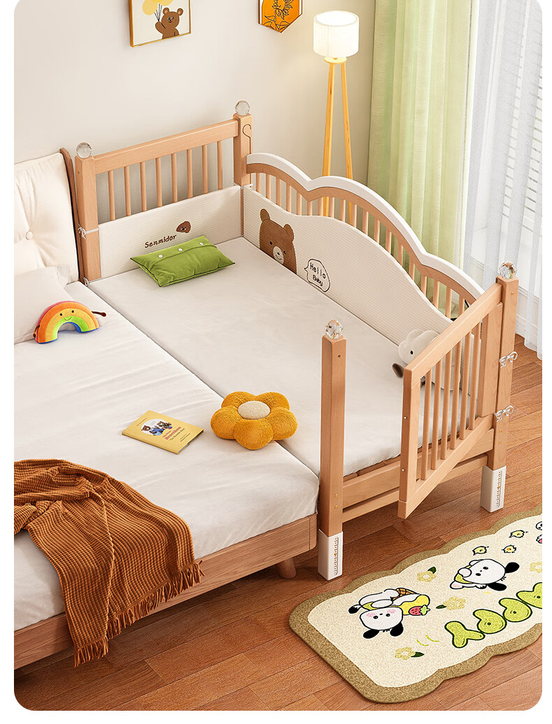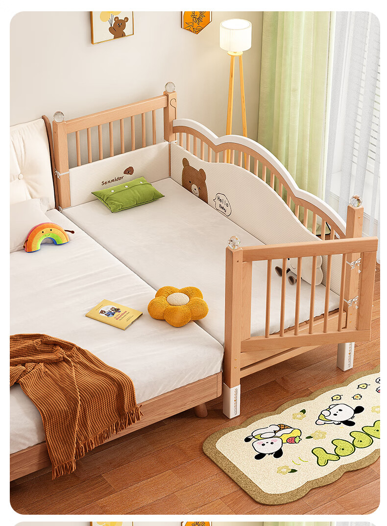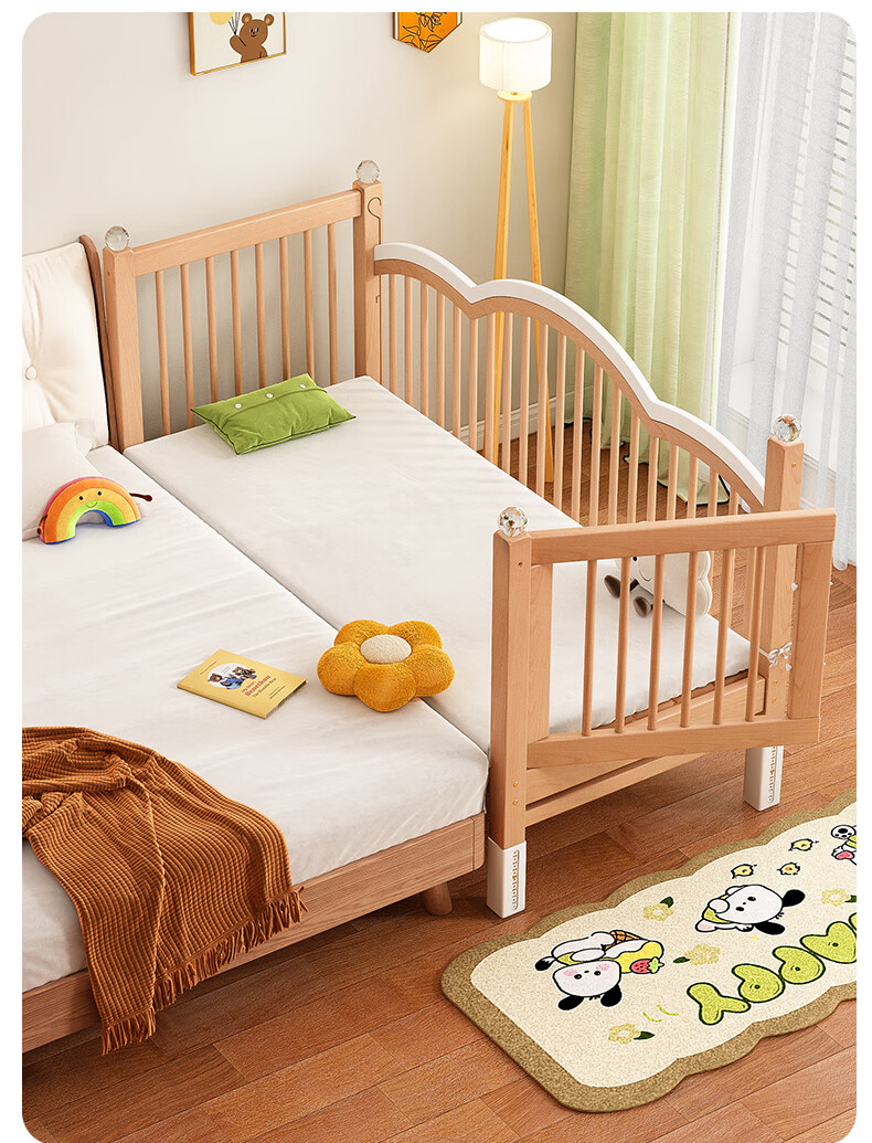 贝幸福榉木儿童拼接床实木婴儿床拼接大床可升降护栏加宽床边宝宝单人床 侧升降款+7cm空气纤维垫+床围 200*50cm【可升降】