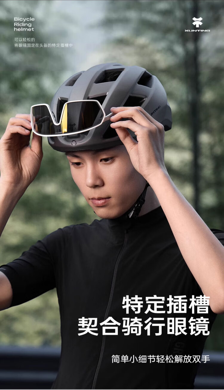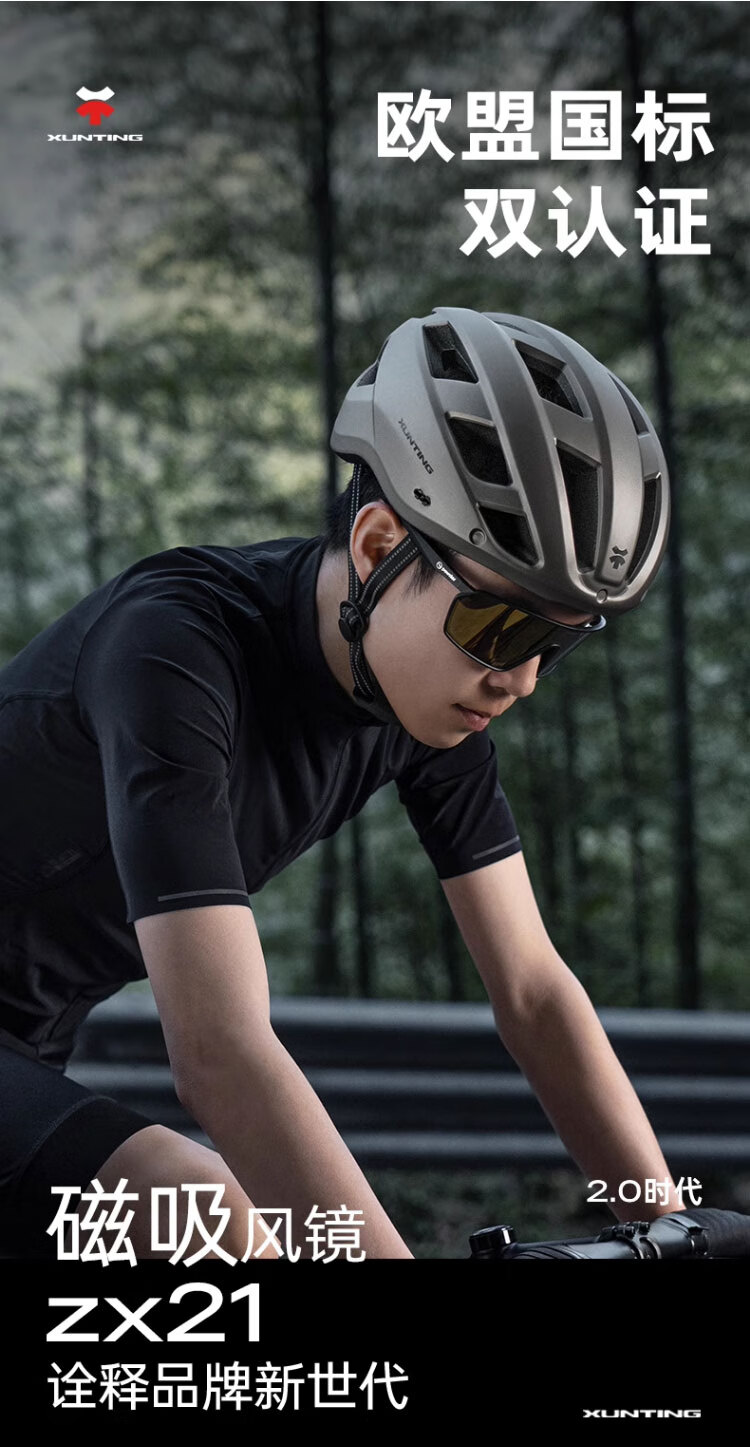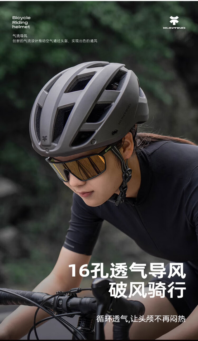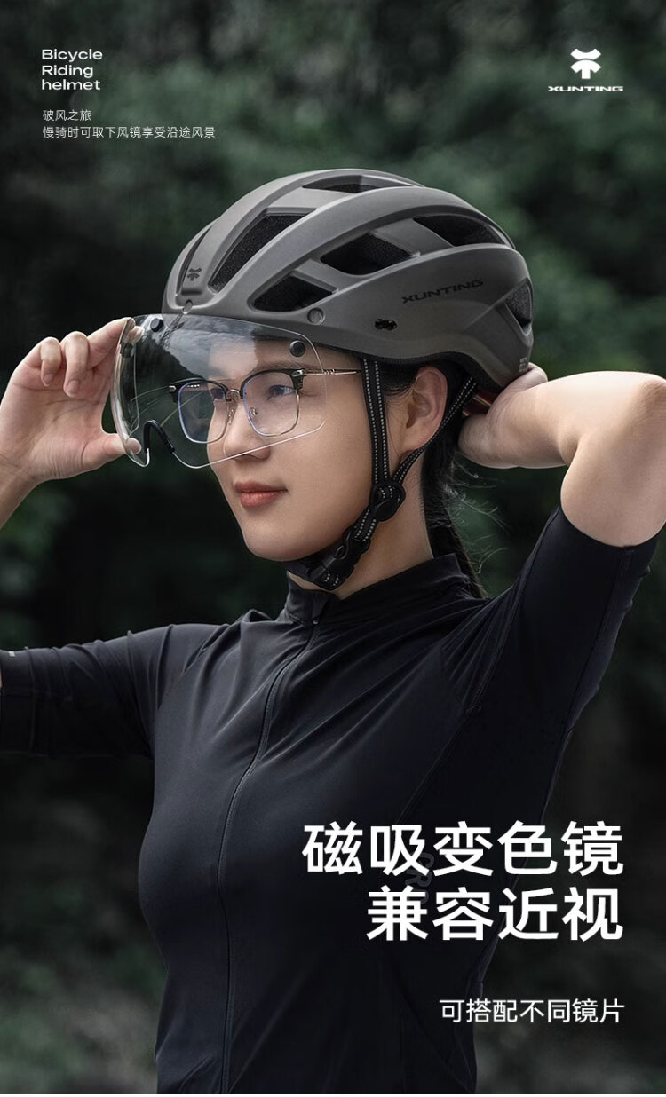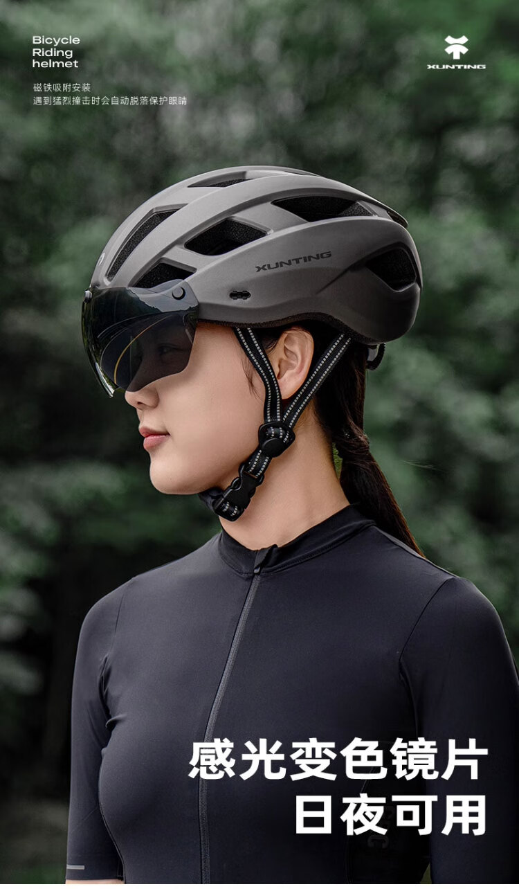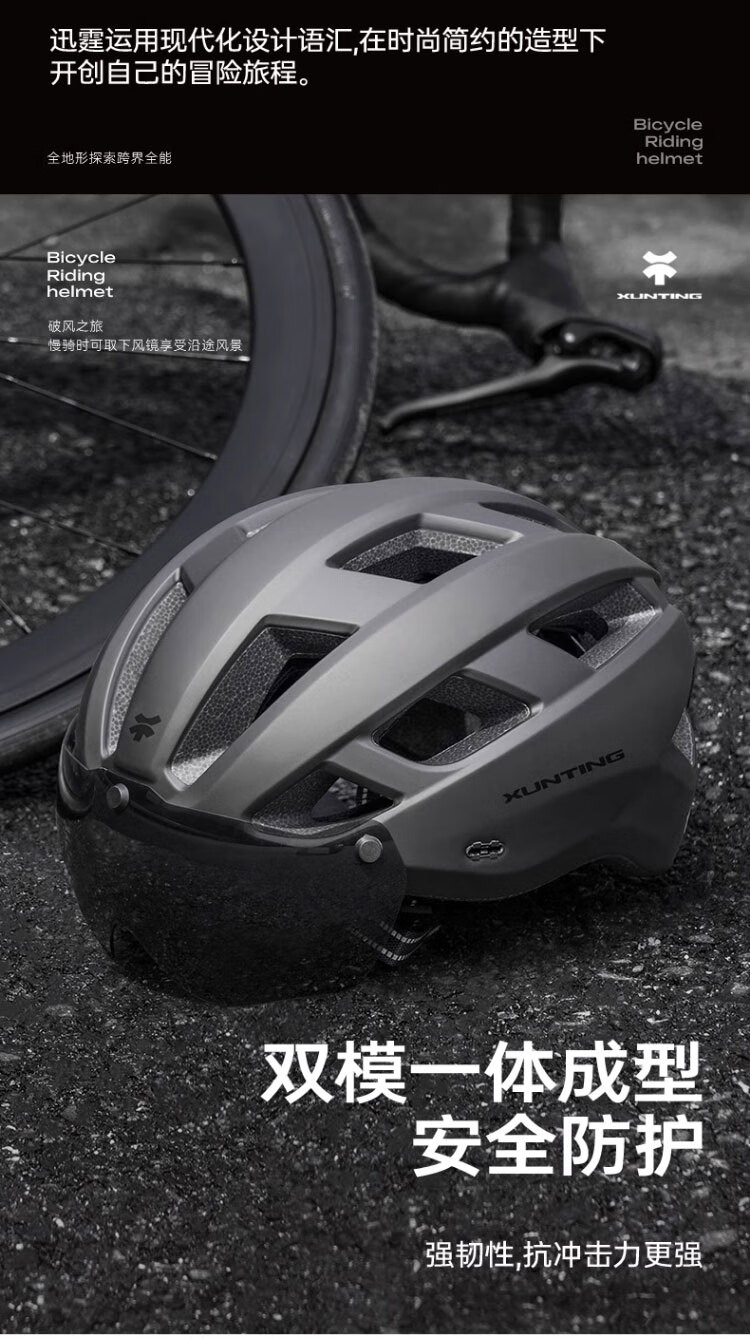 迅霆(XUNTING)骑行头盔自行车山地公路车男女夏季透气一体成型带风镜帽檐安全帽 矿石黑【帽檐+茶镜】