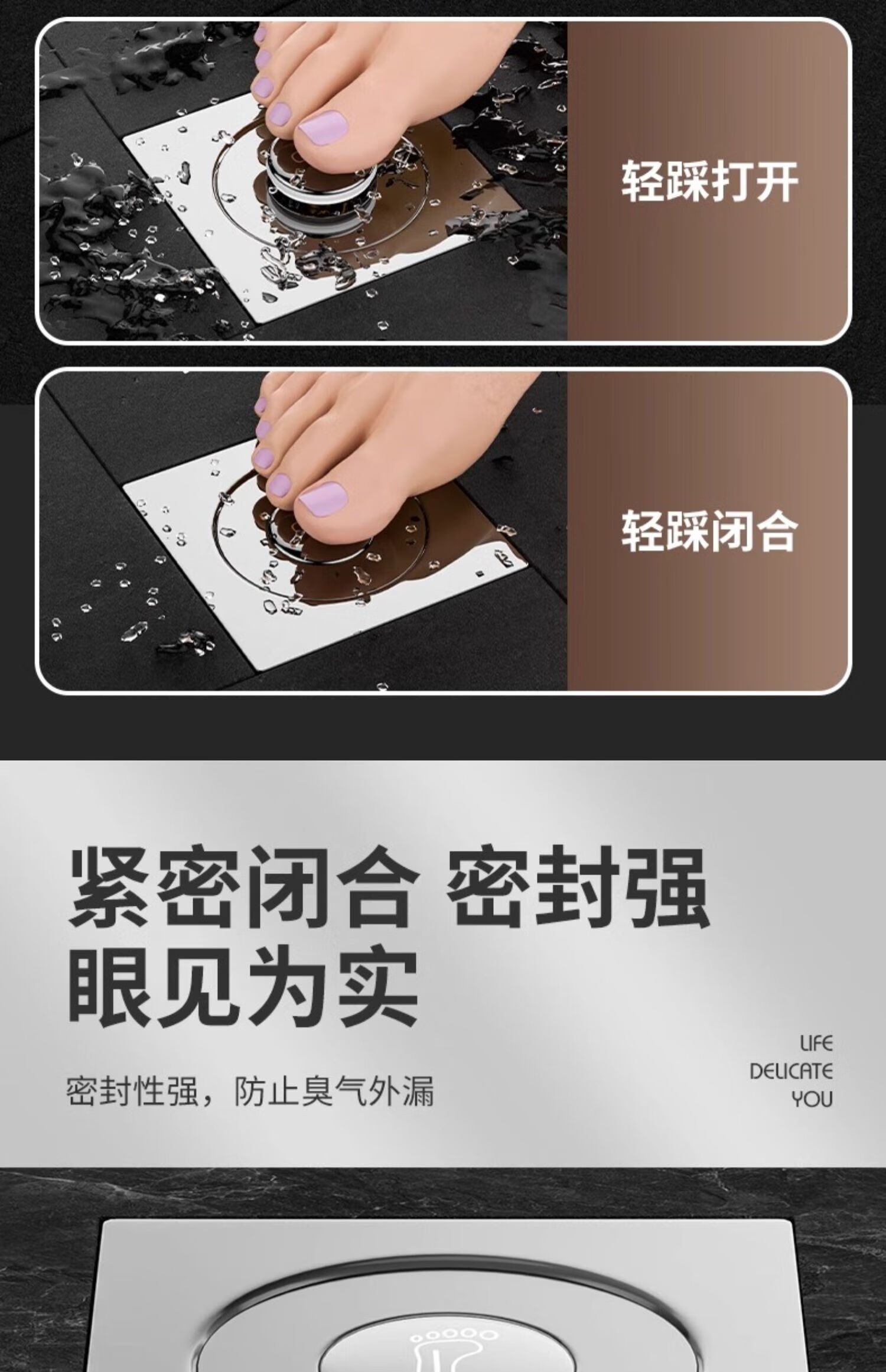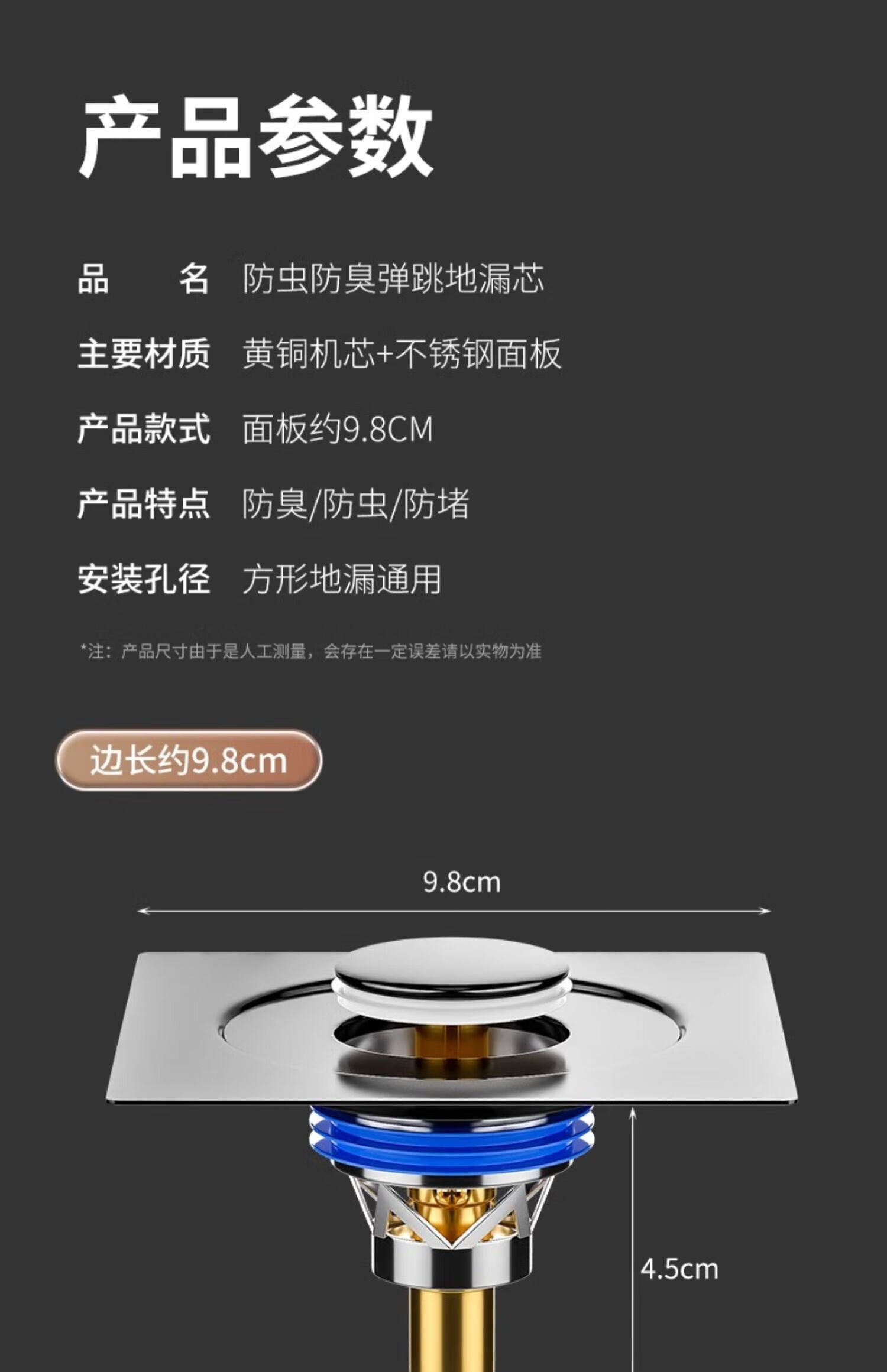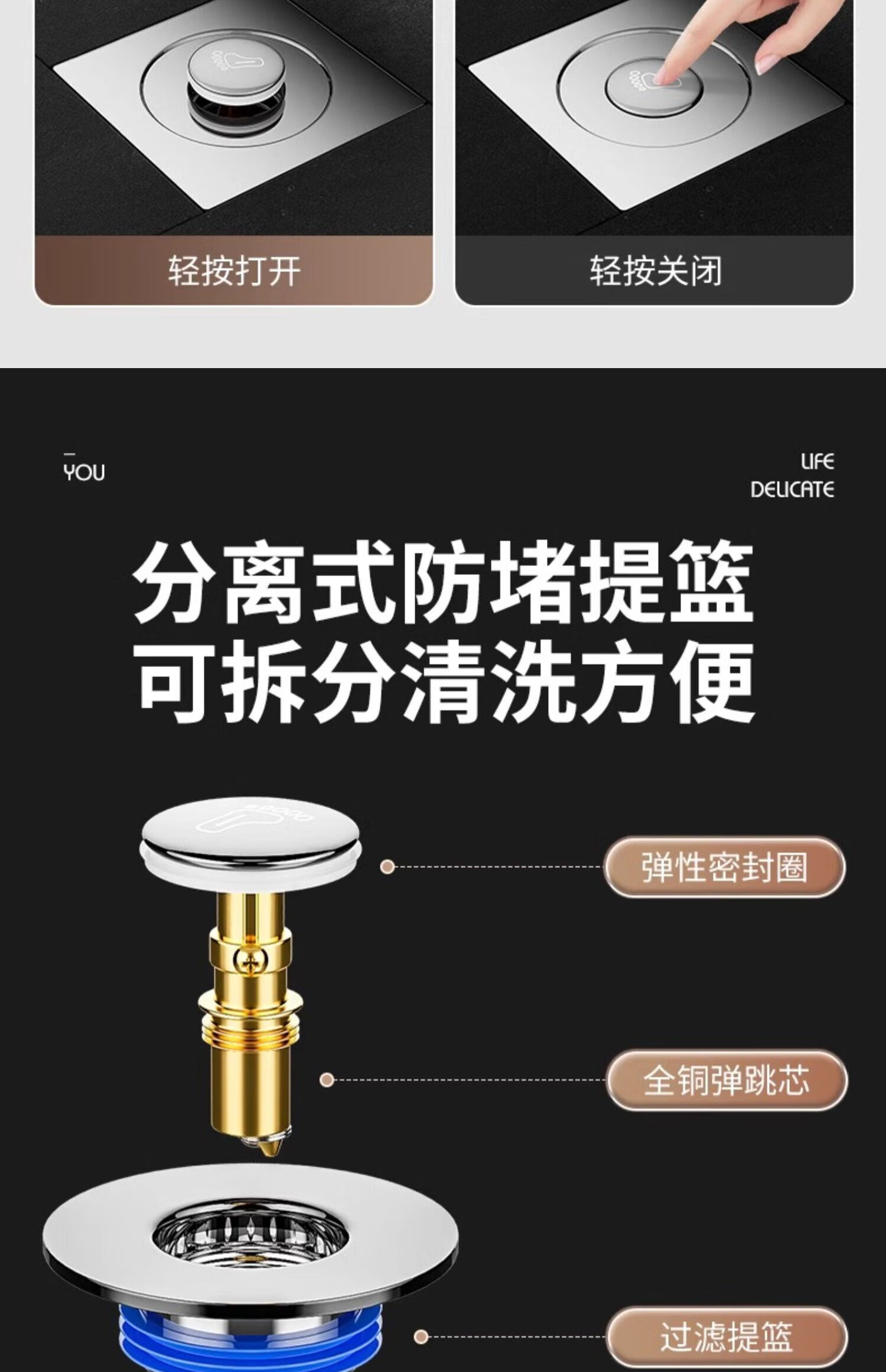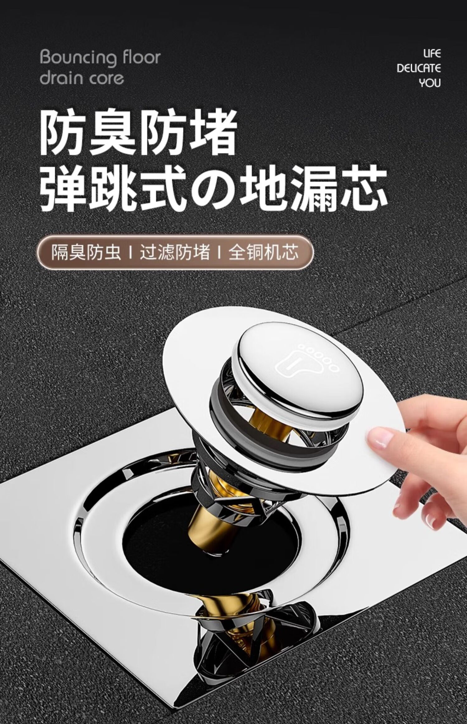 首力弹跳地漏防臭卫生间下水道通用防反味漏封闭按压地漏盖脚踩式方形