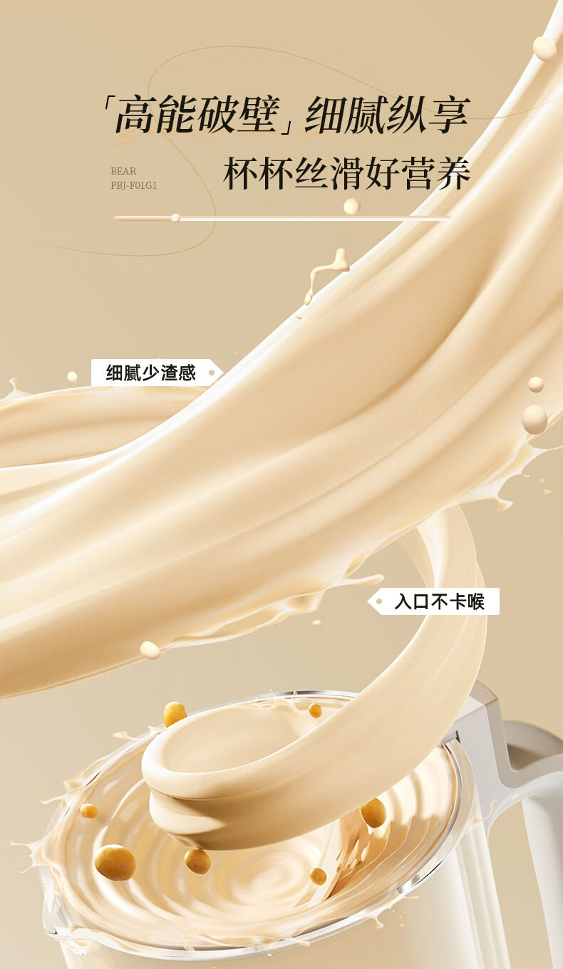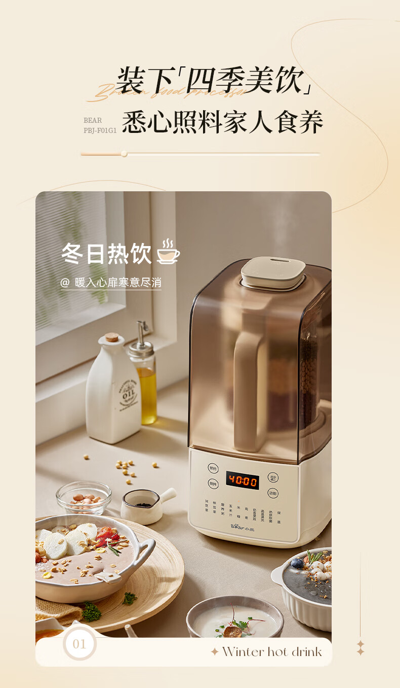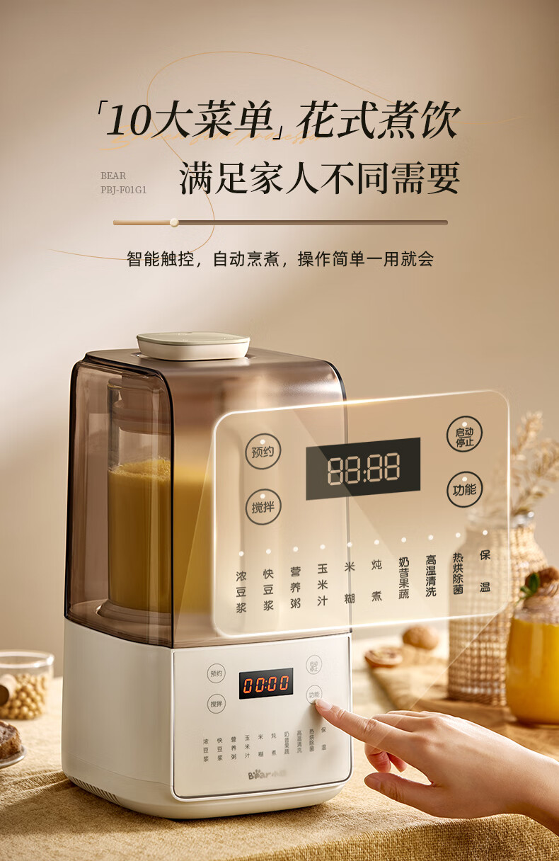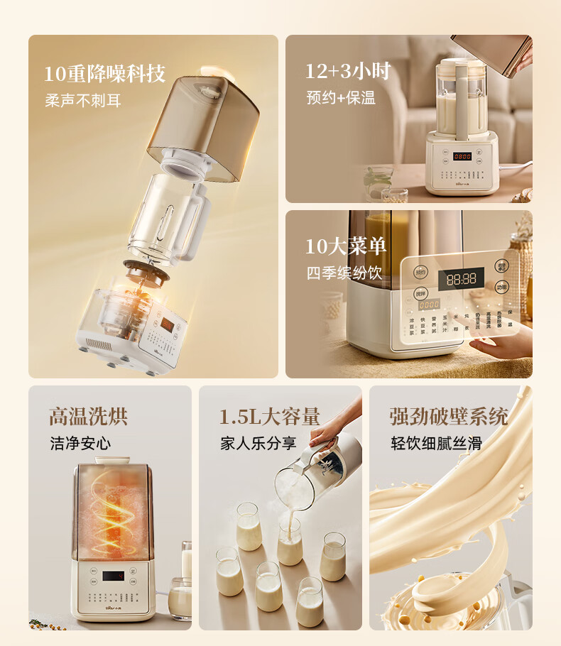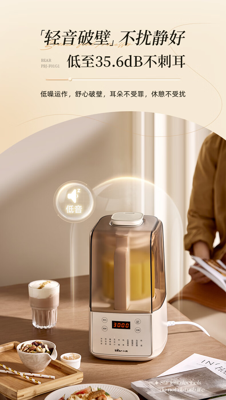 小熊(Bear)低音降噪破壁机1.5L家用全自动豆浆机榨汁料理辅食机预约多功能破壁免滤3-4人用F01G1