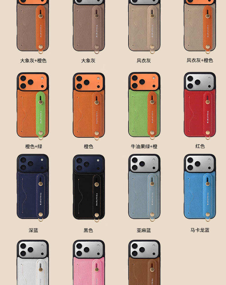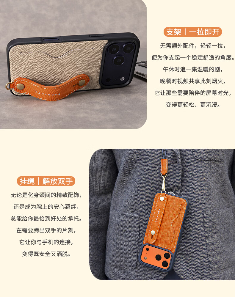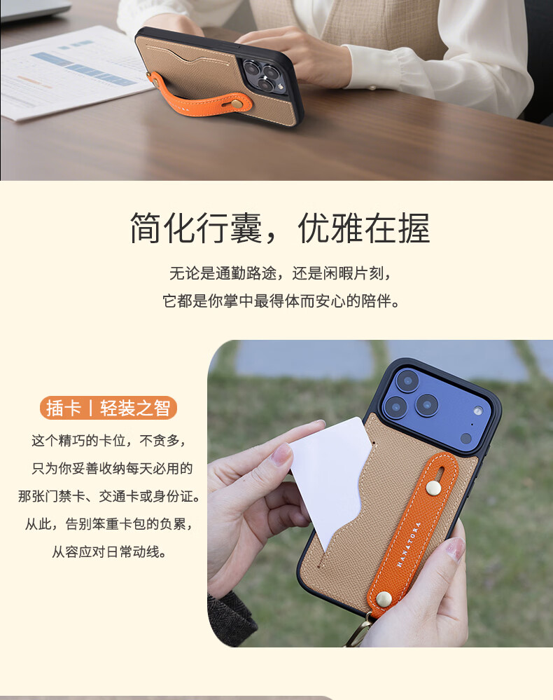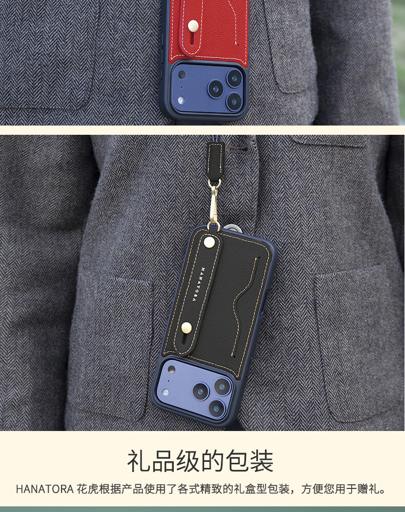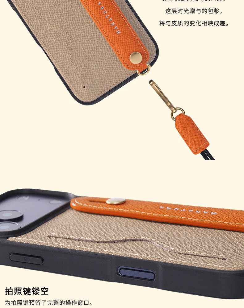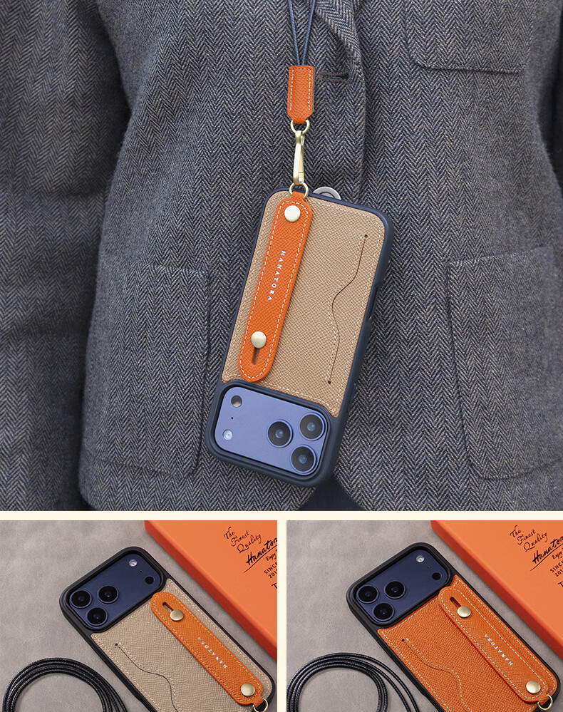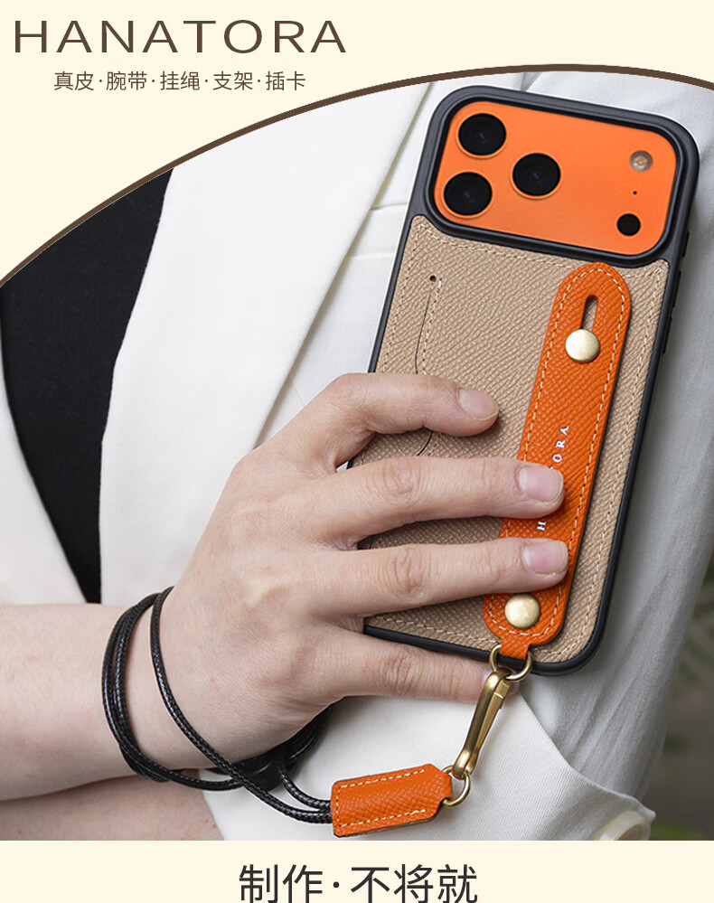 花虎(HANATORA)苹果17/16/15Promax手机壳新款日式真皮iPhone15/14pro高端全包防摔腕带挂绳带支架卡包男女款Air 【风衣灰+橙】配挂脖绳 iPhone 17 Pro