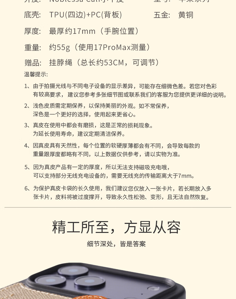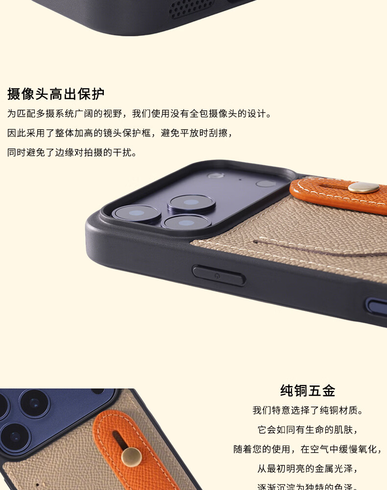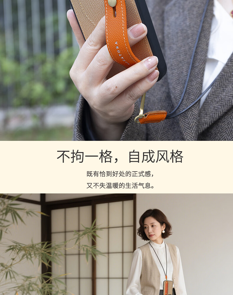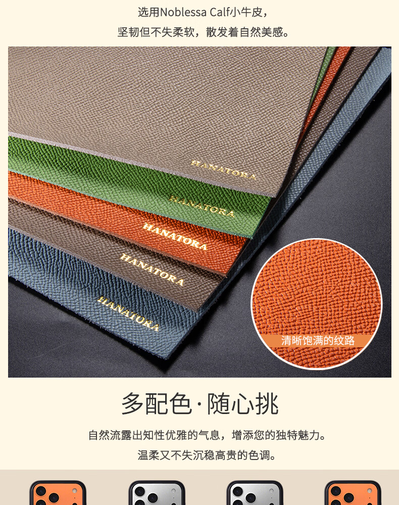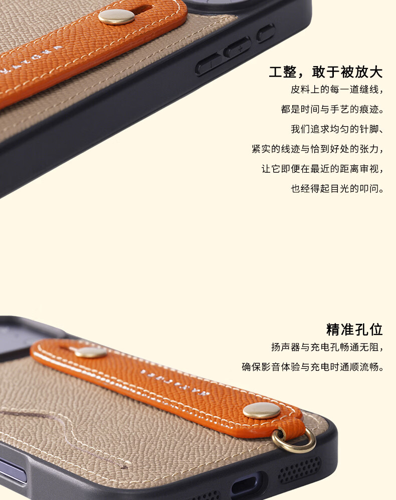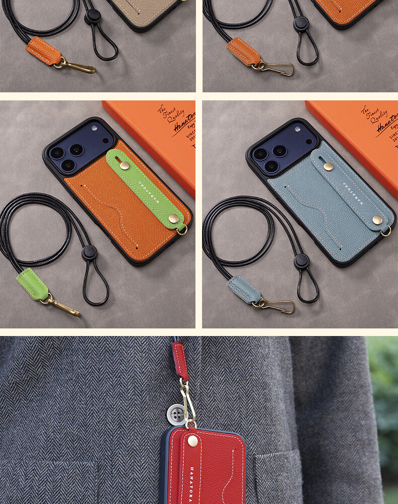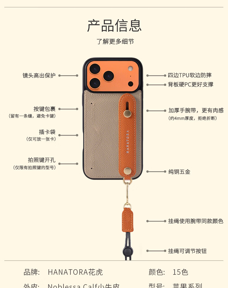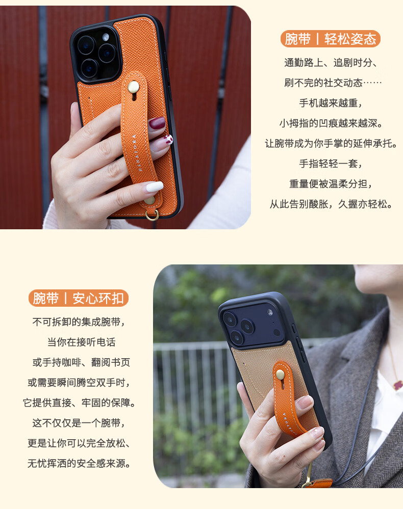花虎(HANATORA)苹果17/16/15Promax手机壳新款日式真皮iPhone15/14pro高端全包防摔腕带挂绳带支架卡包男女款Air 【风衣灰+橙】配挂脖绳 iPhone 17 Pro