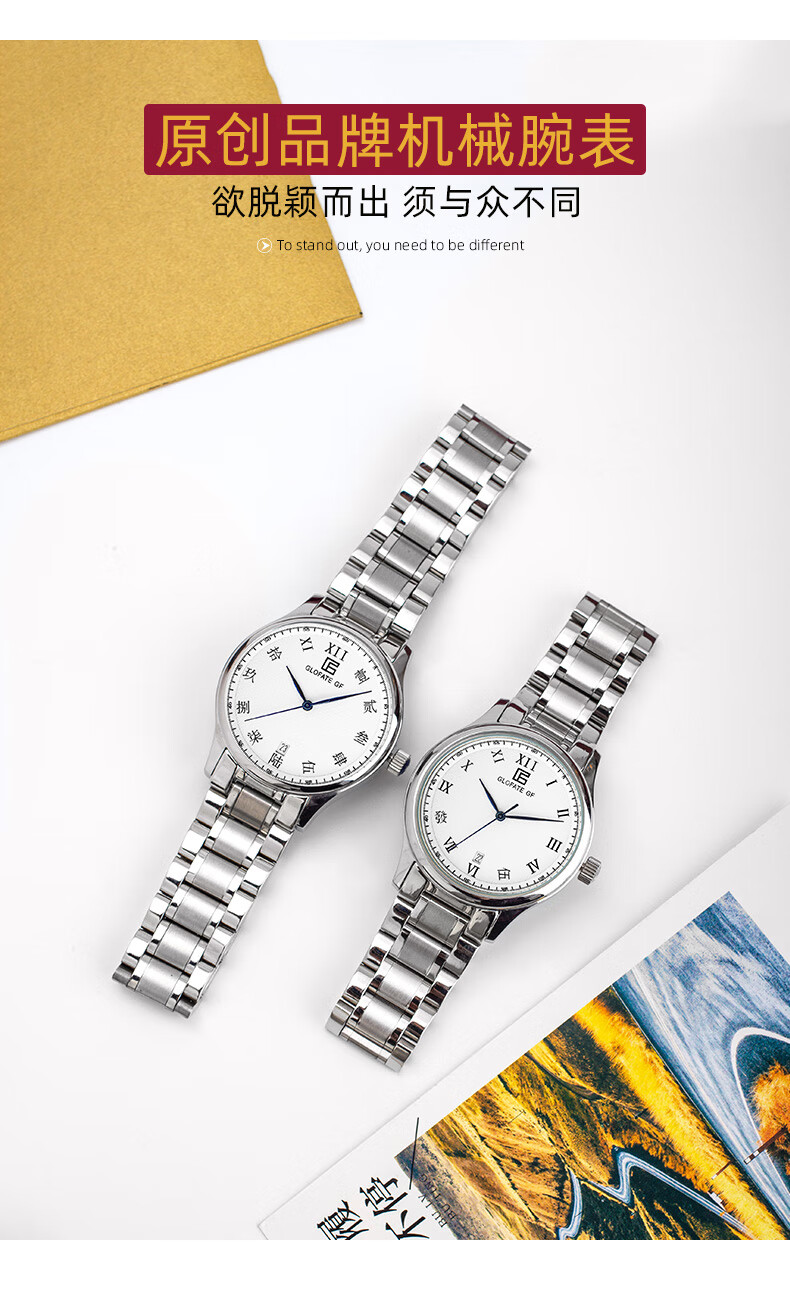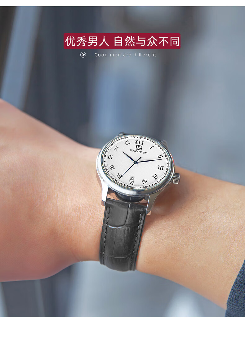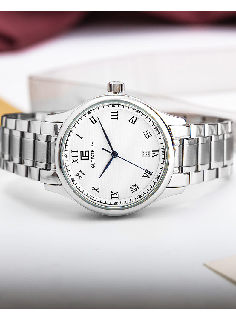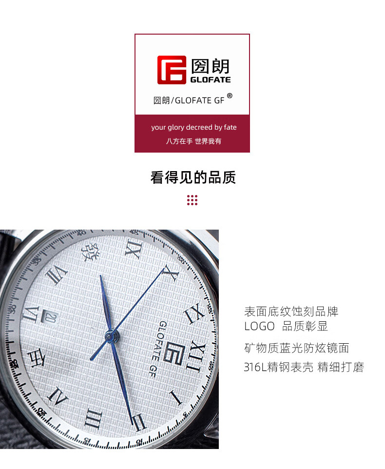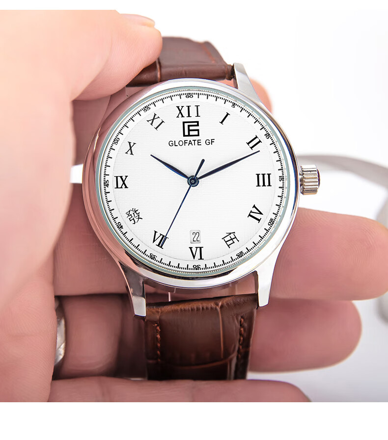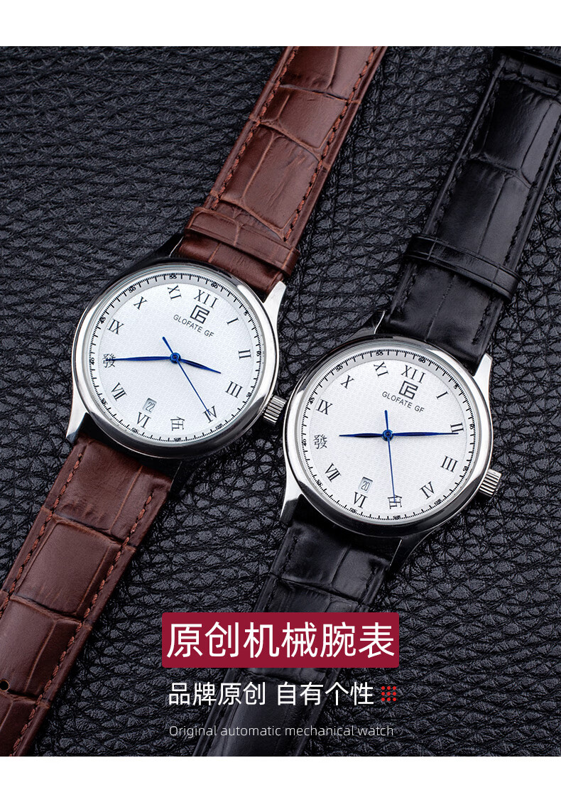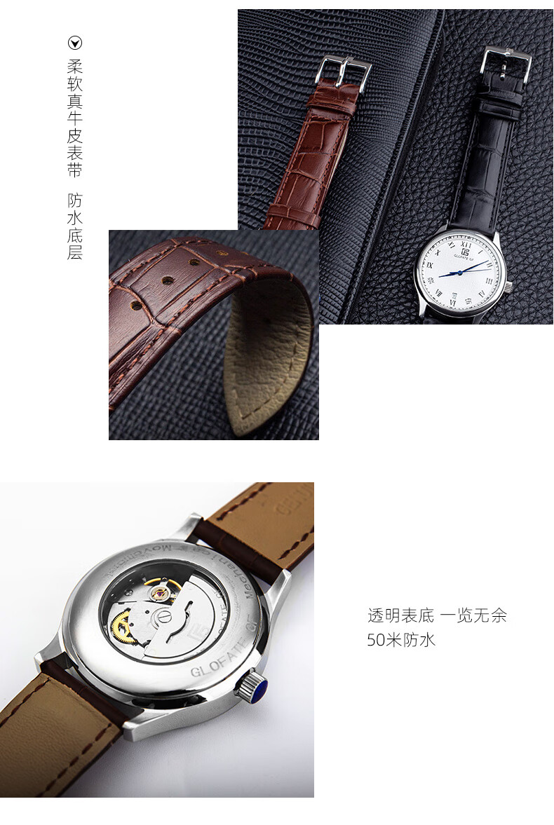 圀朗 GLOFATE GF品牌原创全自动机械手表男中文国货手表皮带钢带防水透底国潮风 白色 银色钢带 39mm