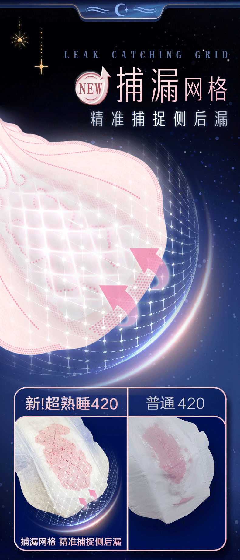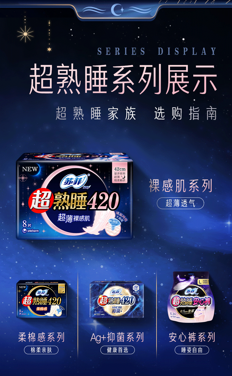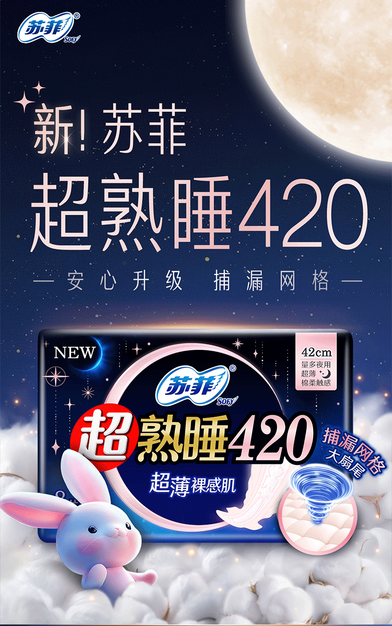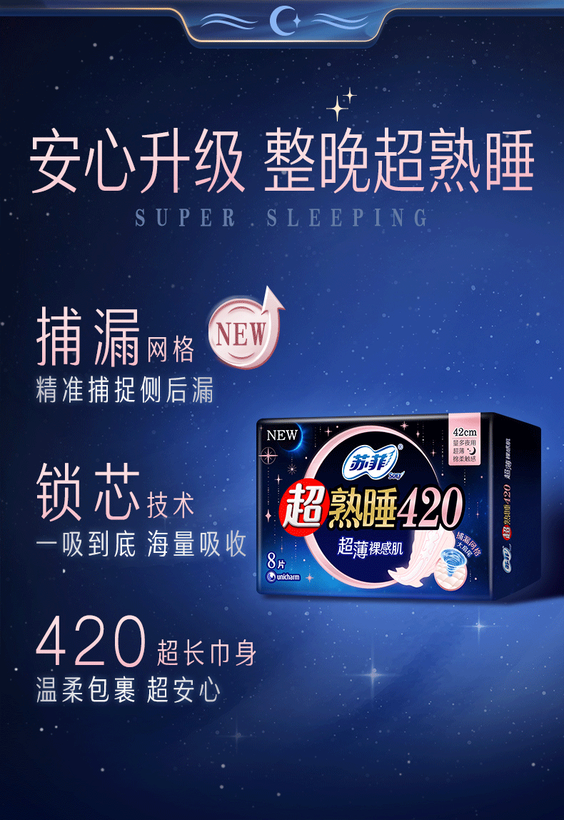 苏菲超熟睡超薄裸感肌超长量多夜用卫生巾42cm8片加大姨妈巾自营官方