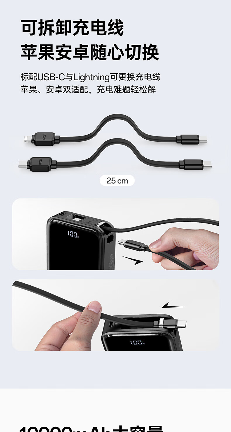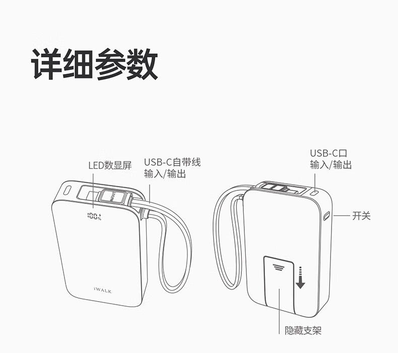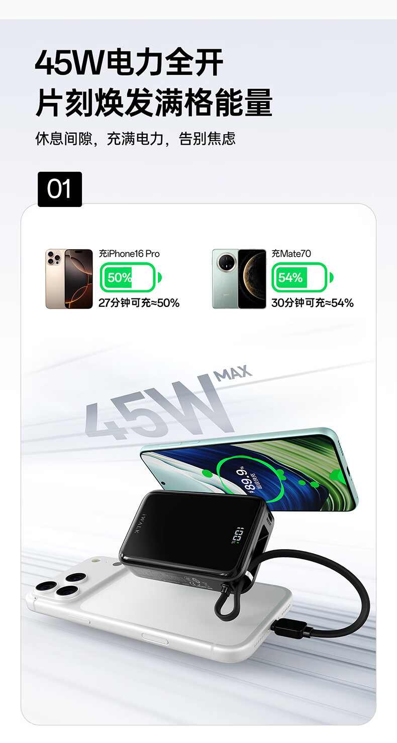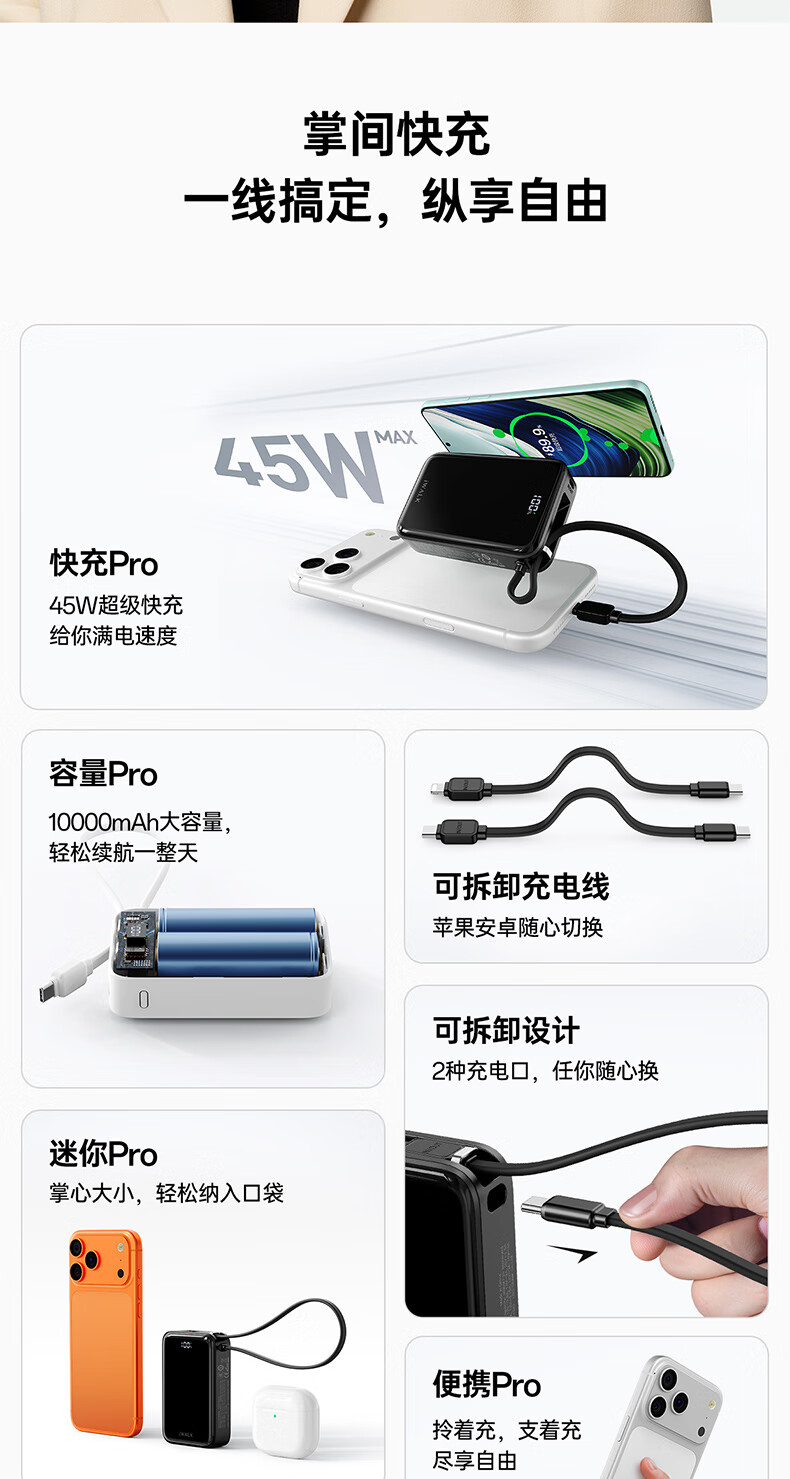 爱沃可(iWALK)45W自带线充电宝10000毫安自带双线双向快充大容量20000毫安电源便携3C可上飞机适用iphone17/华为 商务版20000毫安/45W快充/自带双线/白色