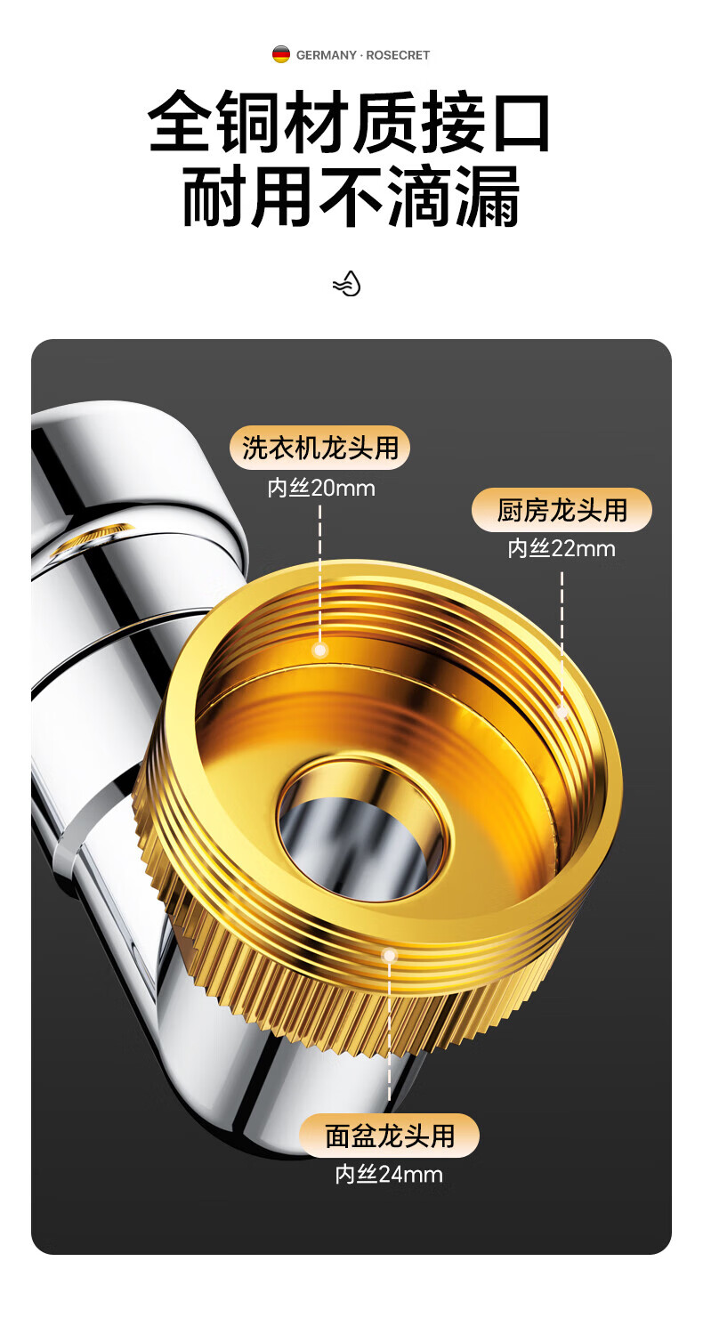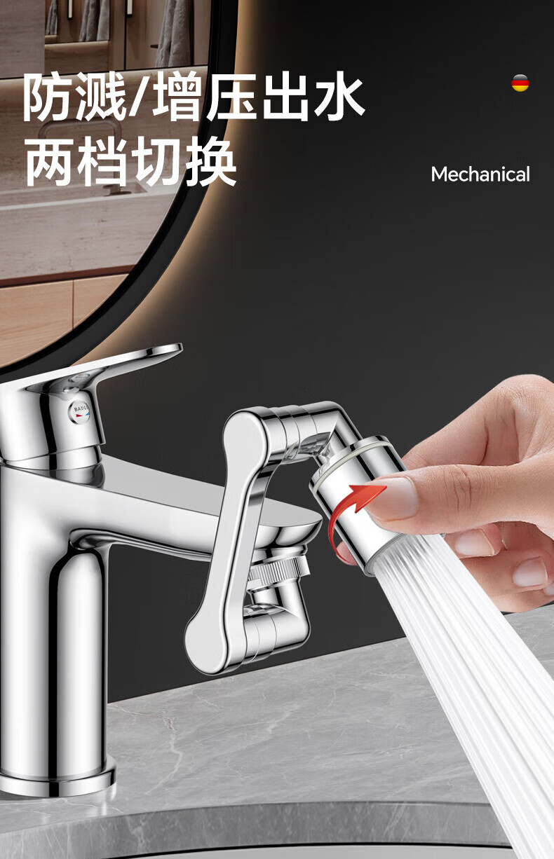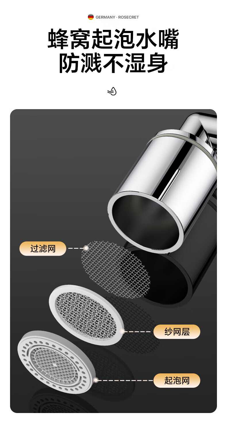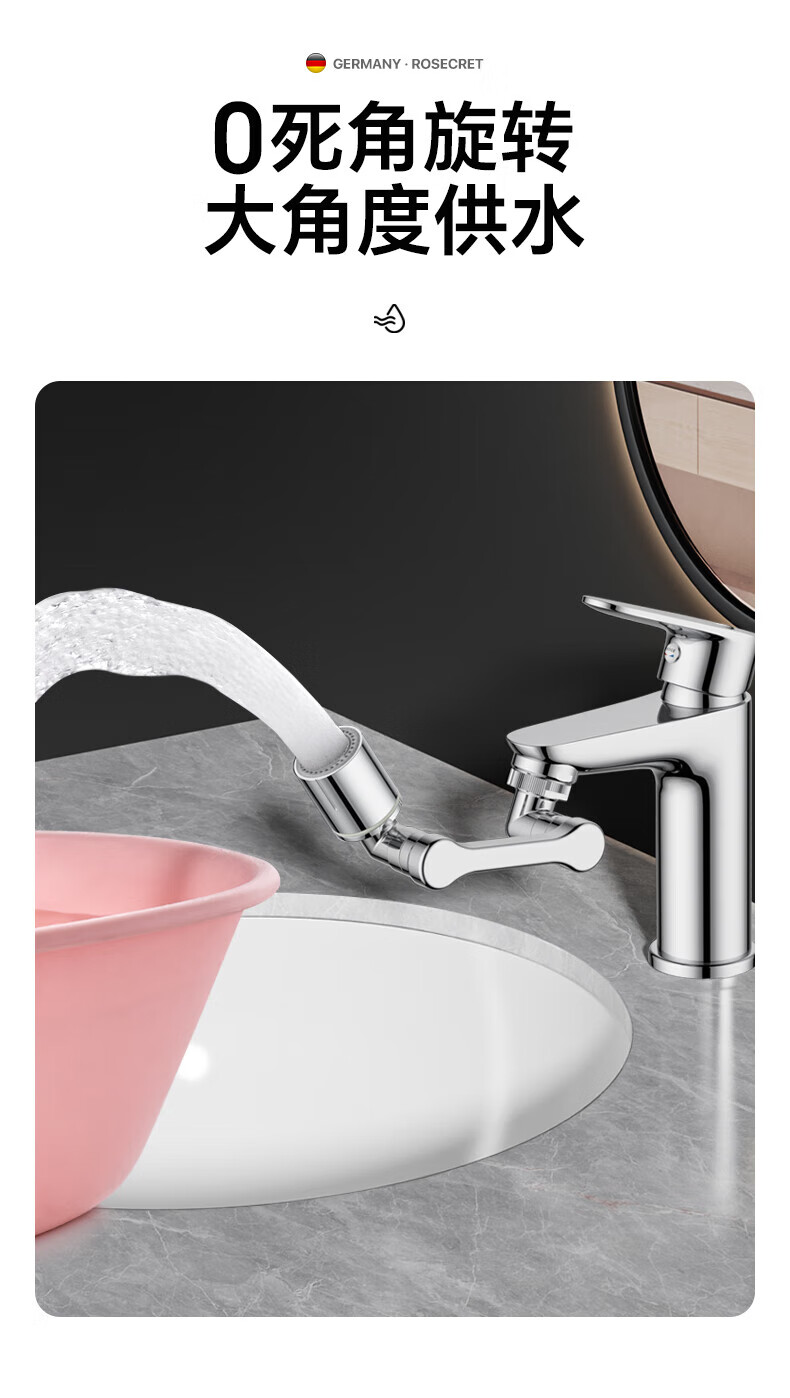 Rosecret【德国】面盆水龙头延伸器多功能万向旋转机械臂增压防溅水起泡器 两档水龙头转接头【亮银色】全铜水嘴 加厚加重丨防锈防漏丨通用安装