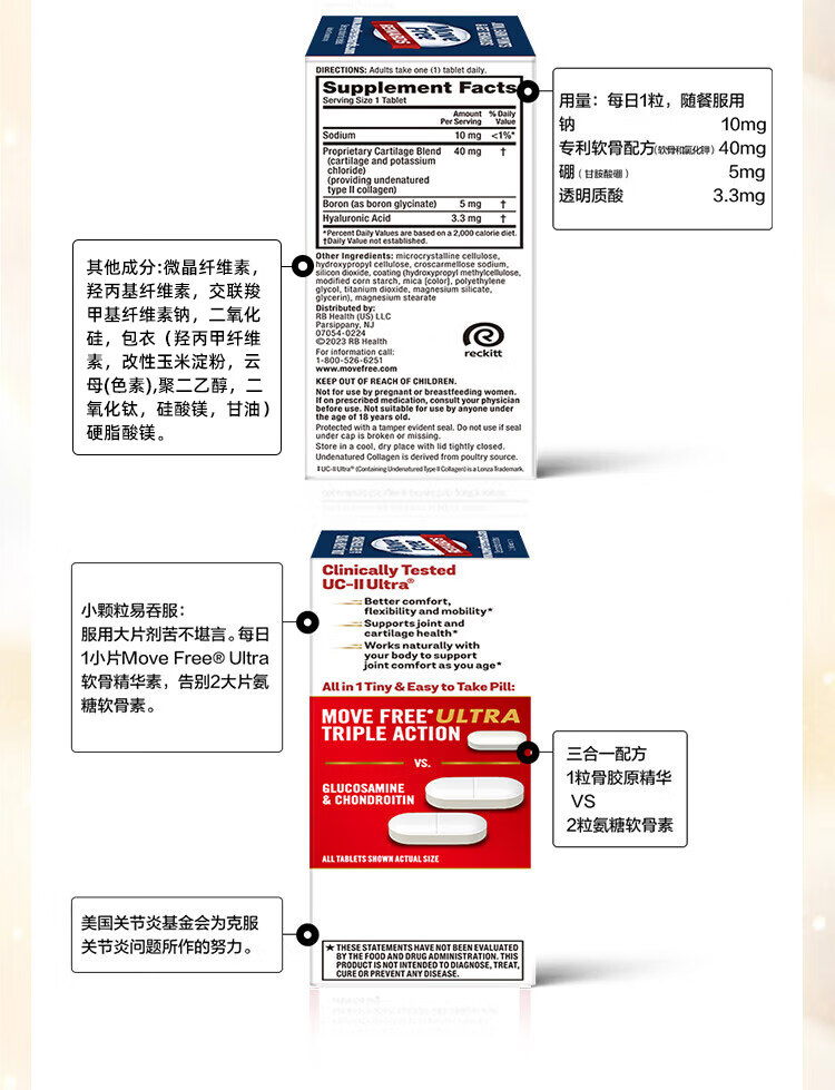 Move Free益节 UC2专利骨胶原75粒 II型胶原蛋白 氨糖搭档软骨素维骨力美国