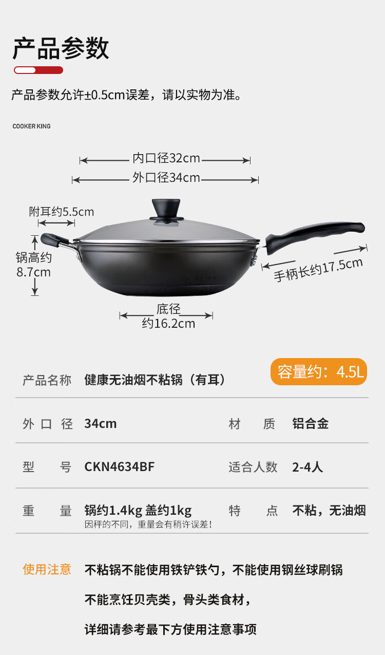 炊大皇炒锅不粘锅少油烟平底锅多用煎炒锅电磁炉通用健康 34cm