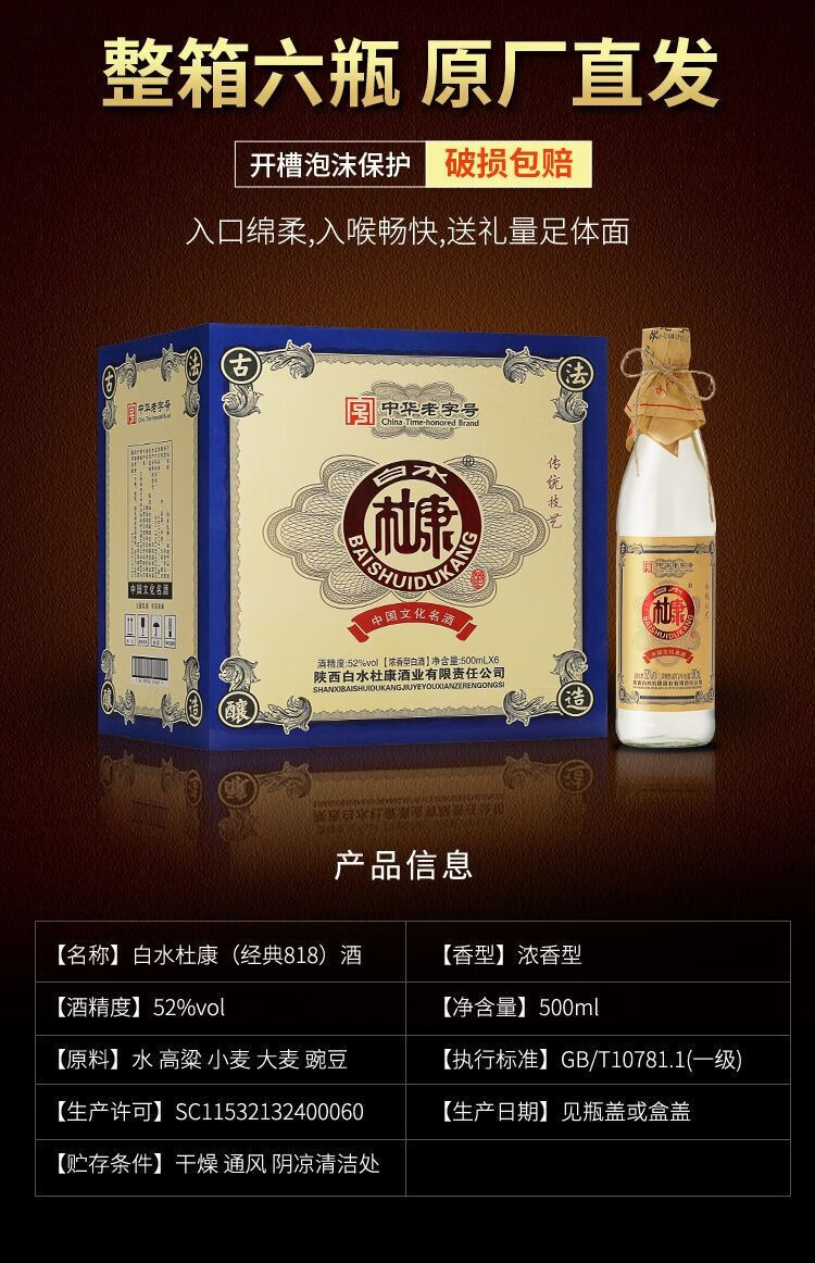 白水杜康【6万+人已加购】经典818浓香型白酒52度500ml*6瓶整箱光瓶酒 经典818整箱6瓶