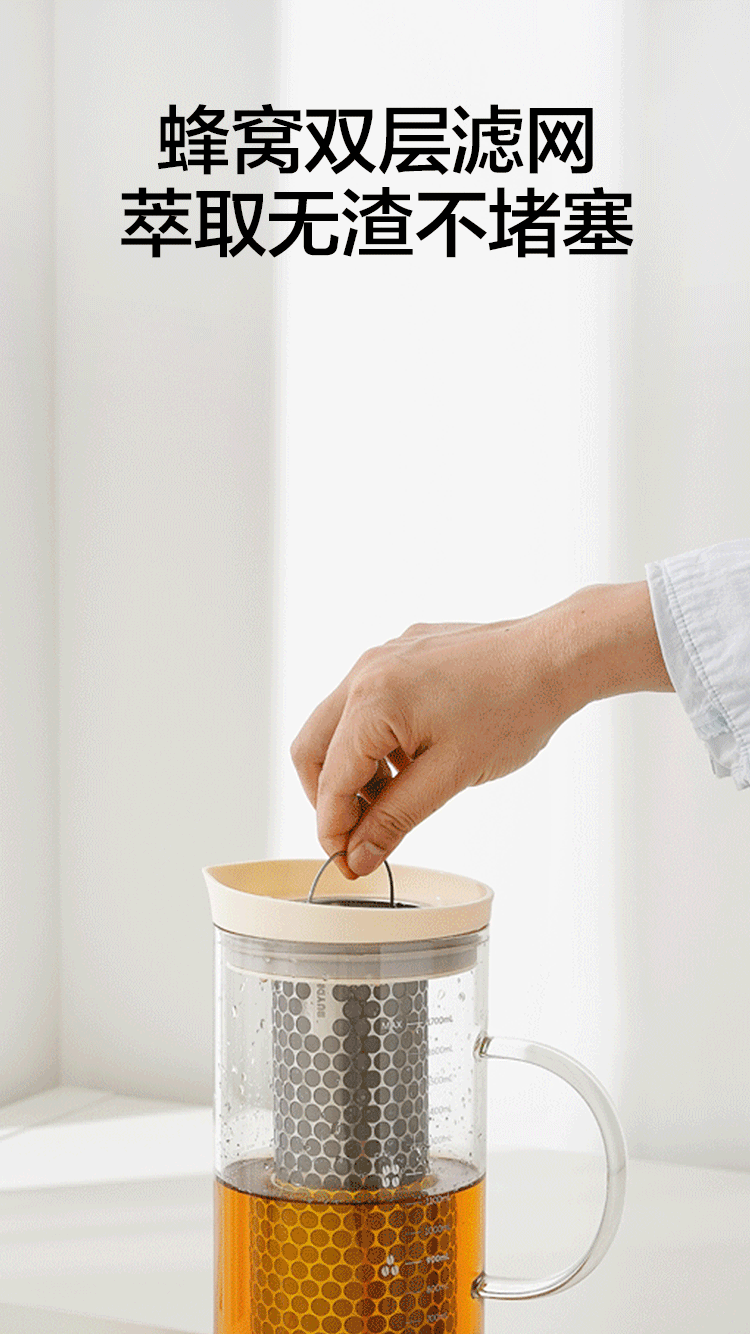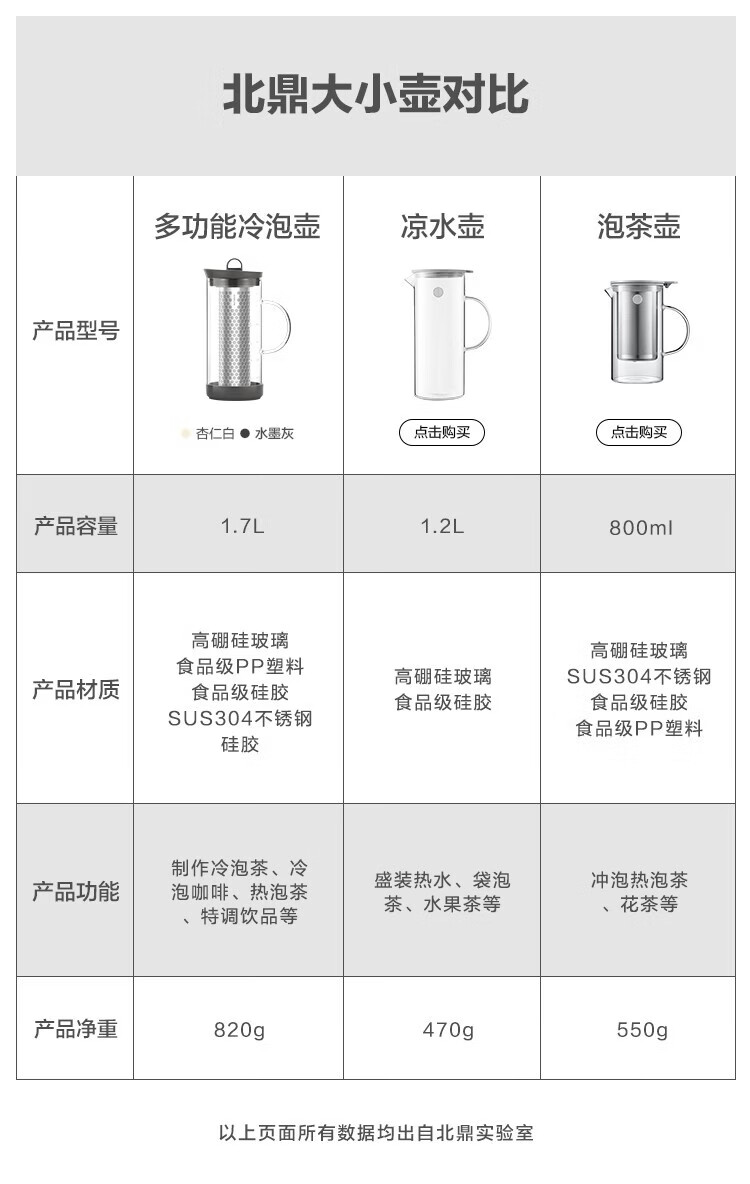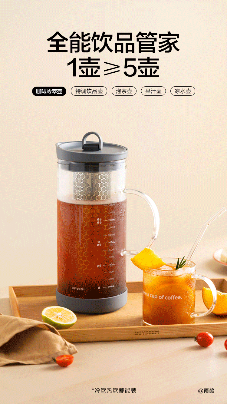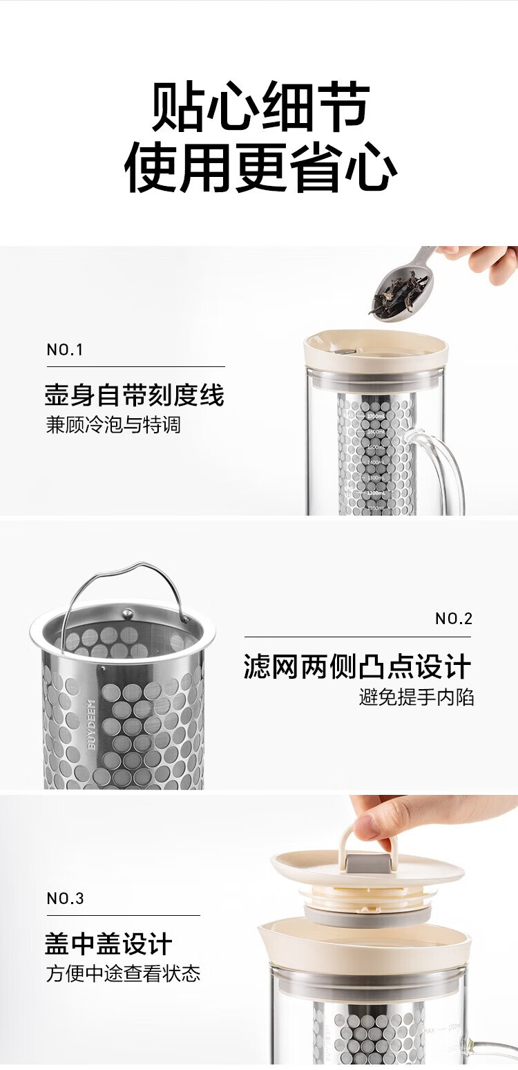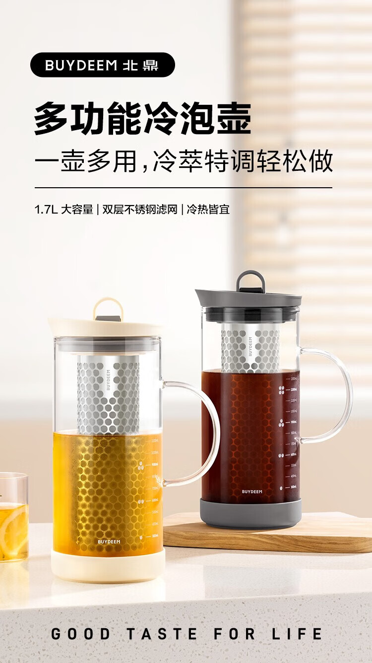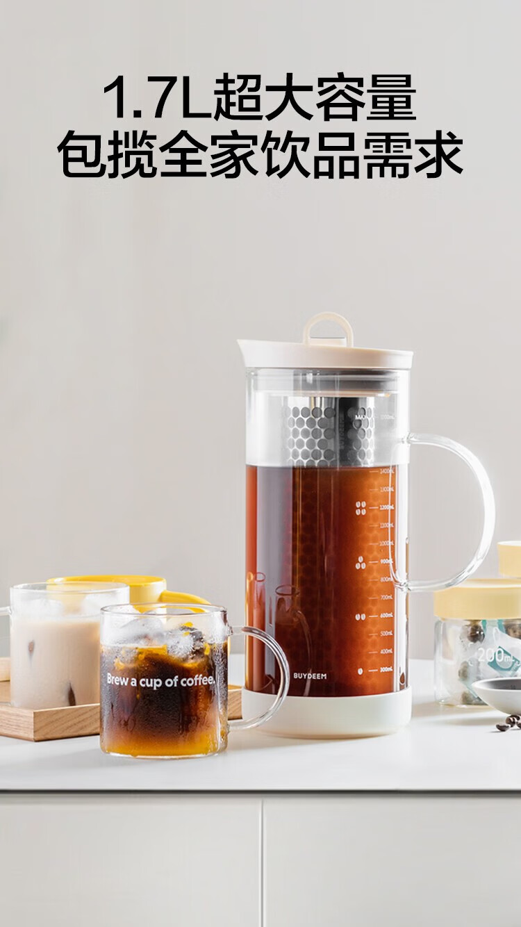 北鼎(Buydeem)玻璃泡茶壶家用大容量冷泡壶耐高温刻度冷萃咖啡壶家用办公水壶 【杏仁白】多功能冷泡壶-1700ml