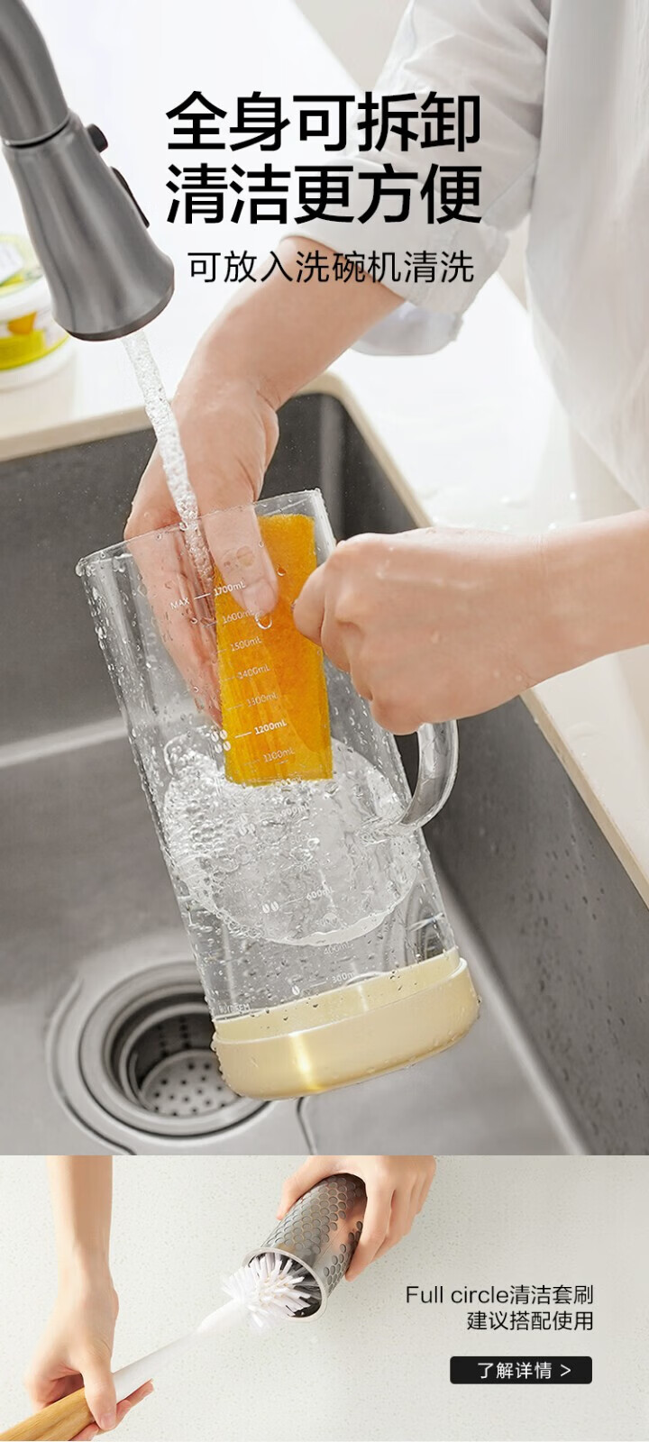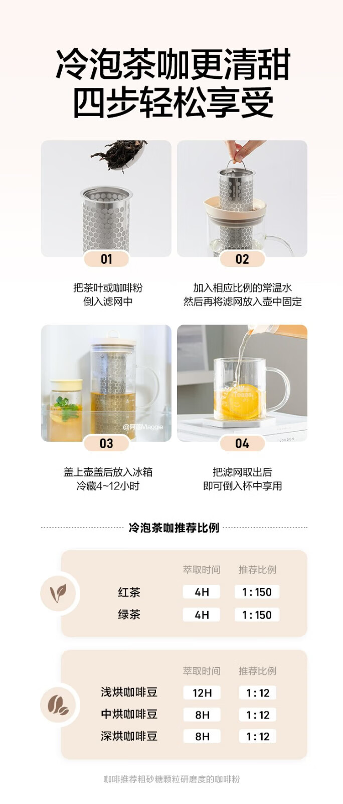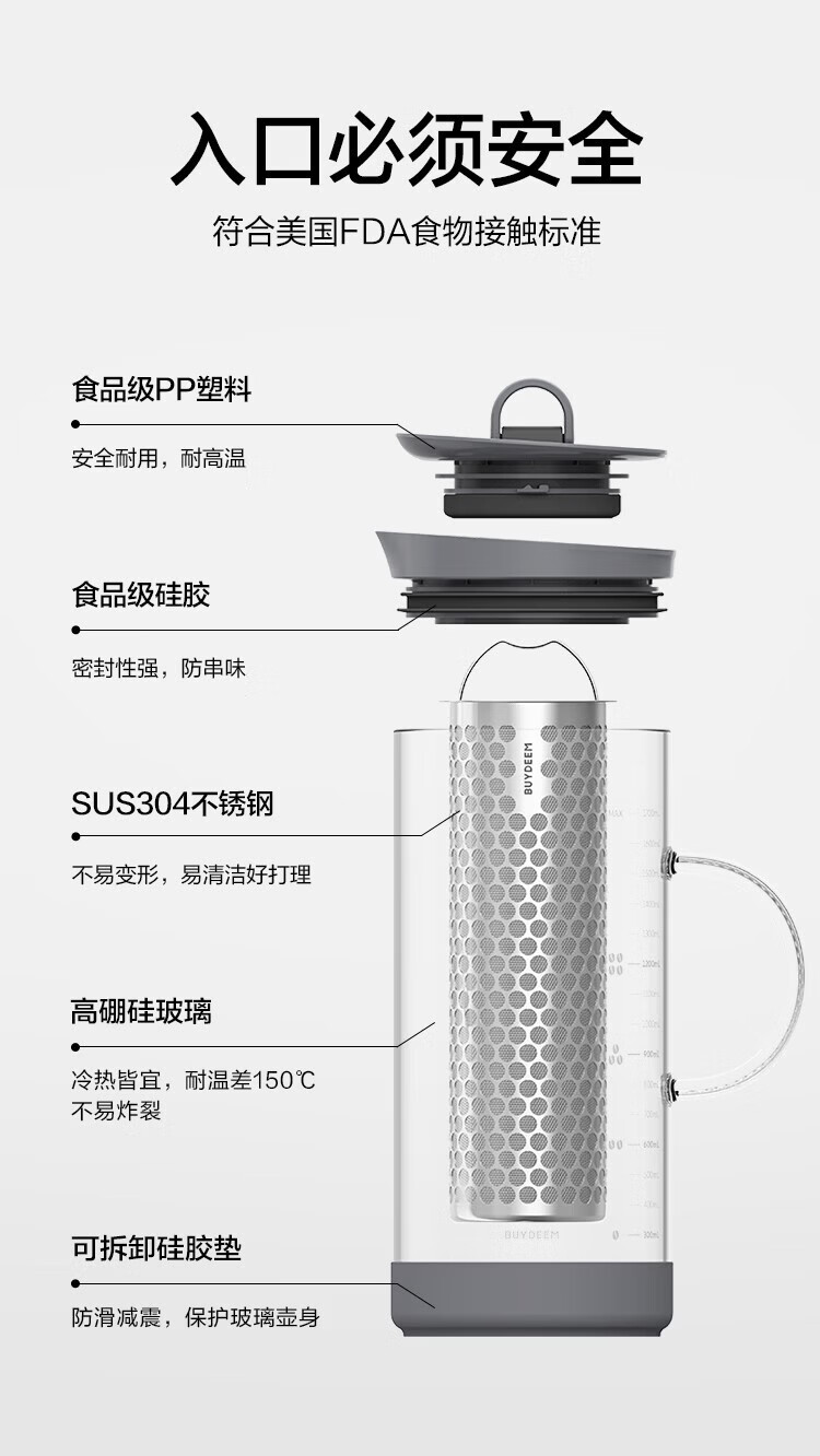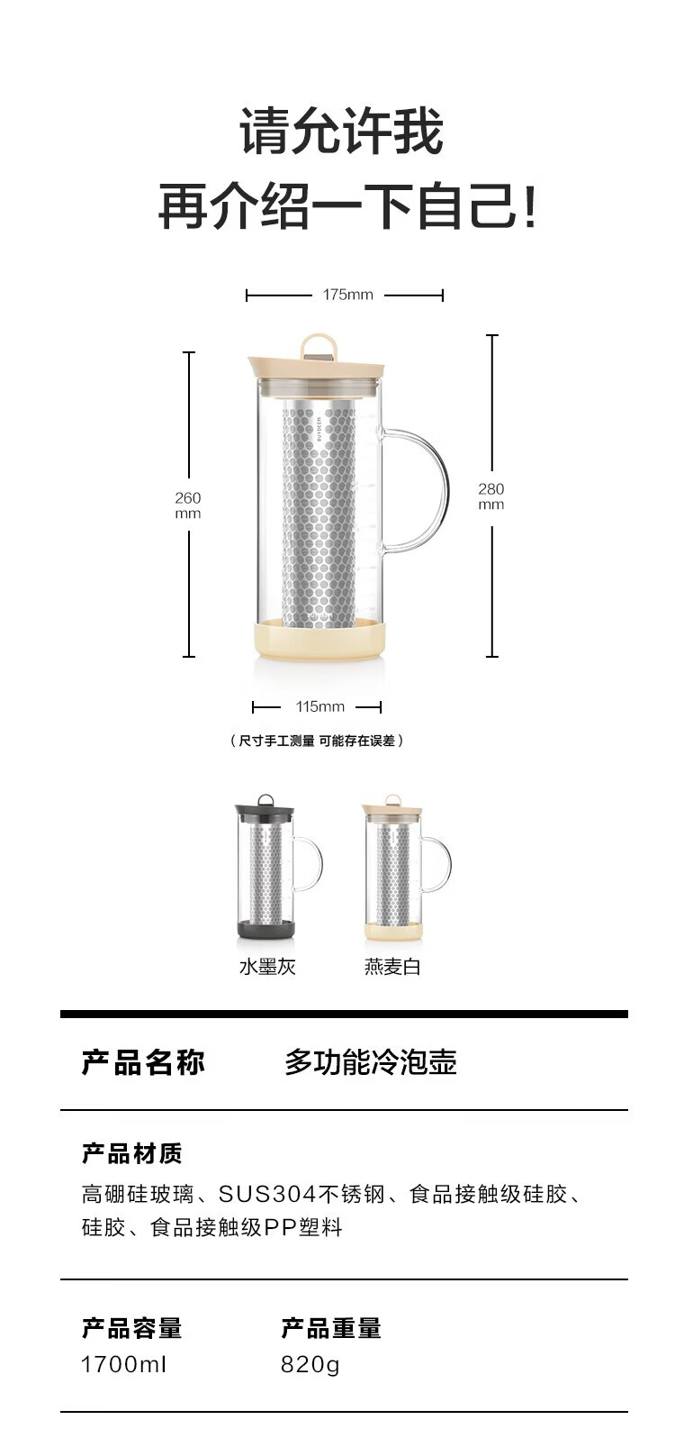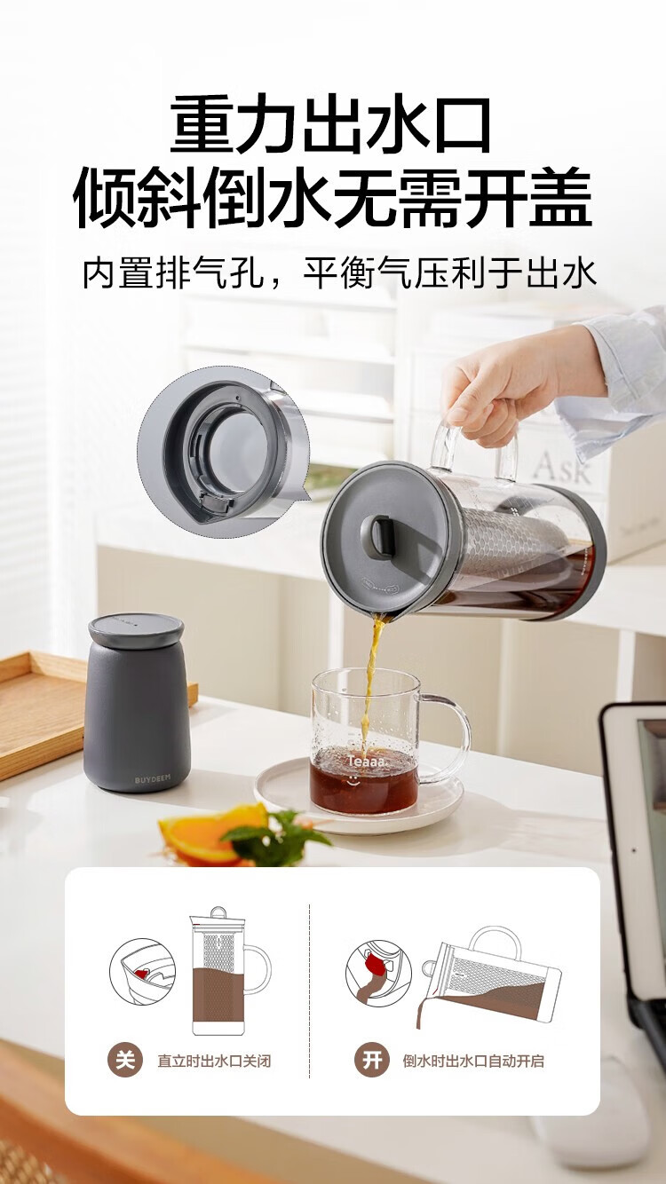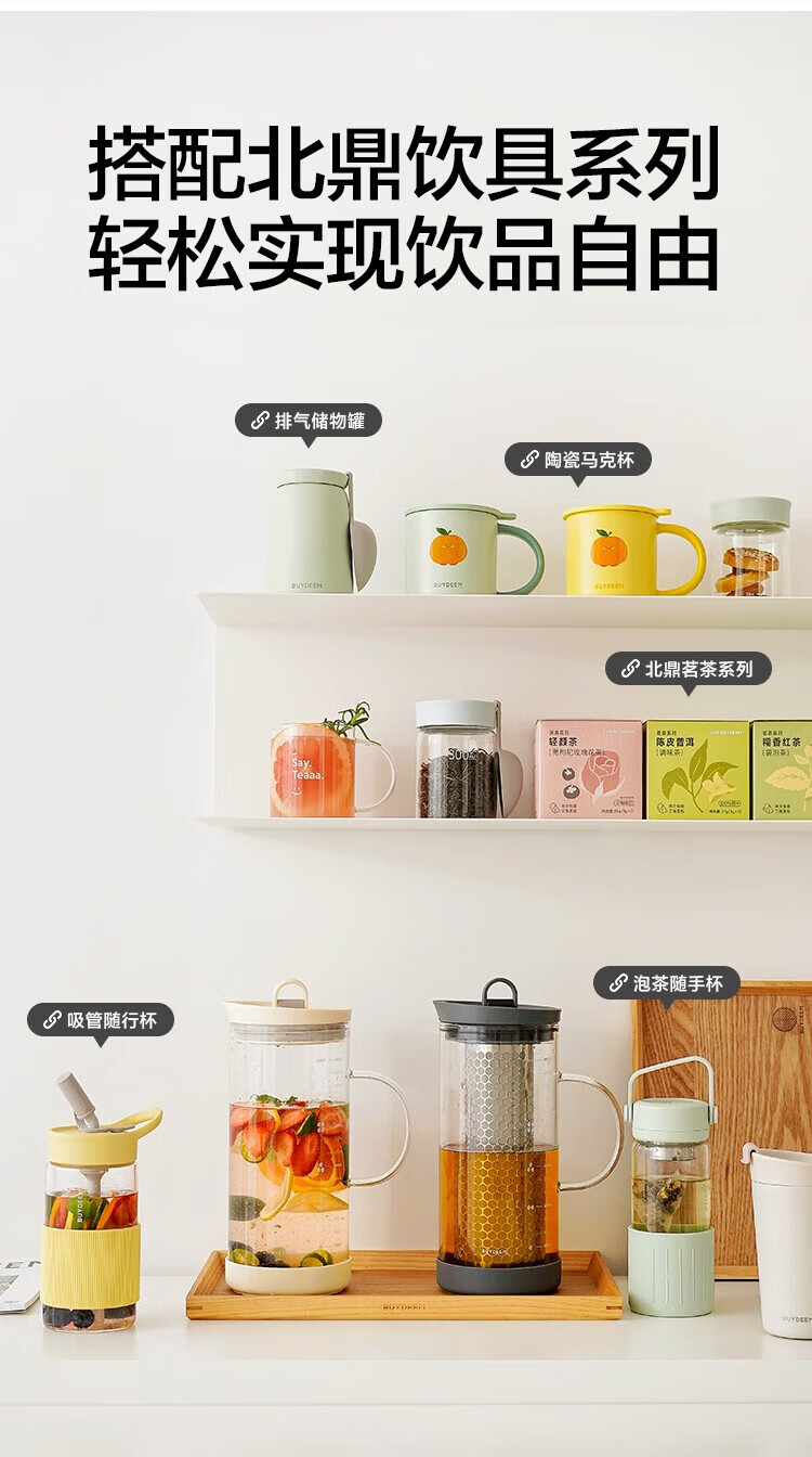 北鼎(Buydeem)玻璃泡茶壶家用大容量冷泡壶耐高温刻度冷萃咖啡壶家用办公水壶 【杏仁白】多功能冷泡壶-1700ml