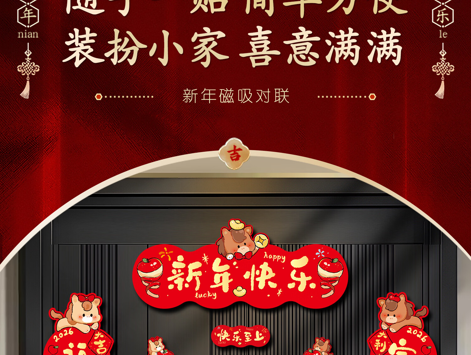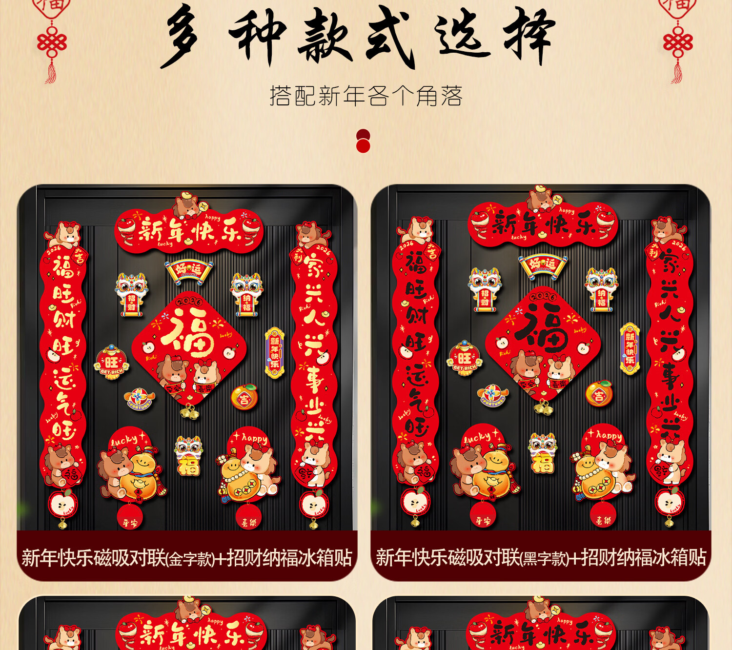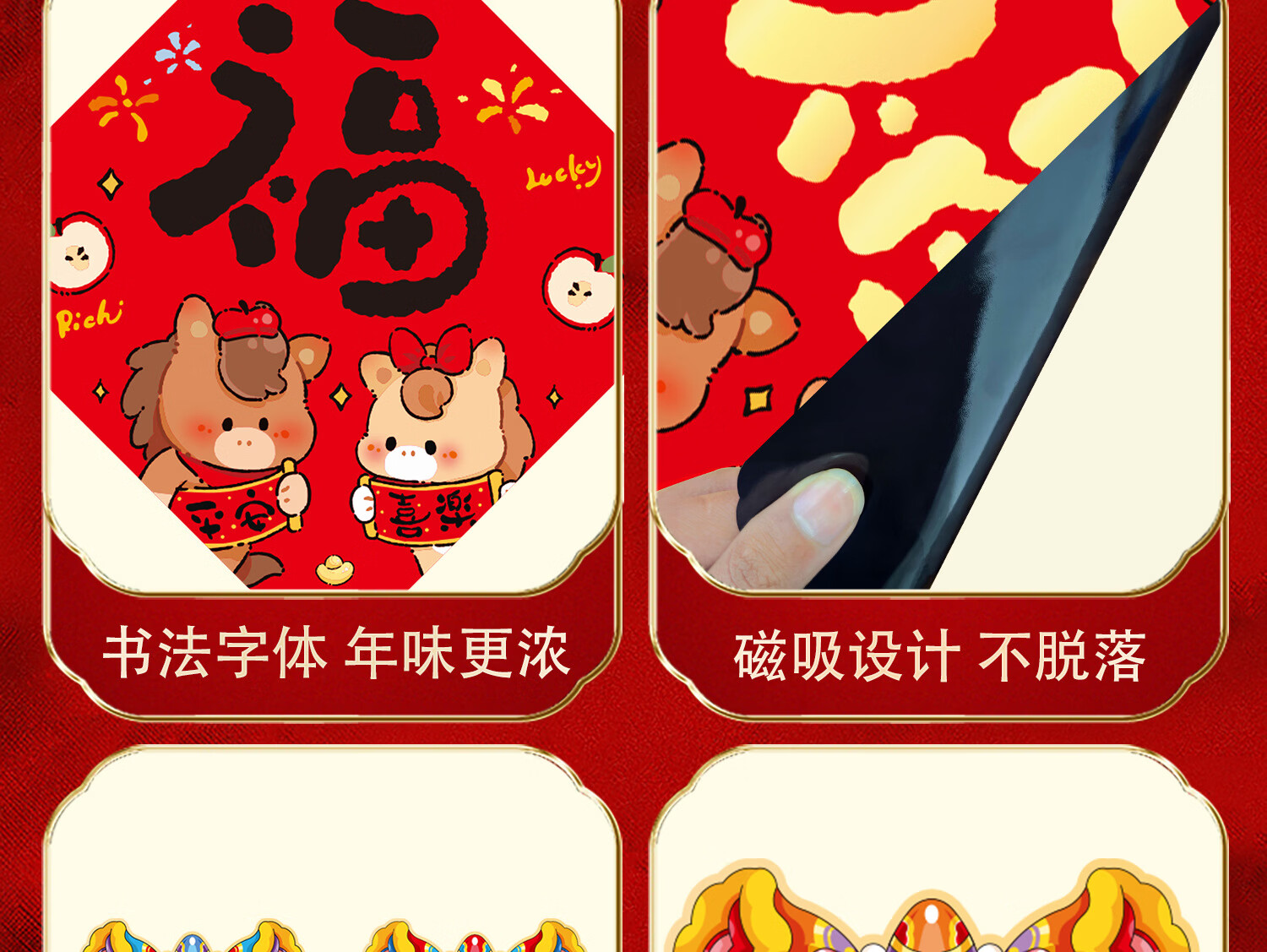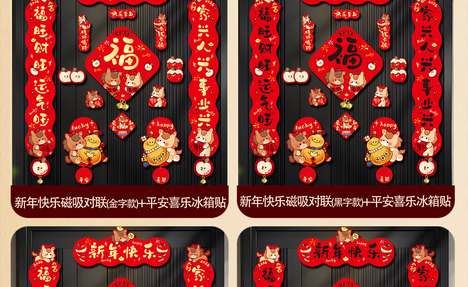 简菲(jaofia)新年磁吸对联春联批货2026马年新款过年入户门大福字门贴春节用品其他文教文化用品 新年快乐磁吸对联(黑字款)+招财纳福冰箱贴 磁吸对联-礼盒装(磁吸不伤门)
