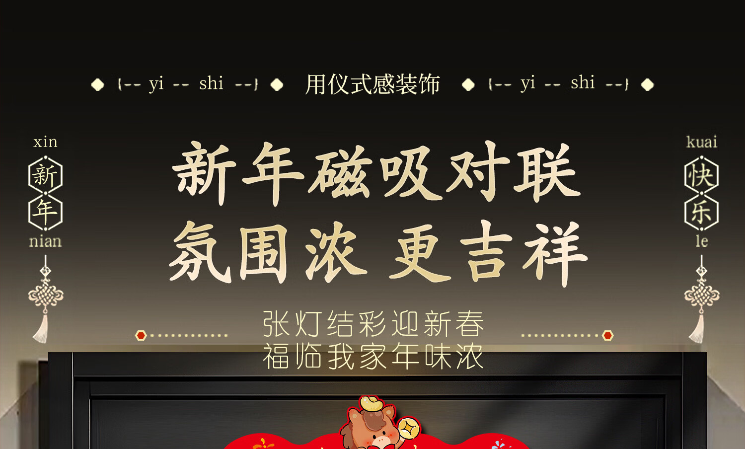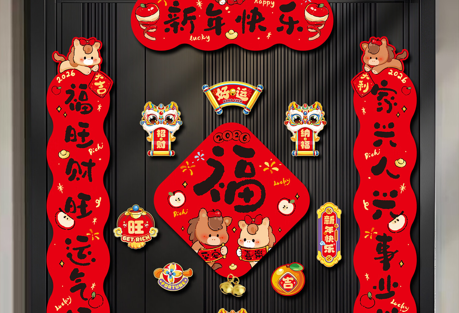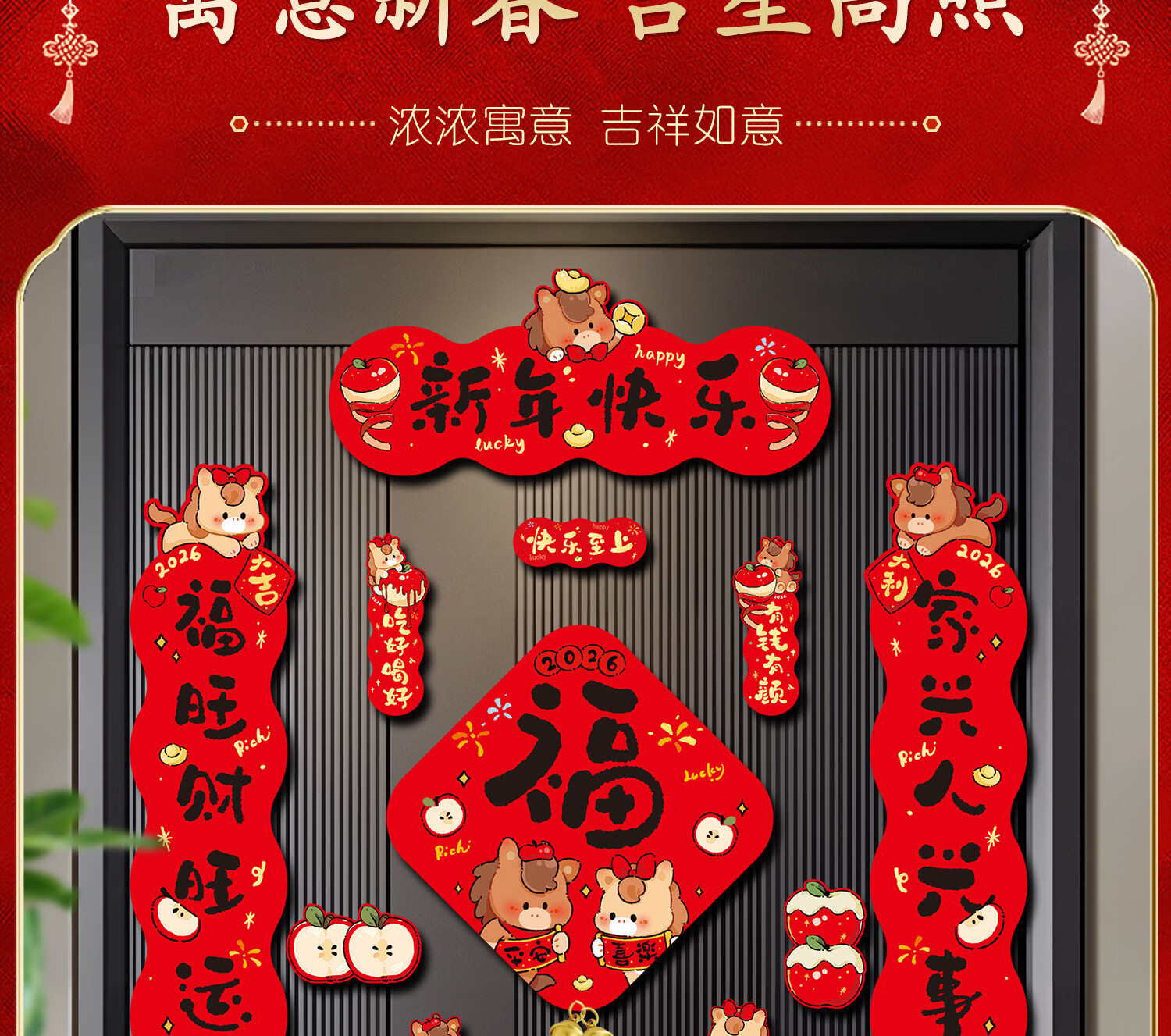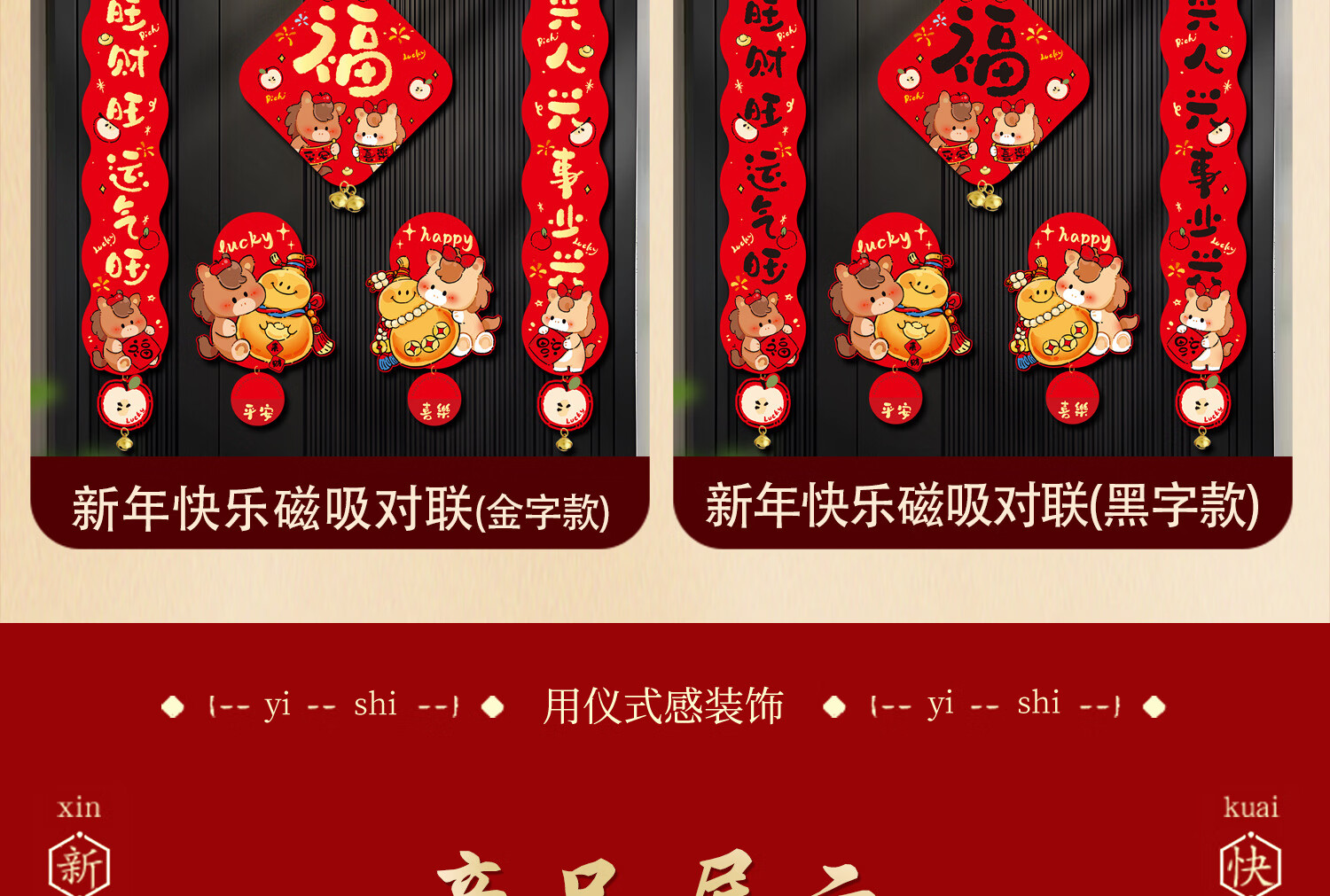 简菲(jaofia)新年磁吸对联春联批货2026马年新款过年入户门大福字门贴春节用品其他文教文化用品 新年快乐磁吸对联(黑字款)+招财纳福冰箱贴 磁吸对联-礼盒装(磁吸不伤门)