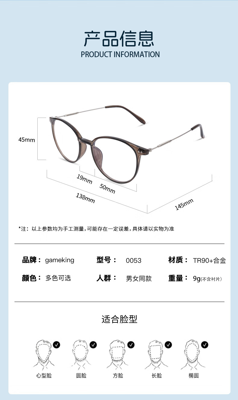 Gameking防蓝光眼镜防辐射男女平光护目可配度数超轻近视眼镜架 0053开学