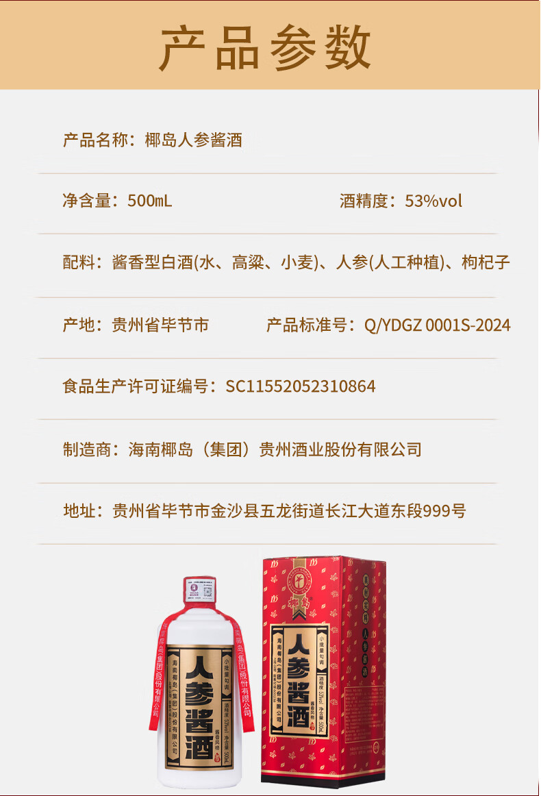 椰岛(YEDAO)人参酱酒 酱香型白酒基酒 粮食酿造草本养生酒 节日宴请送礼 53度 100mL 1瓶 人参酱酒红