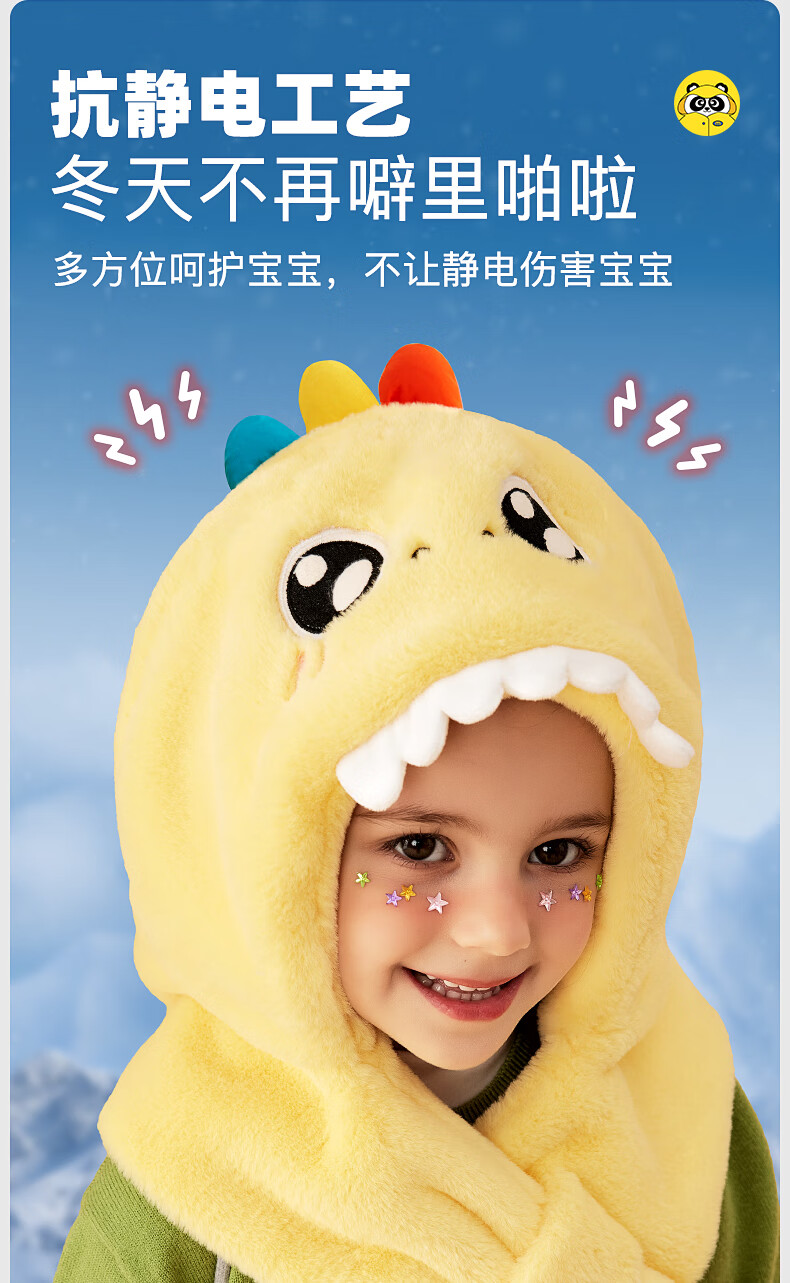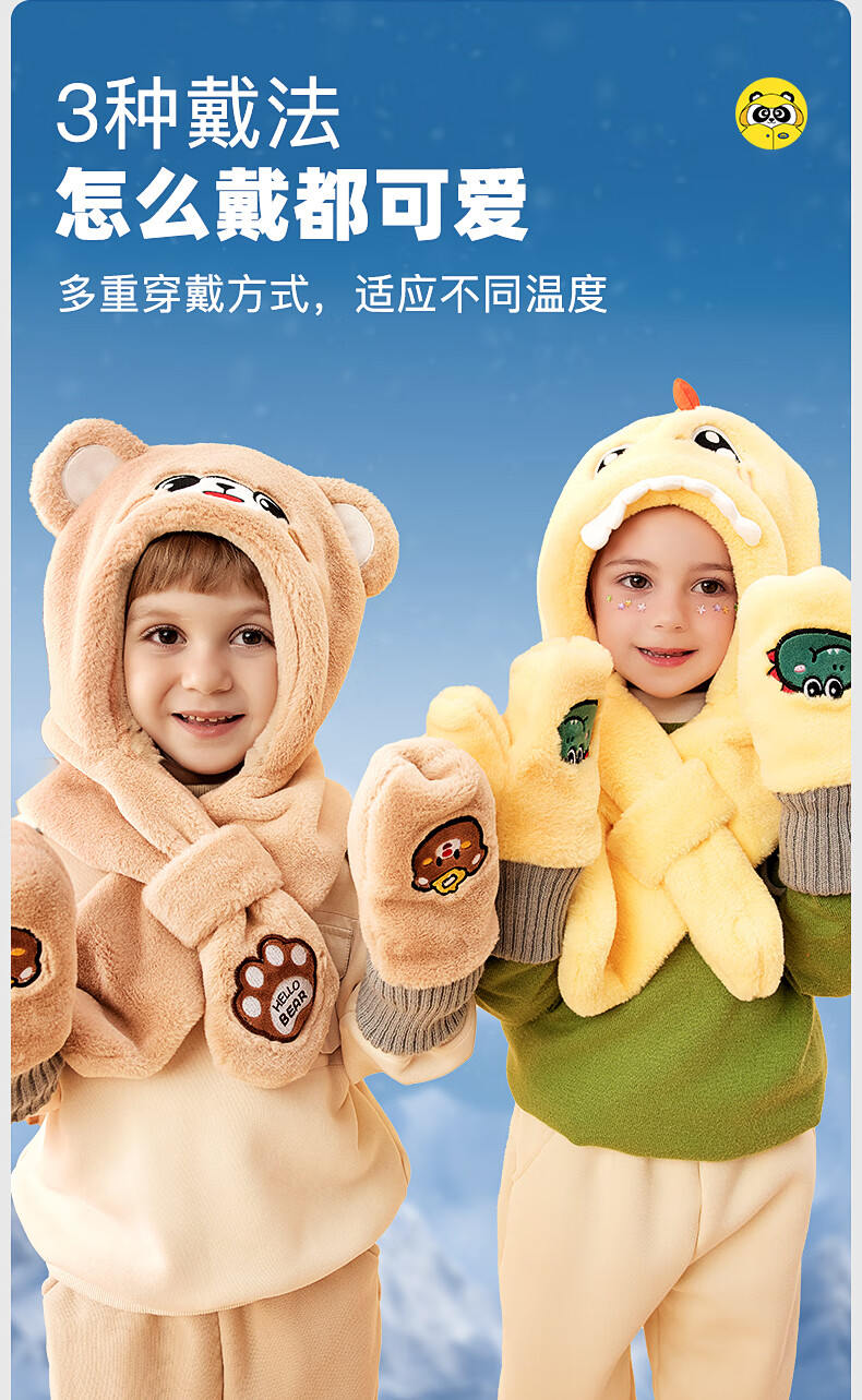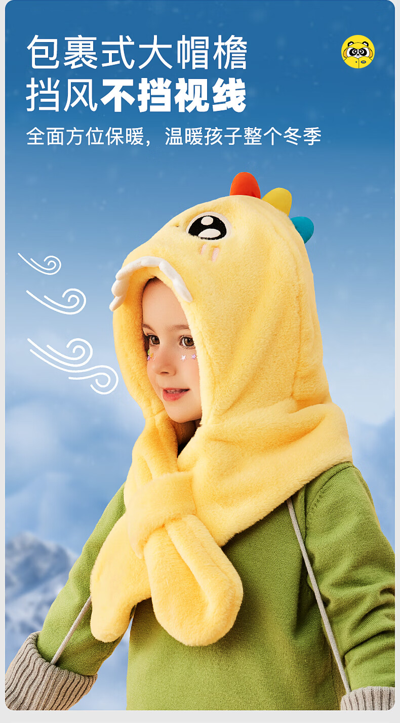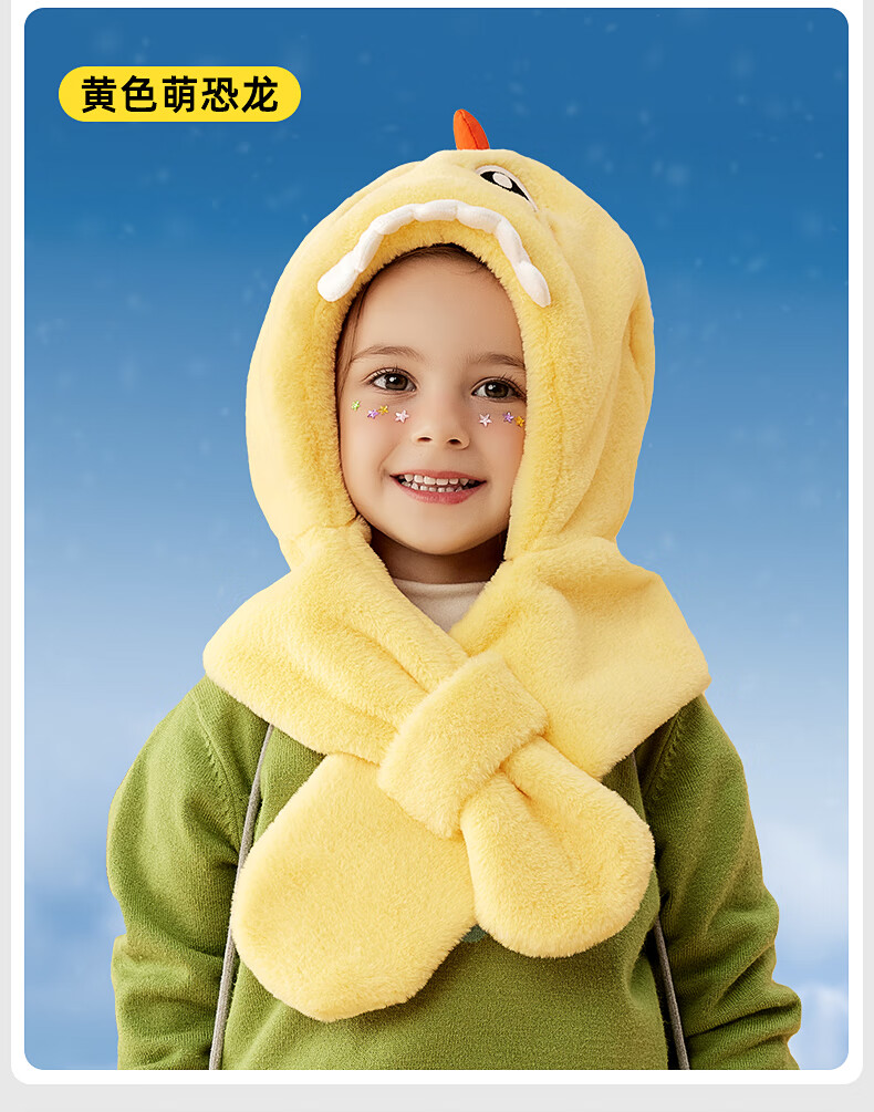 牧萌儿童帽子围巾两件套男童女童冬季加绒加厚一体帽保暖防风帽 黄色萌恐龙【围巾帽手套三件套】 均码【头围50-55cm】适用3-12岁