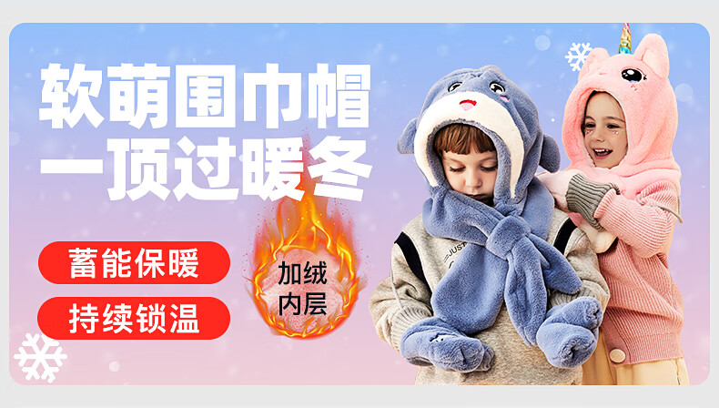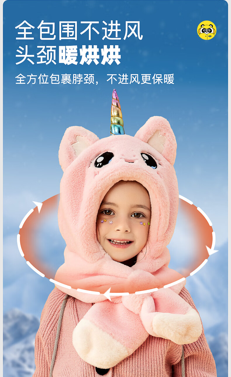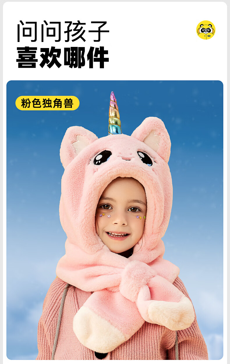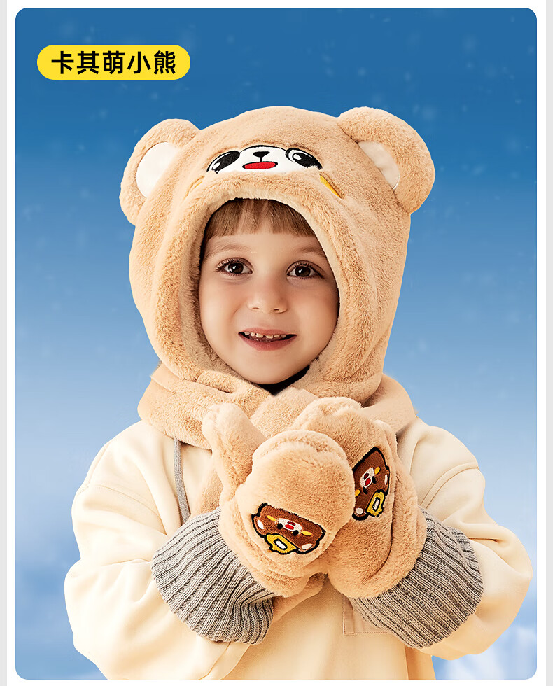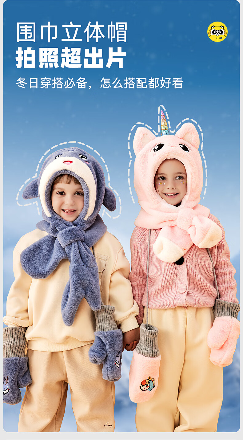 牧萌儿童帽子围巾两件套男童女童冬季加绒加厚一体帽保暖防风帽 黄色萌恐龙【围巾帽手套三件套】 均码【头围50-55cm】适用3-12岁