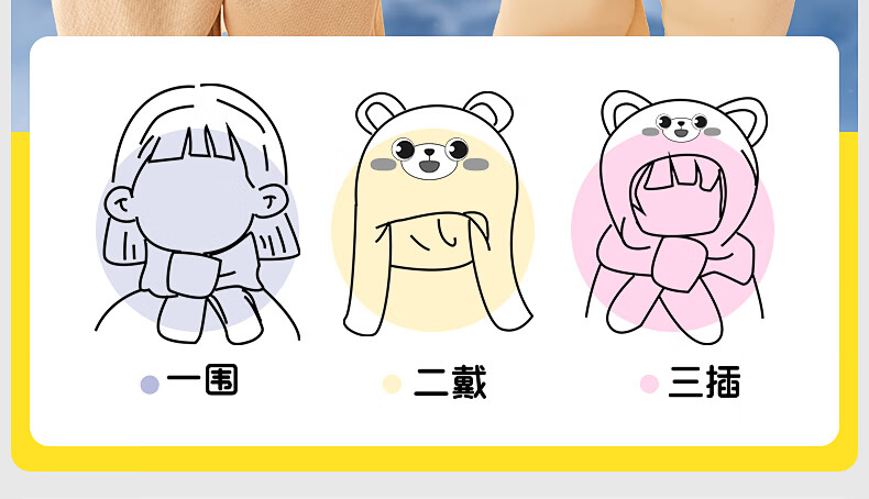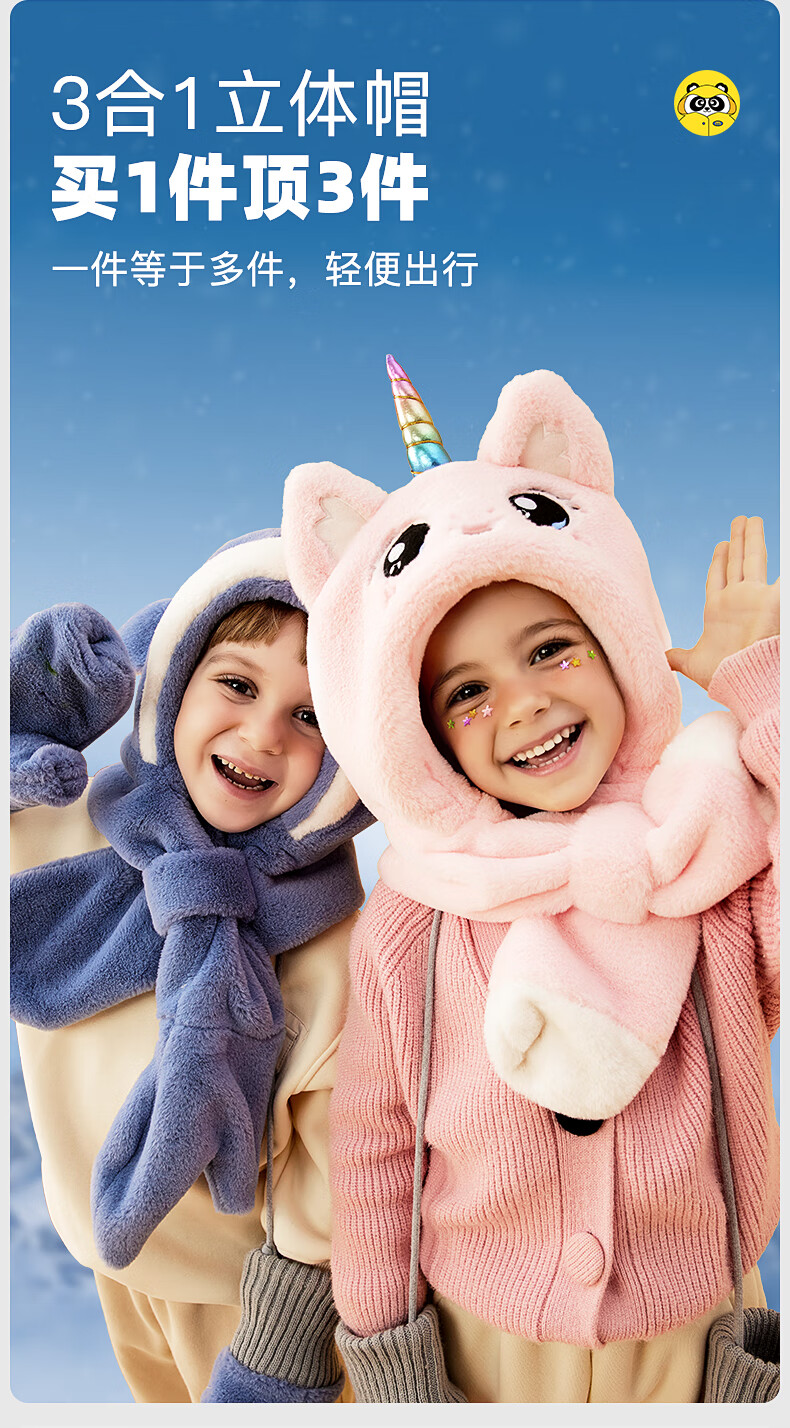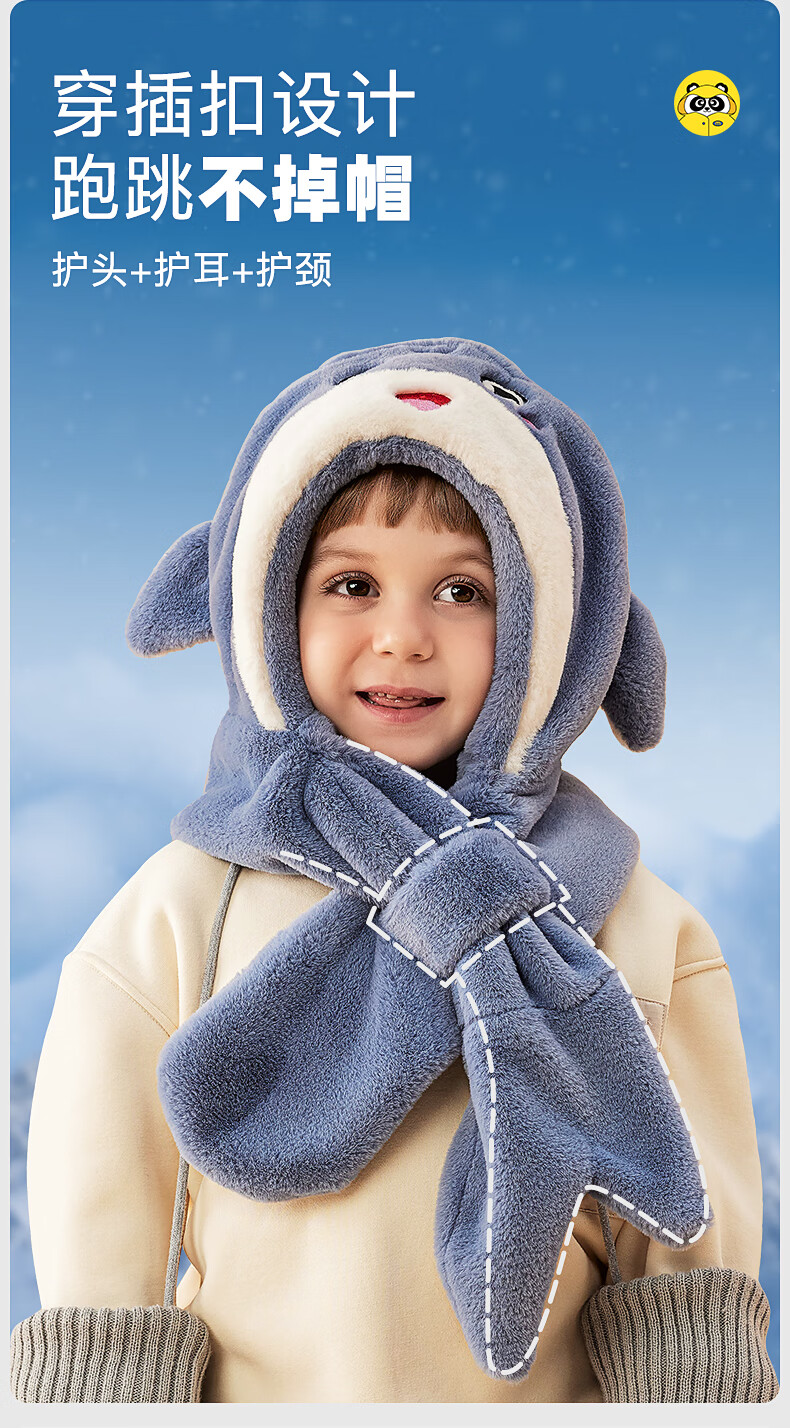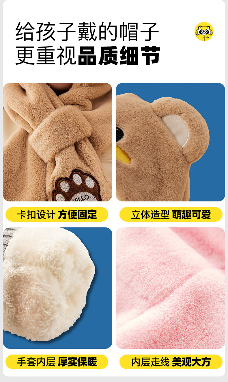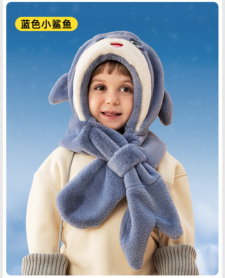 牧萌儿童帽子围巾两件套男童女童冬季加绒加厚一体帽保暖防风帽 黄色萌恐龙【围巾帽手套三件套】 均码【头围50-55cm】适用3-12岁