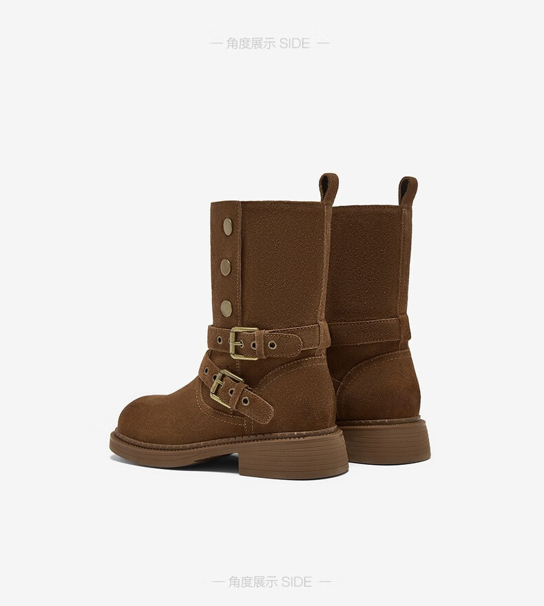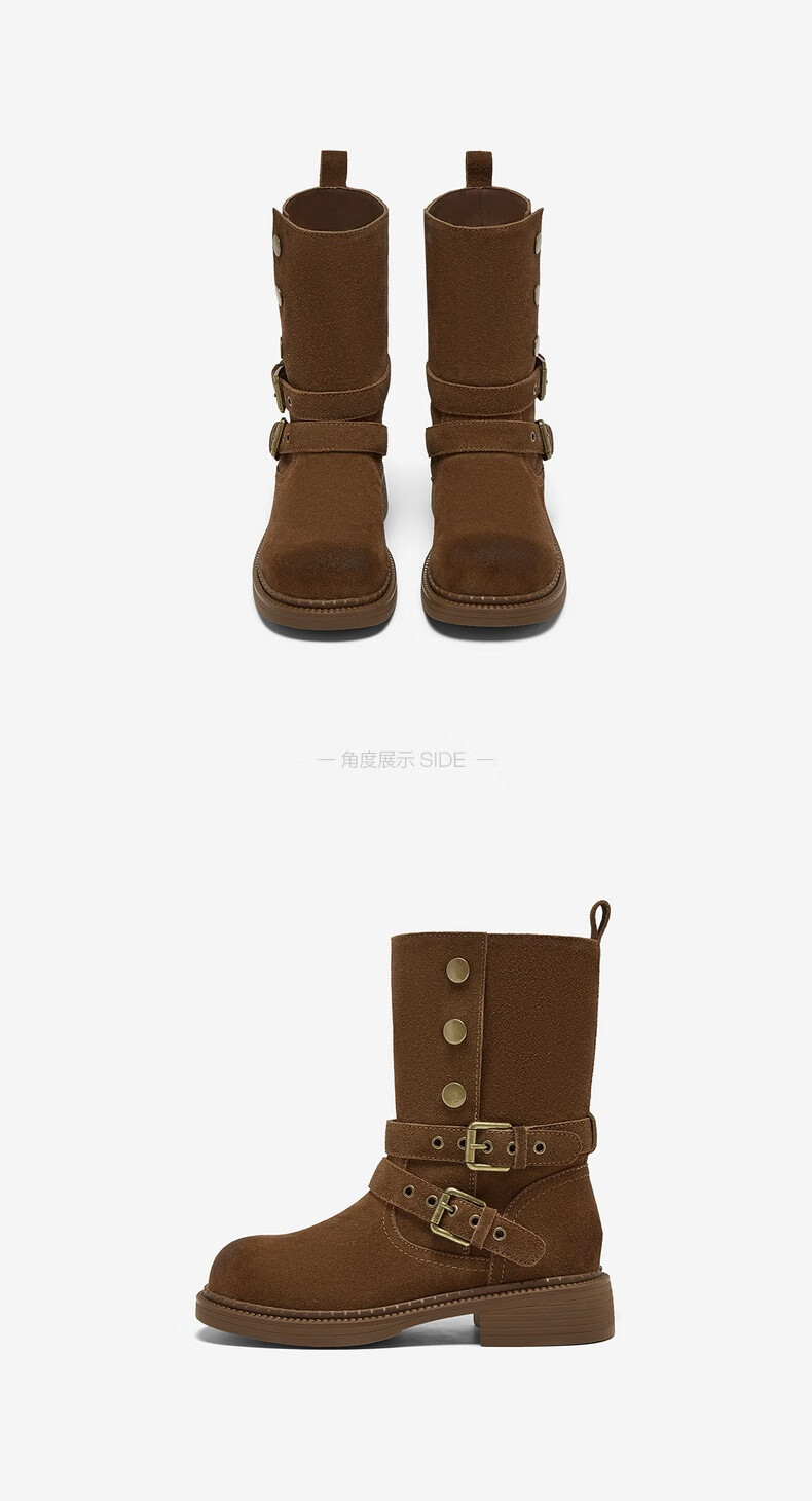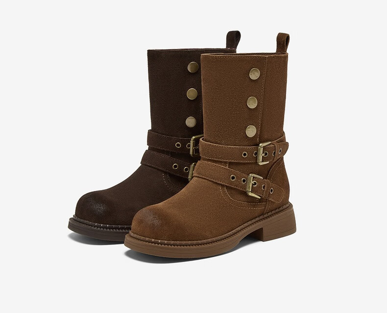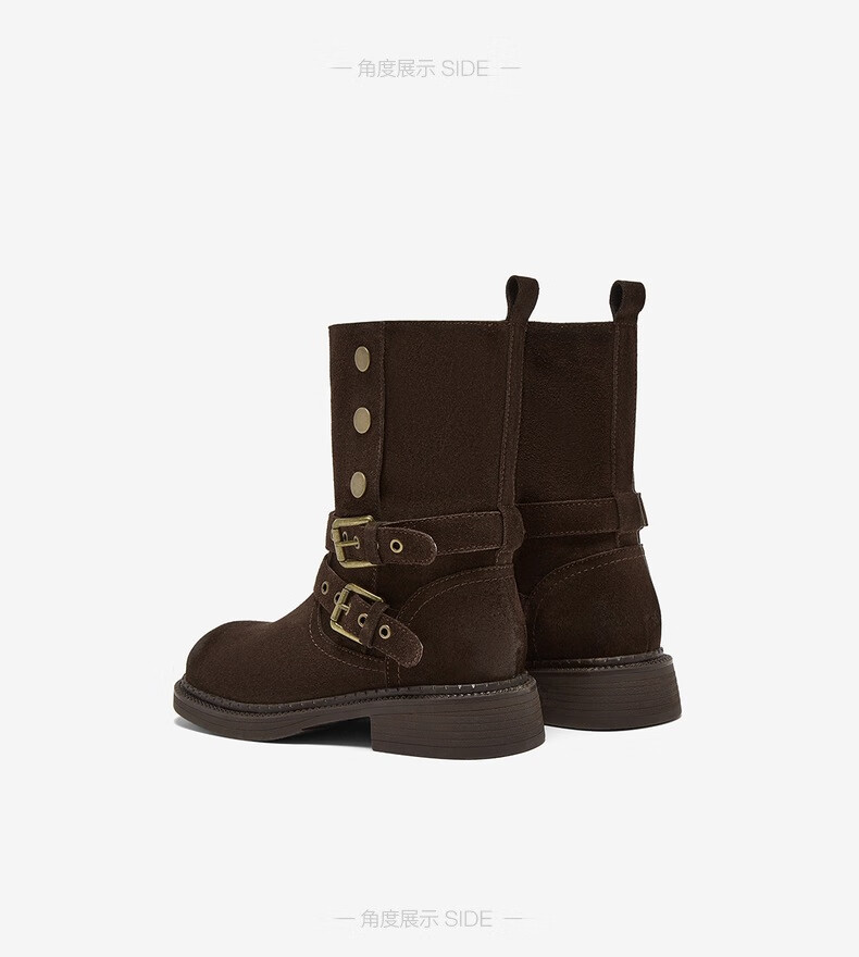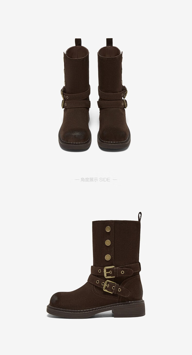 百思图2025冬季新款真皮扣带堆堆靴复古西部靴粗跟女短靴W6888DZ5 啡色 38