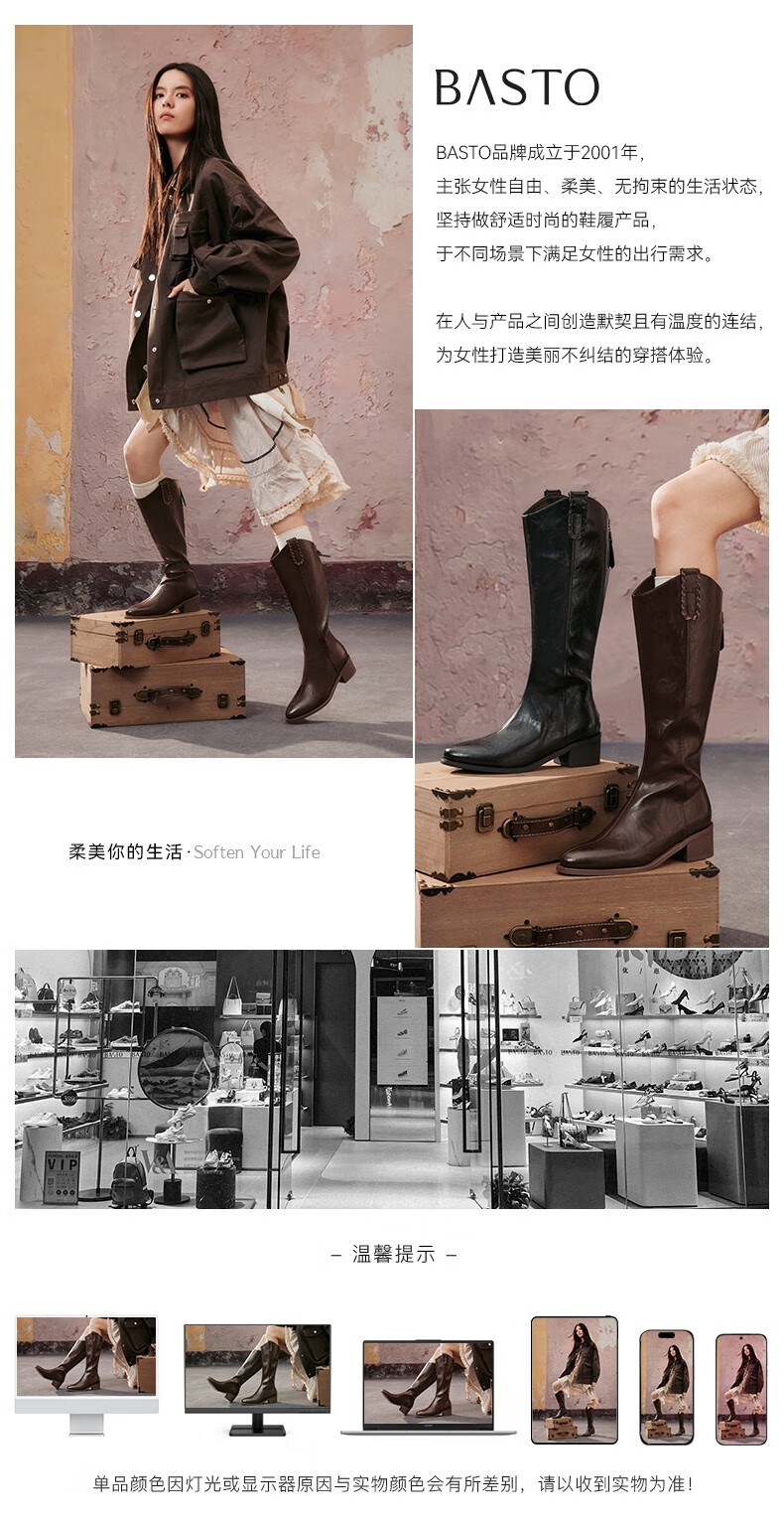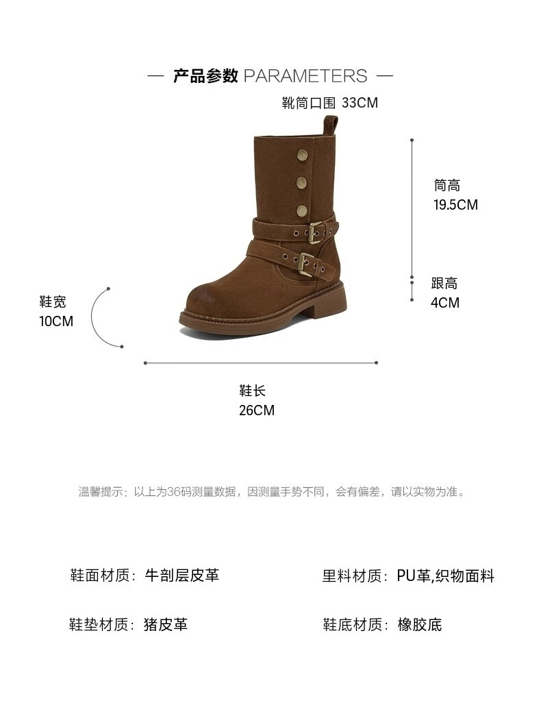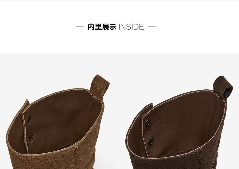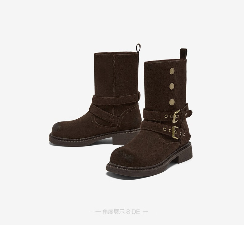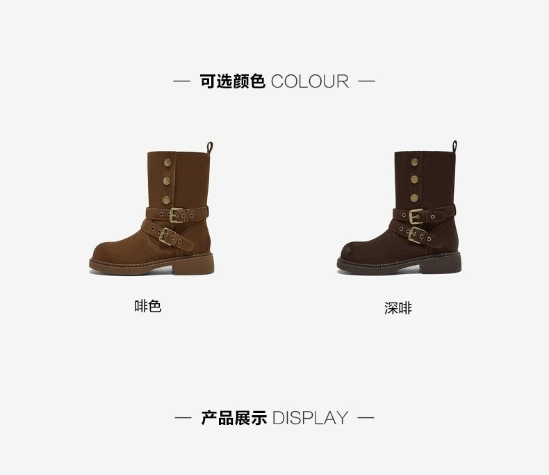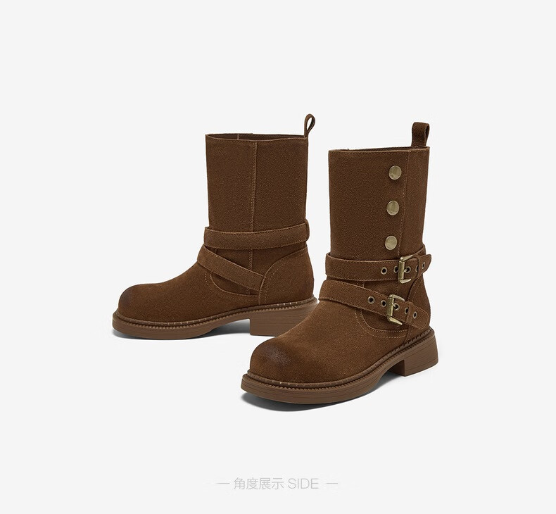 百思图2025冬季新款真皮扣带堆堆靴复古西部靴粗跟女短靴W6888DZ5 啡色 38