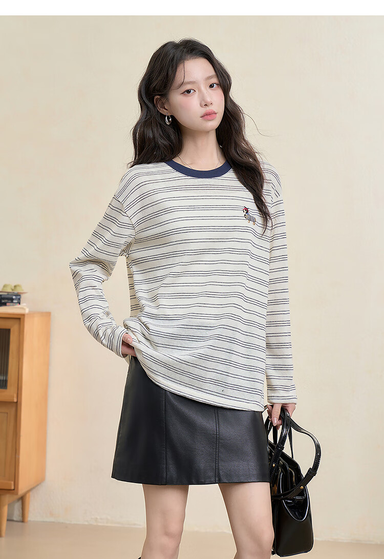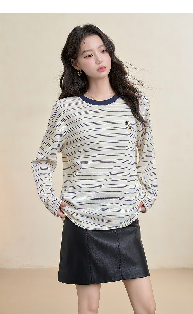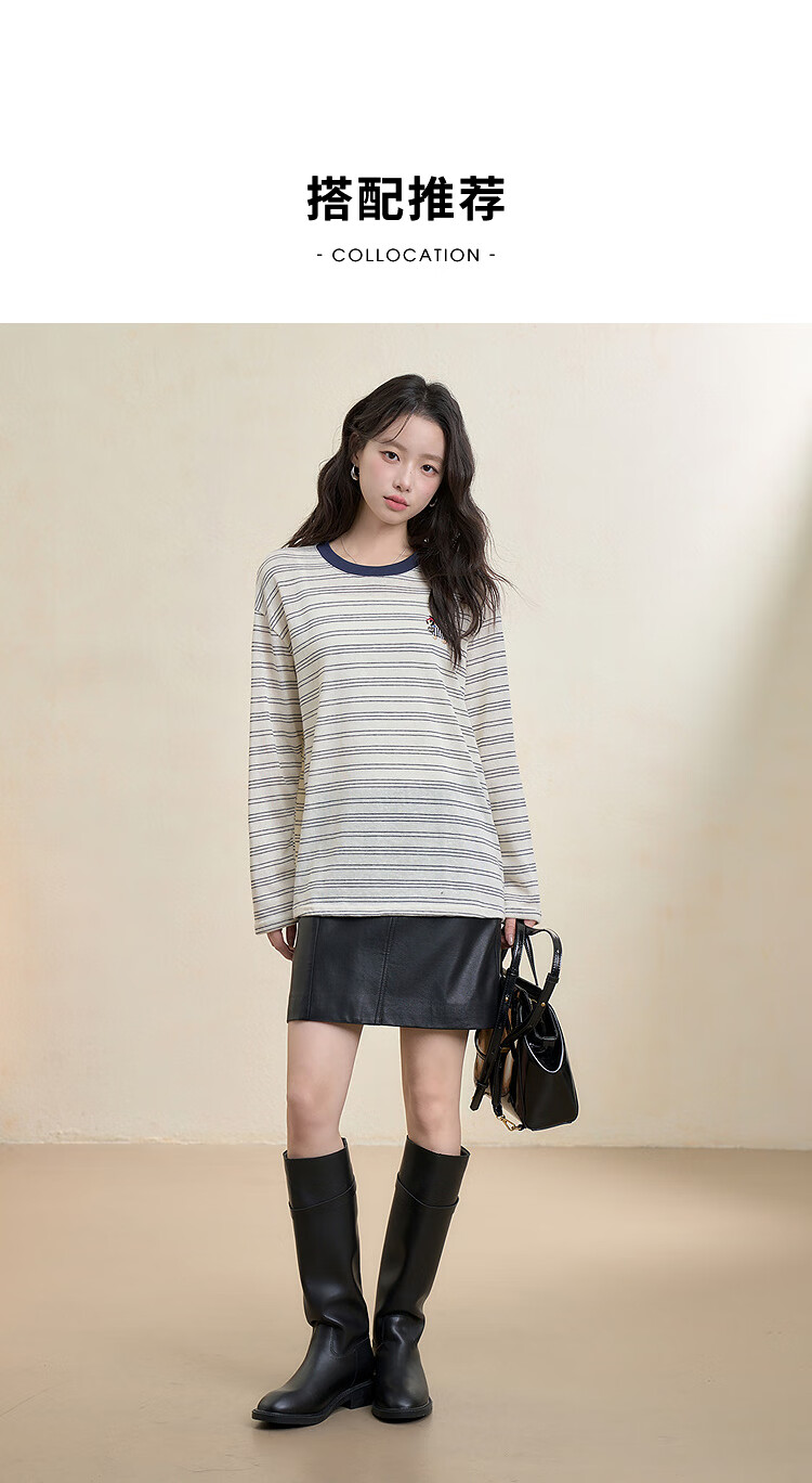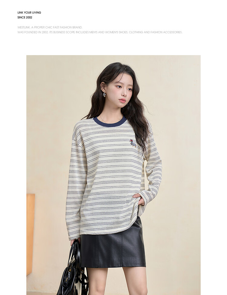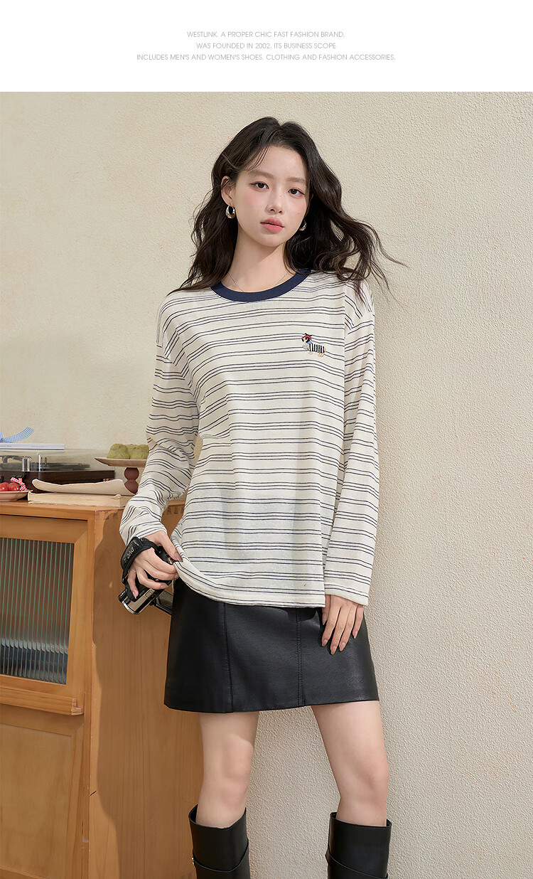 西遇(Westlink)西遇撞色条纹长袖T恤女秋季新款慵懒松弛圆领宽松内搭上衣 杏+蓝色 (预售15天) M (160)
