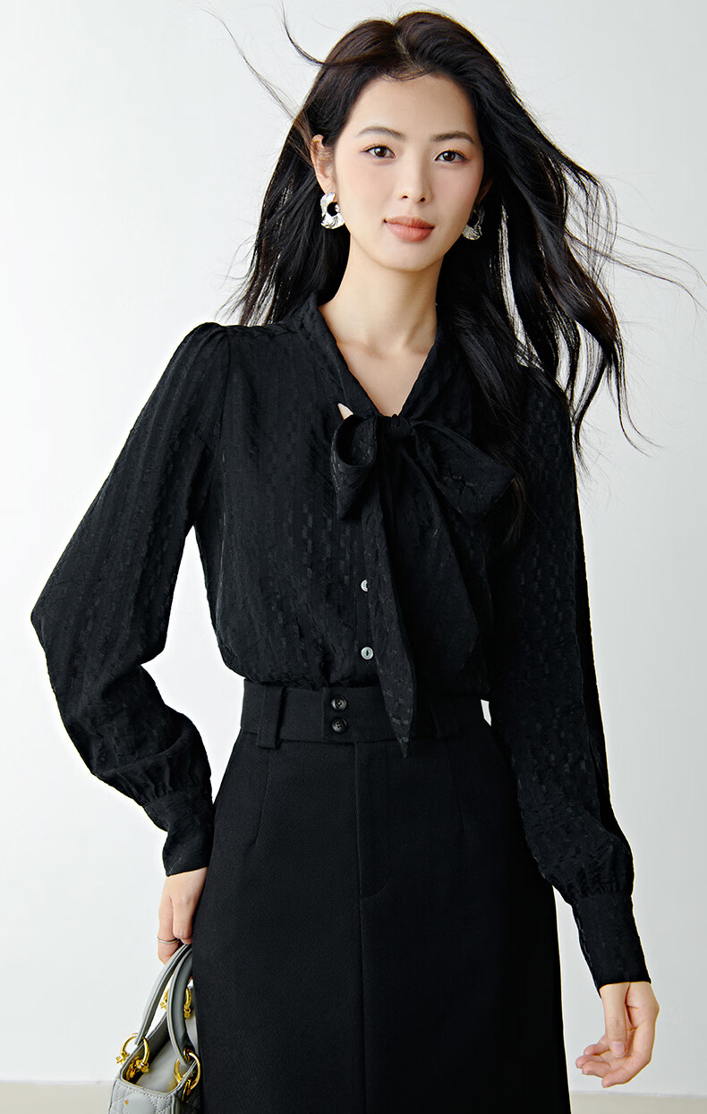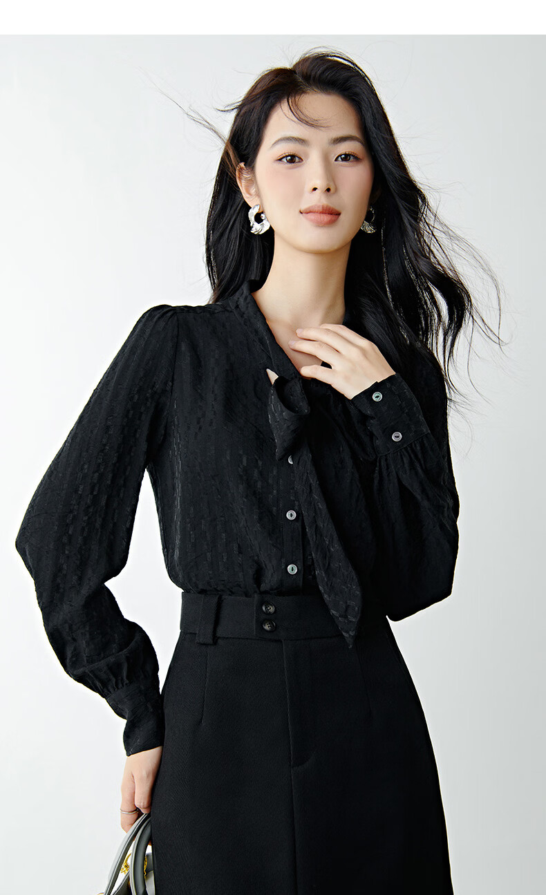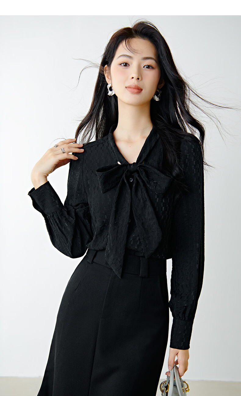 晚白【新品】2026年春款时尚暗纹系带蝴蝶结领上衣垂顺知性通勤衬衫女 黑色 L