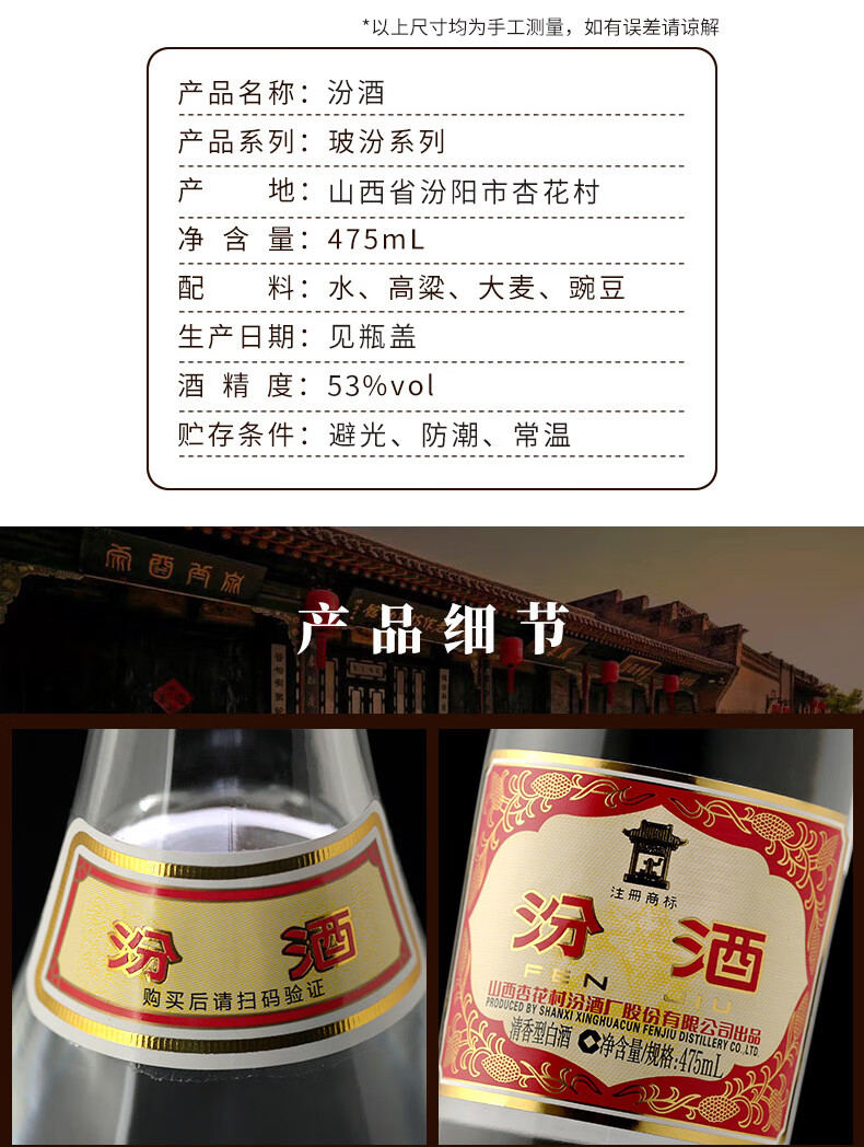 汾酒53度杏花村黄盖玻汾 清香型高度白酒 口粮酒 泡酒 53度 475mL 12瓶