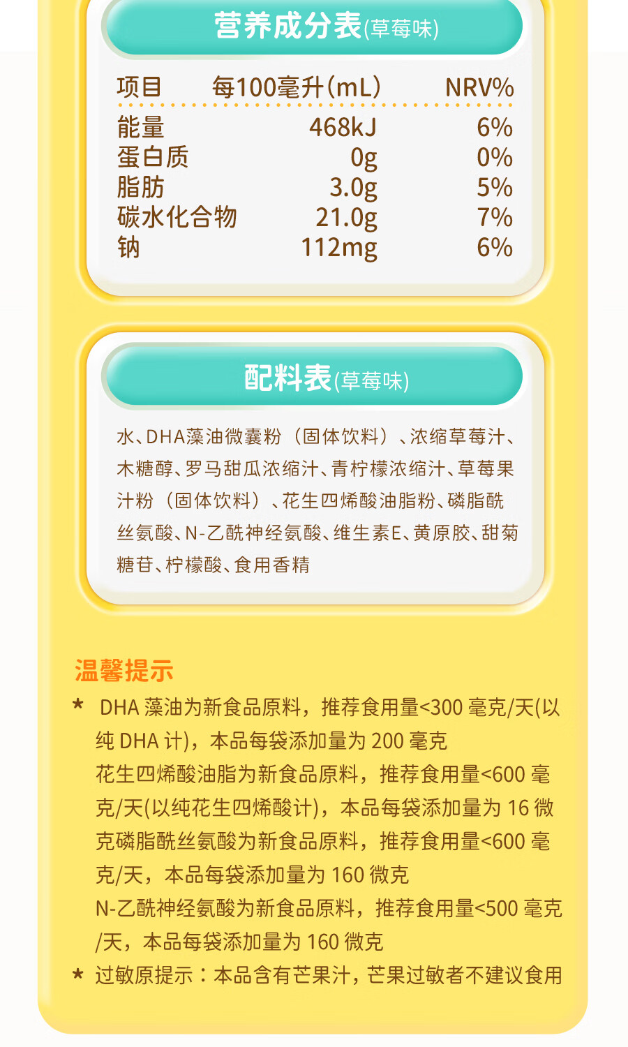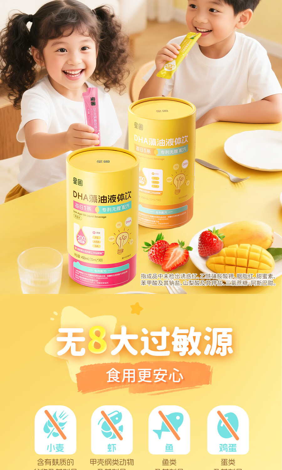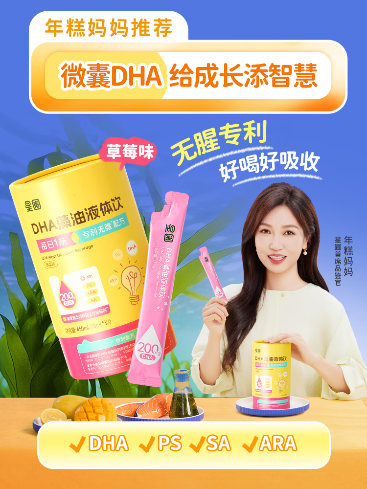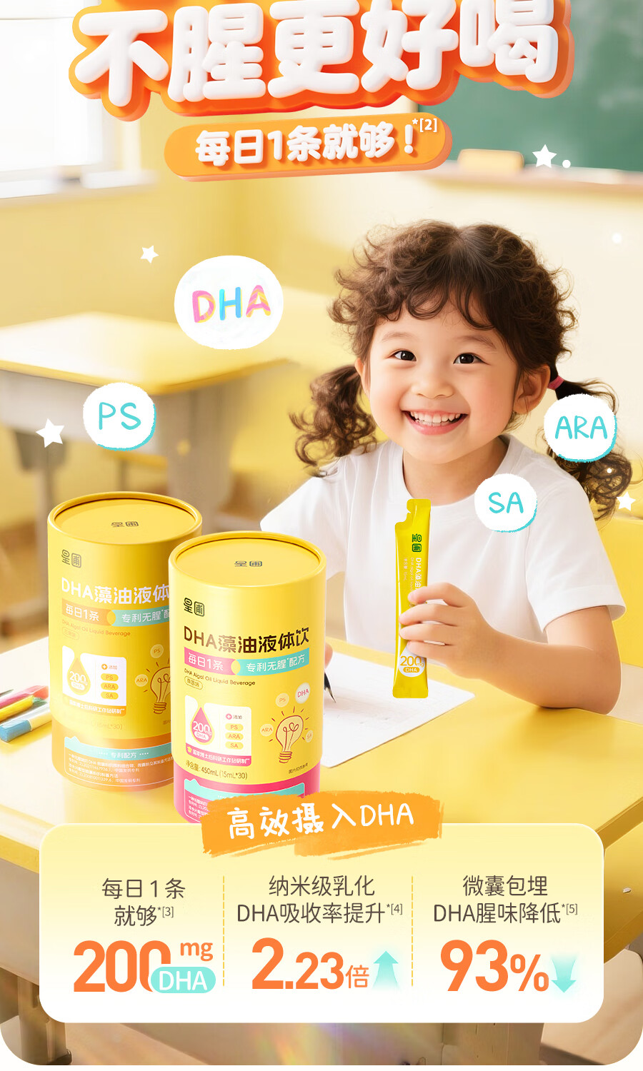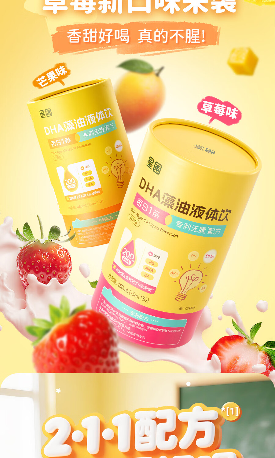 星圃DHA藻油液体饮无腥技术青少年学生专用儿童草莓饮料200mgDHA/条