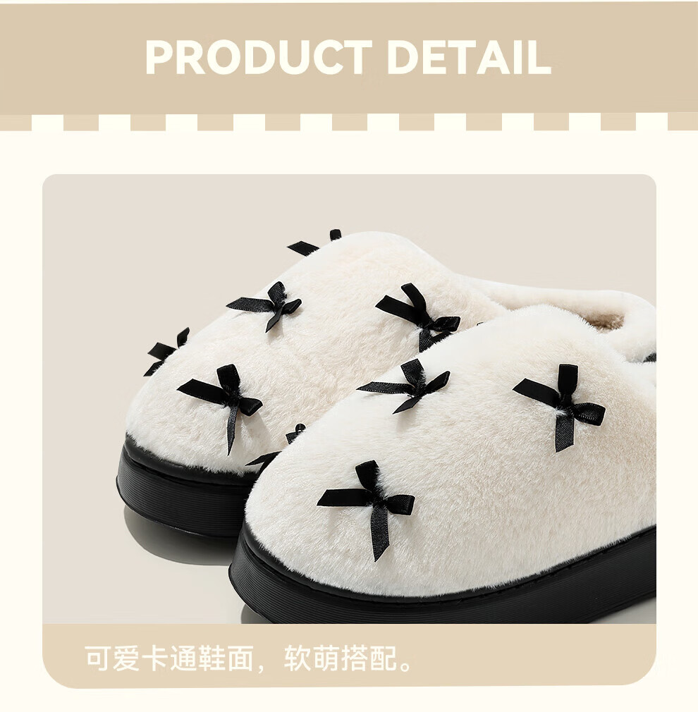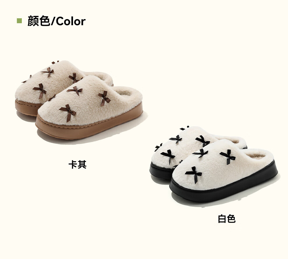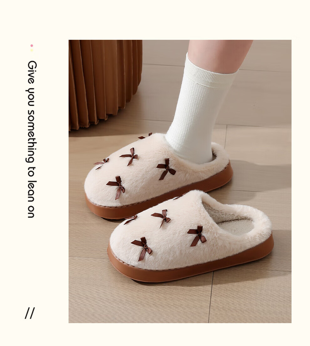 FZT蝴蝶结棉拖鞋女款2025新款冬季室内居家厚底防滑保暖棉拖鞋外穿女 卡其 36-37 标准码