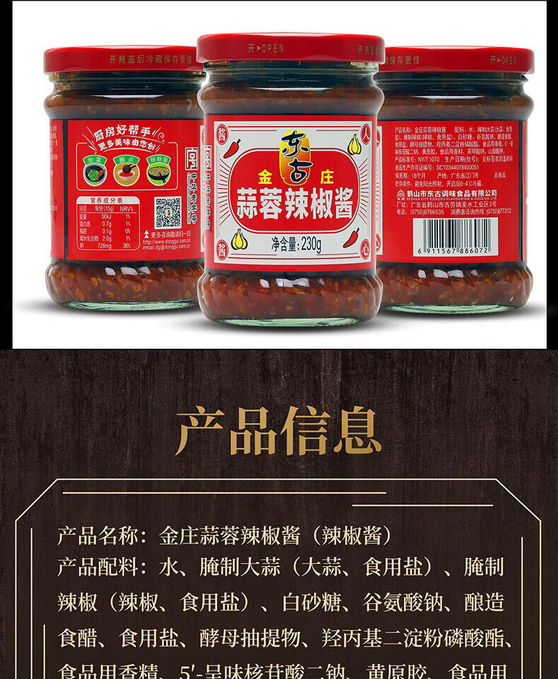 东古蒜蓉辣椒酱金庄蒜蓉辣酱鹤山香格辣拌饭酱调味火锅蘸料230g 经典蒜蓉辣椒酱230gX一瓶
