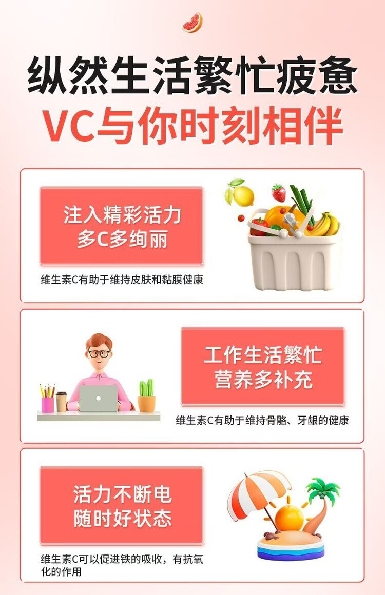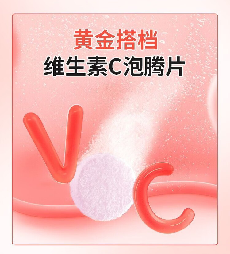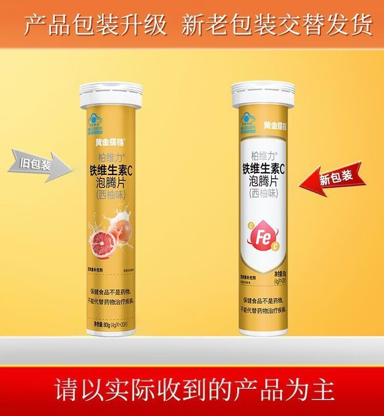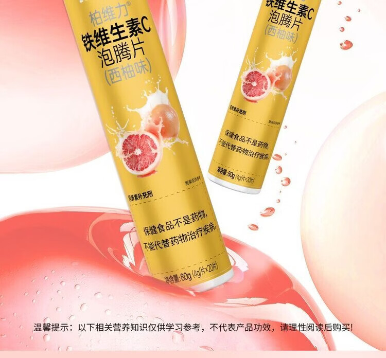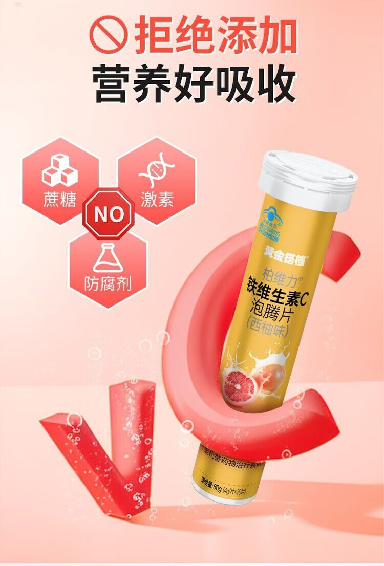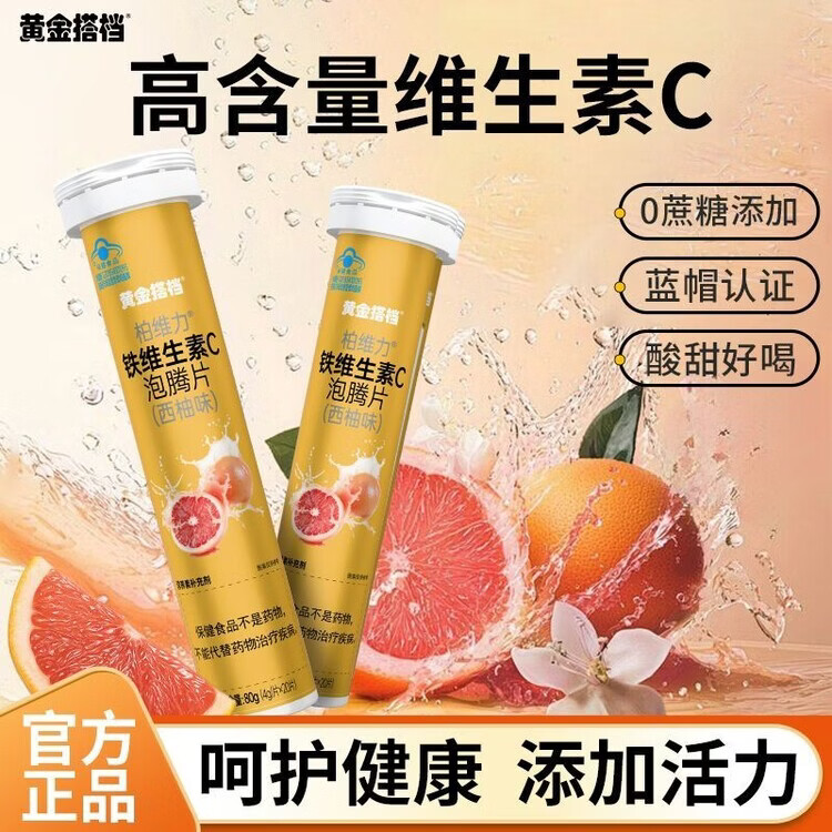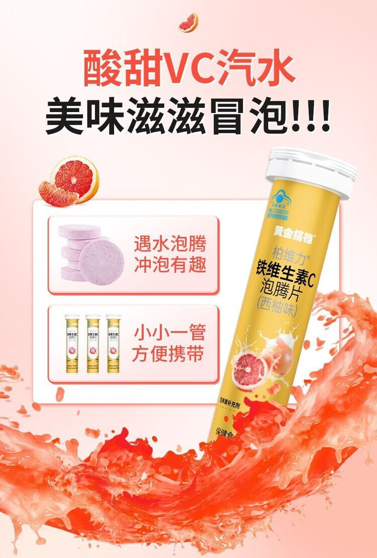 黄金搭档铁维生素C泡腾片20片水果味饮料儿童成人补充铁维生素C 西柚味 20片*3支-【家庭分享装】