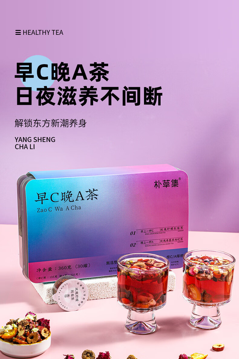 朴草集早C晚A茶 刺梨玫瑰柠檬早C茶 桑葚黑枸杞玫瑰晚A茶小罐礼盒养生茶 360g*1盒 早C茶135克 晚A茶225克 无硫熏无添加 草本原材料