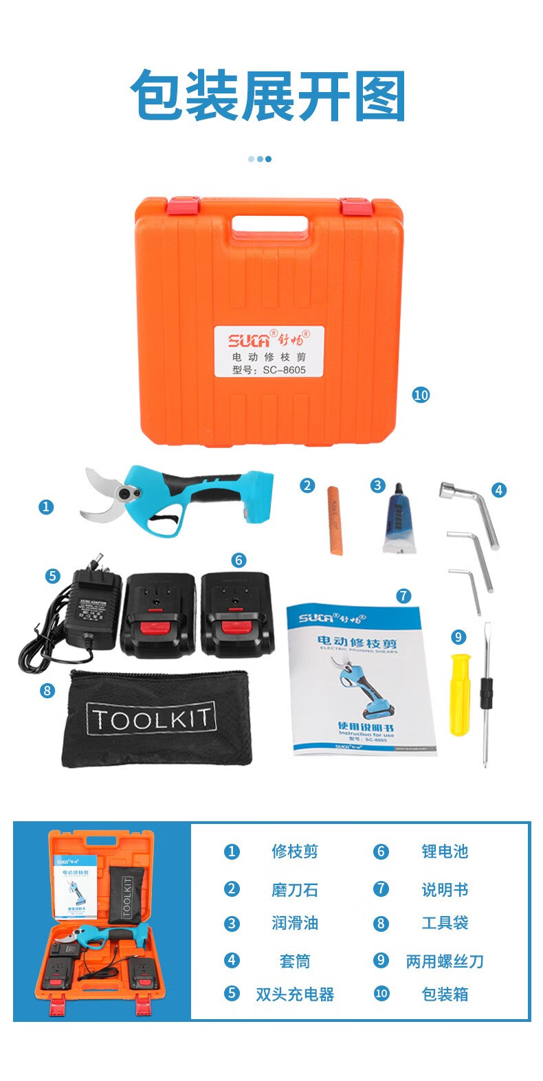 舒畅精品电动剪刀果树修枝剪充电式强力园林锂电剪刀粗枝剪树枝电 8603舒畅剪刀二电一充