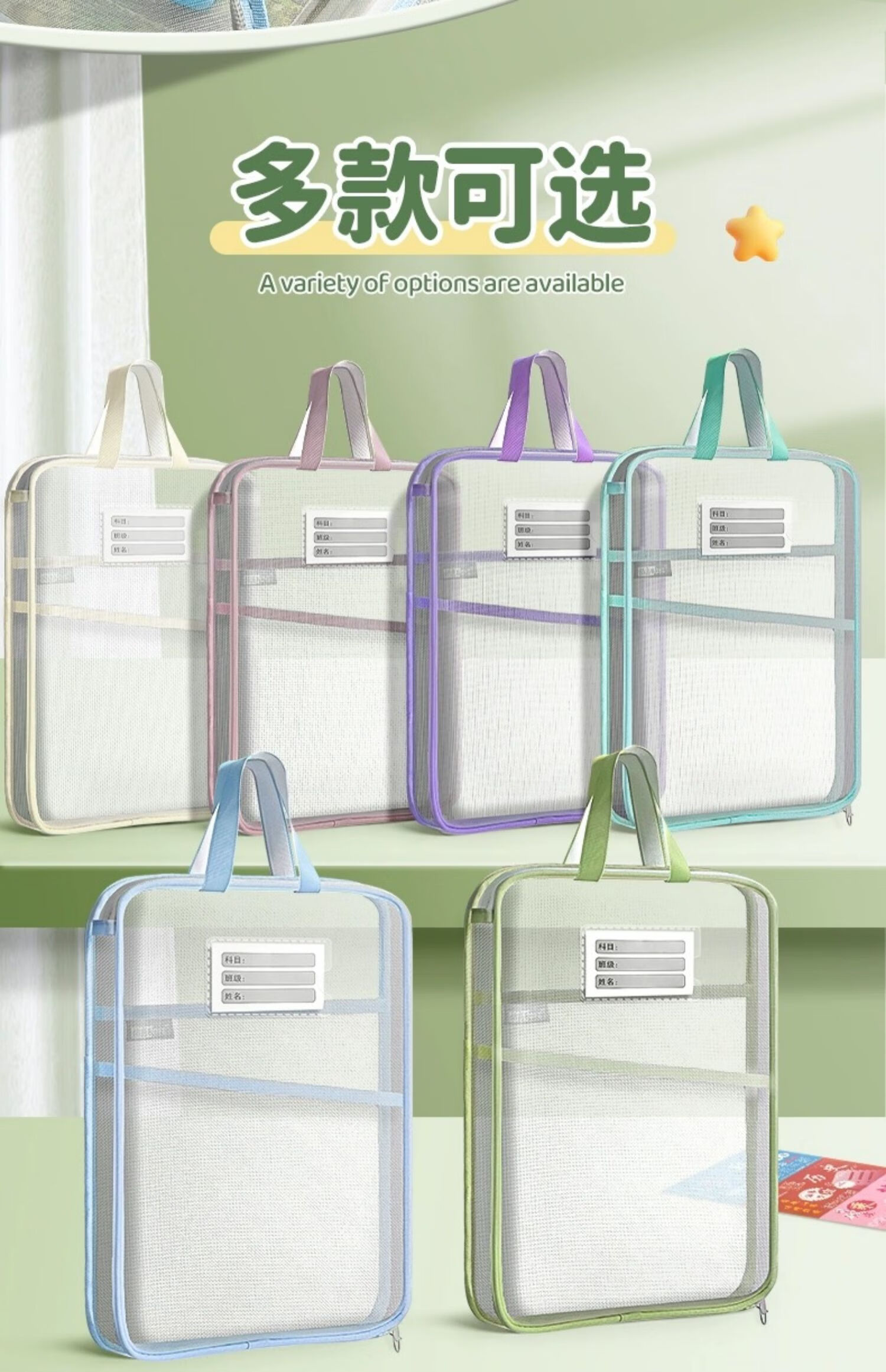 西语L型科目分类袋文件袋小学生学科分类袋小学生文具袋一年级文件夹科目袋透明文件袋初中生试卷收纳 【全色系6个装】粉+蓝+紫+黄+浅绿+深绿