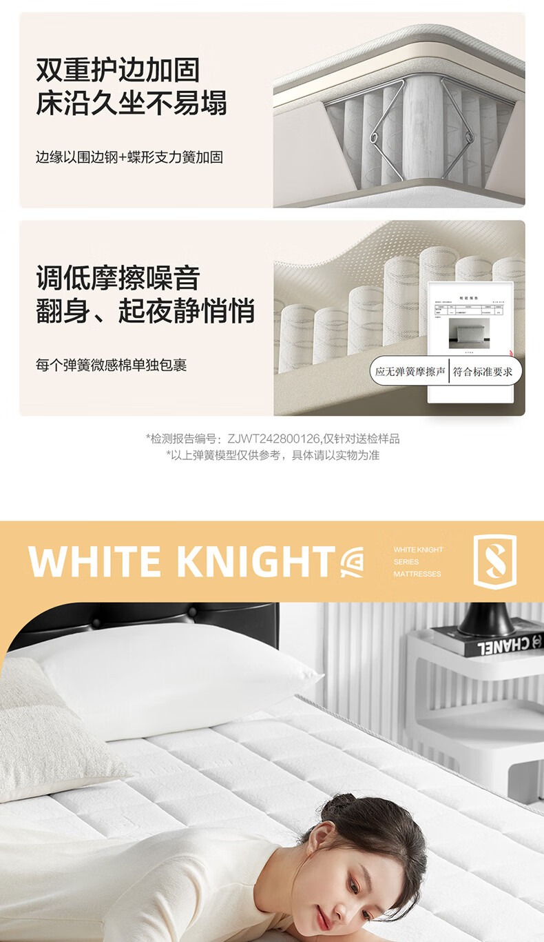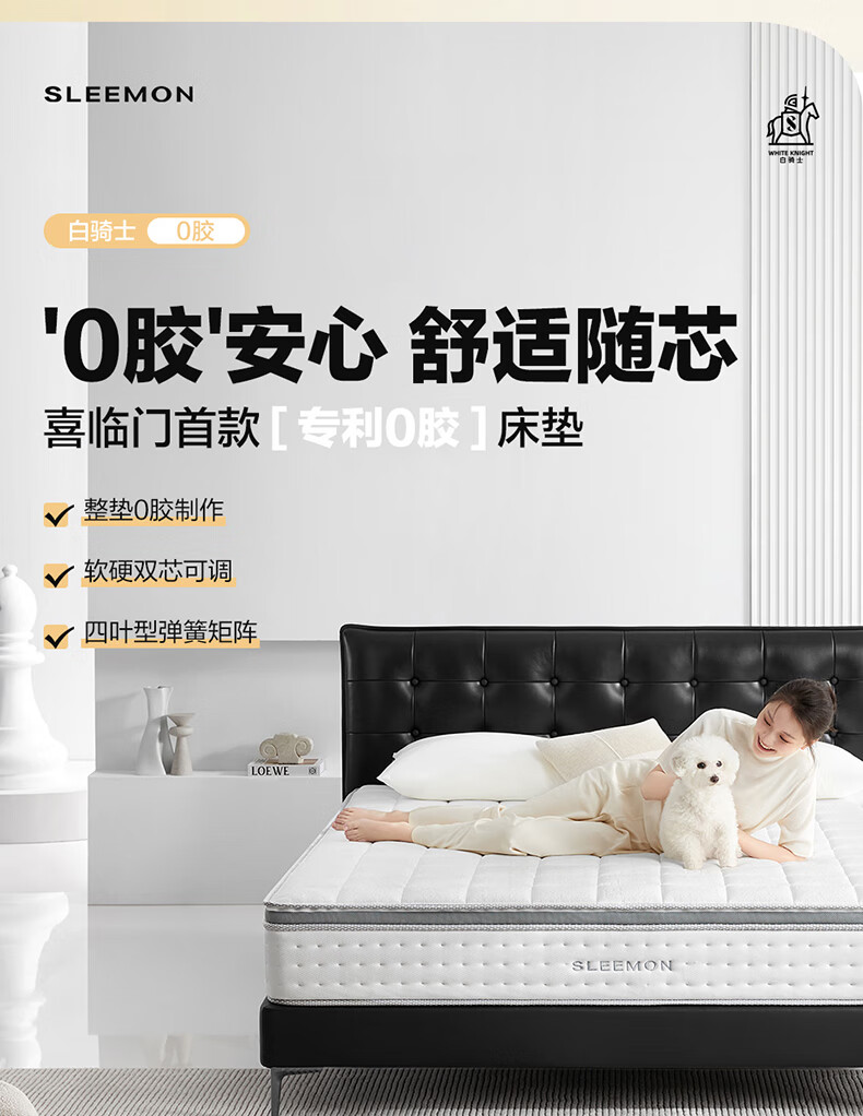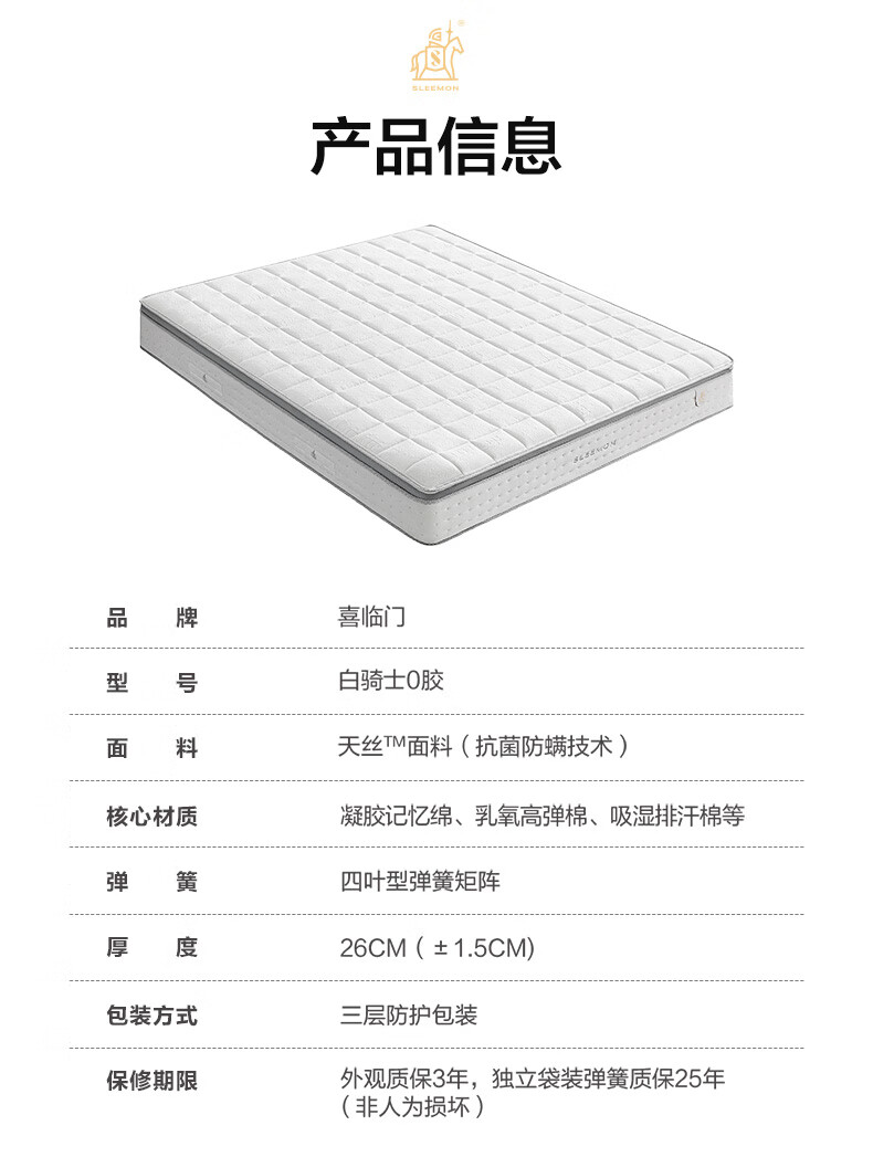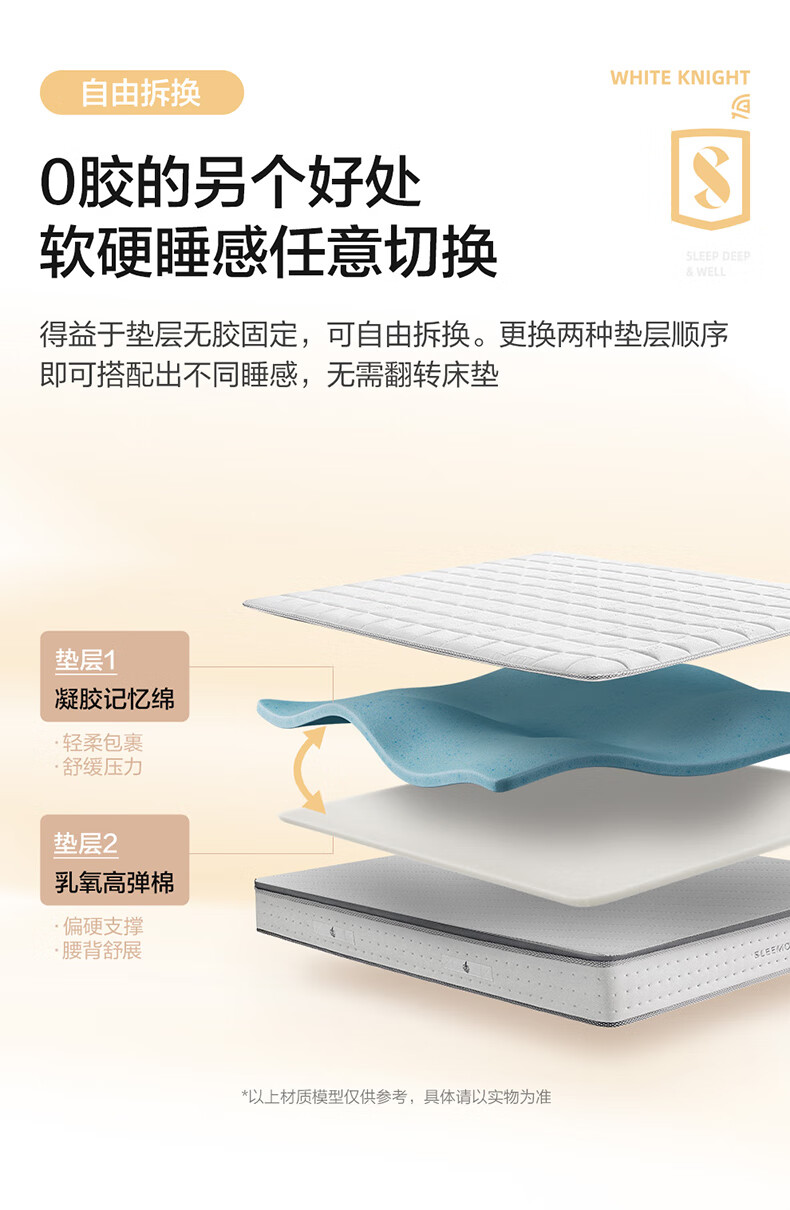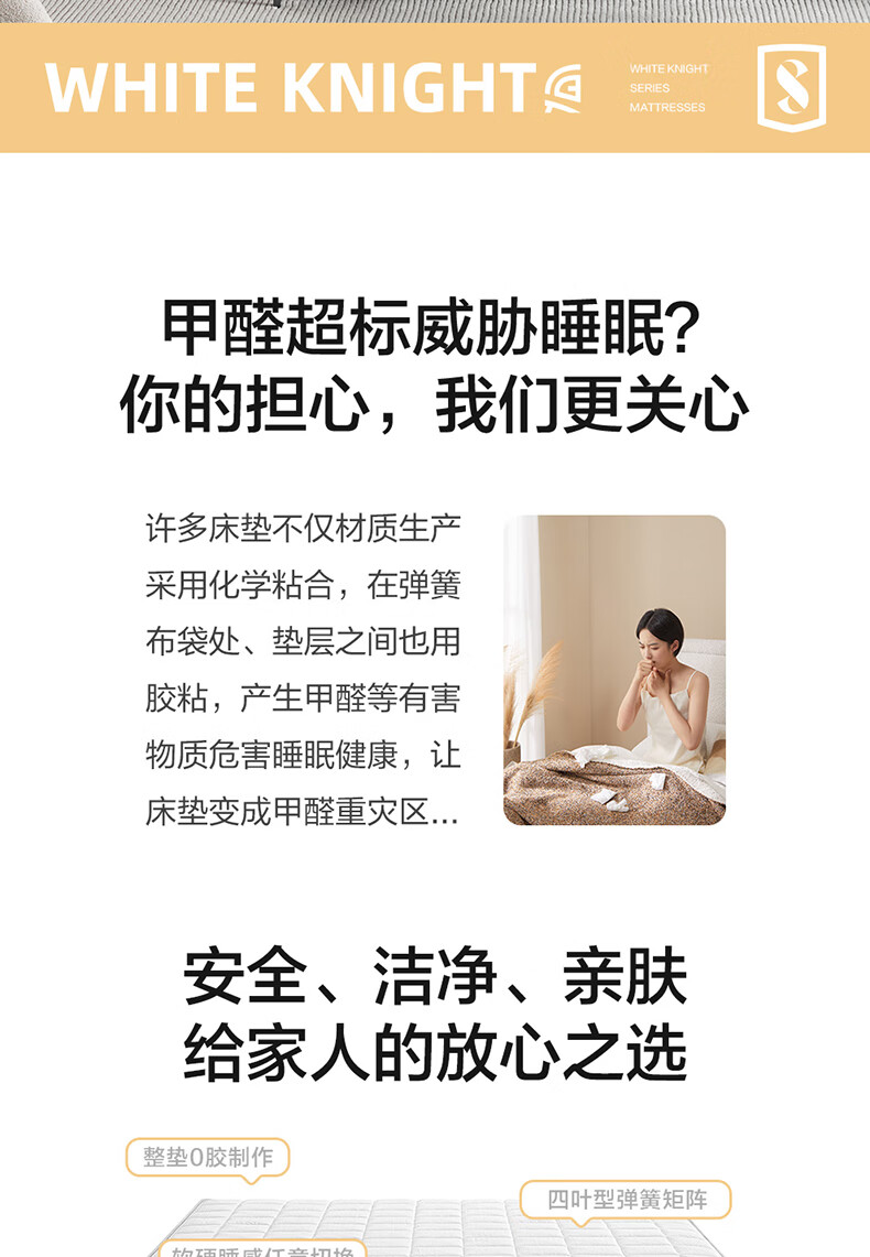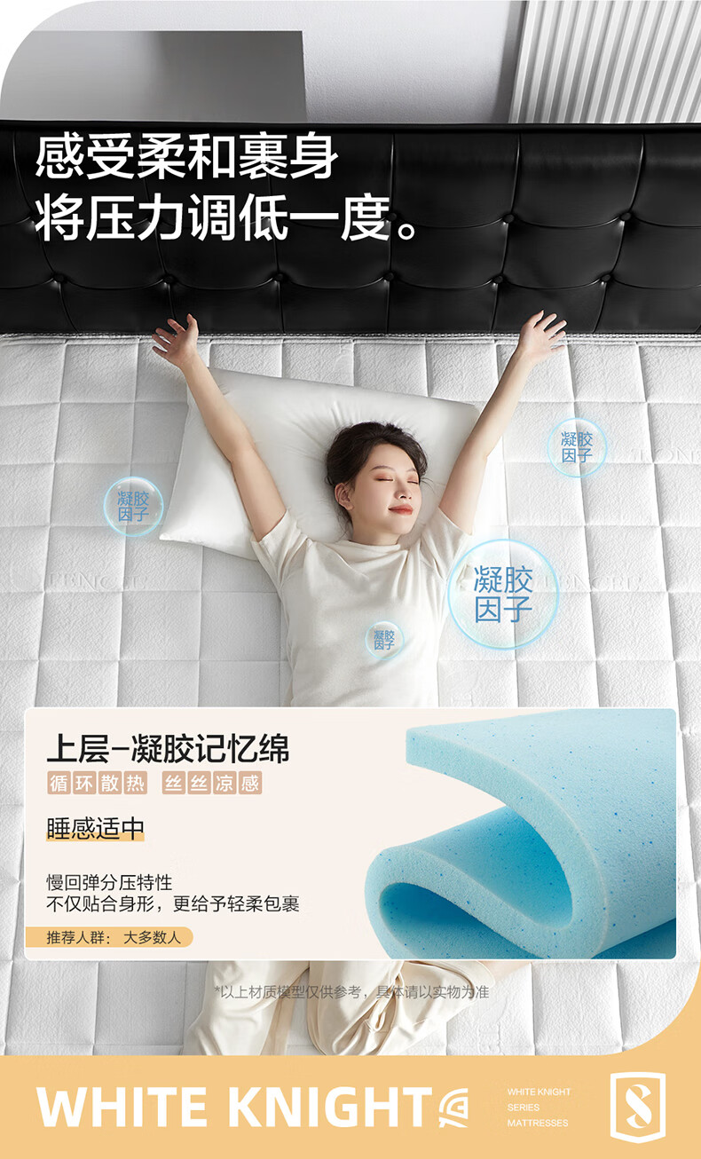 喜临门白骑士0胶 凝胶记忆棉四叶型弹簧矩阵可拆换床垫1.8x2米 软硬可调