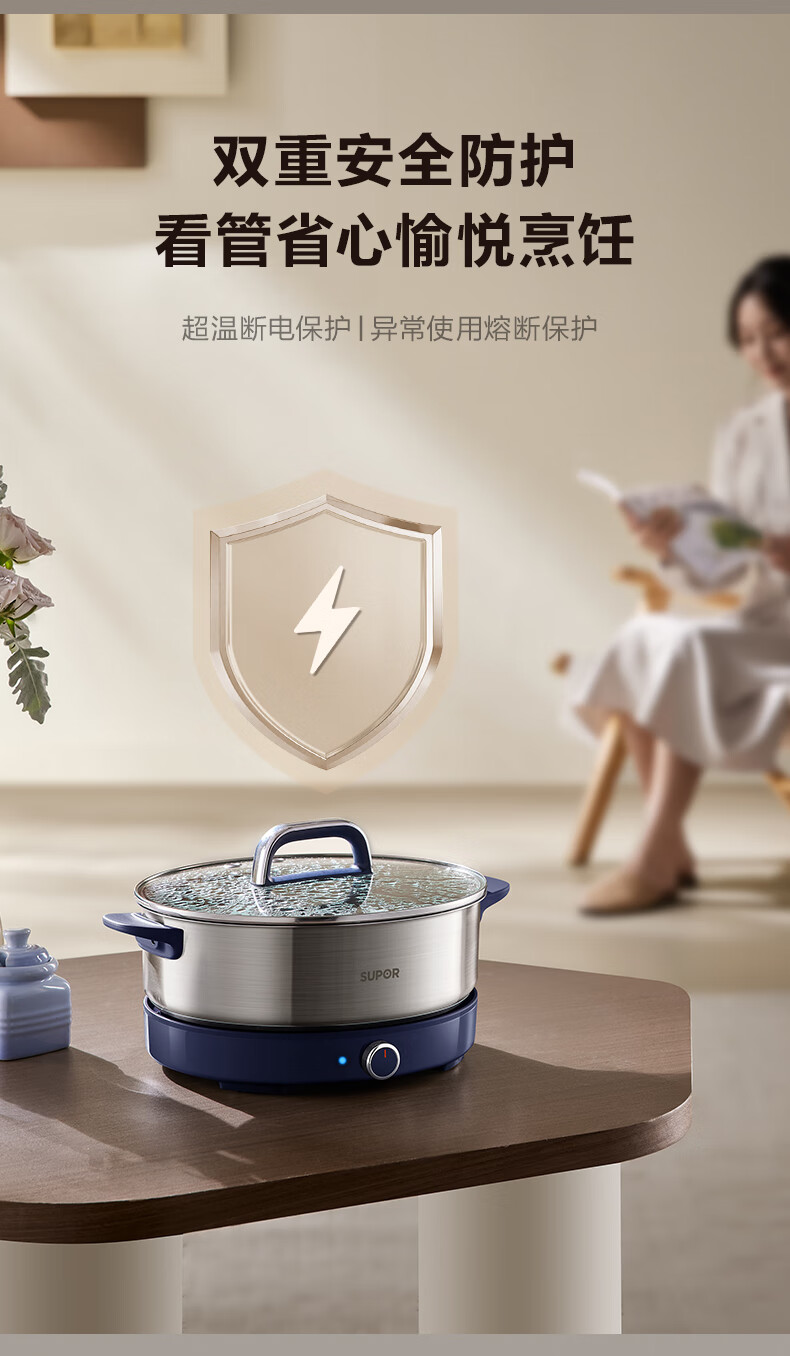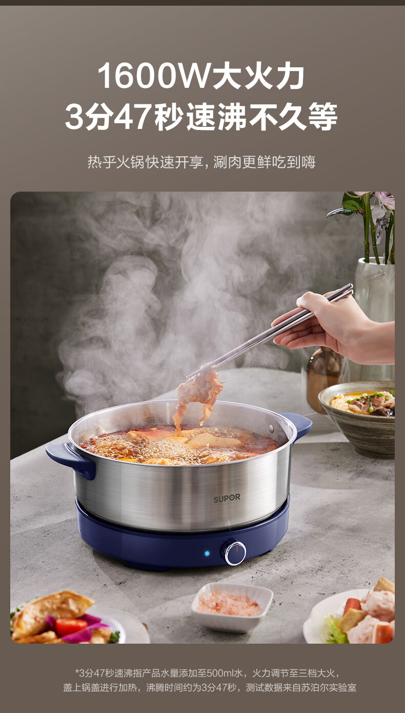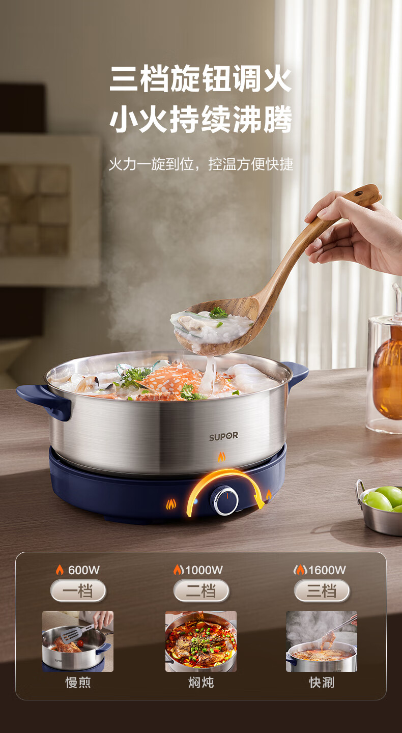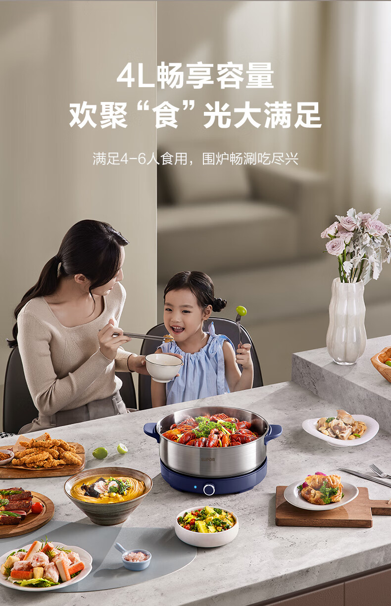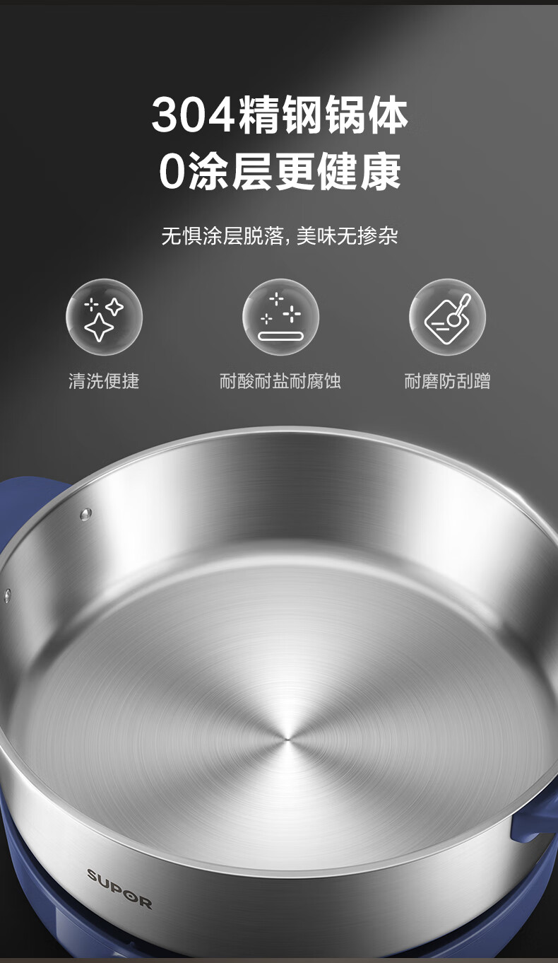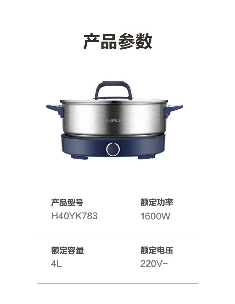 苏泊尔(SUPOR)0涂层不锈钢电火锅 超薄速沸电煮锅 火锅专用锅 家用多功能分体电热锅 4L涮肉多用途H40YK783