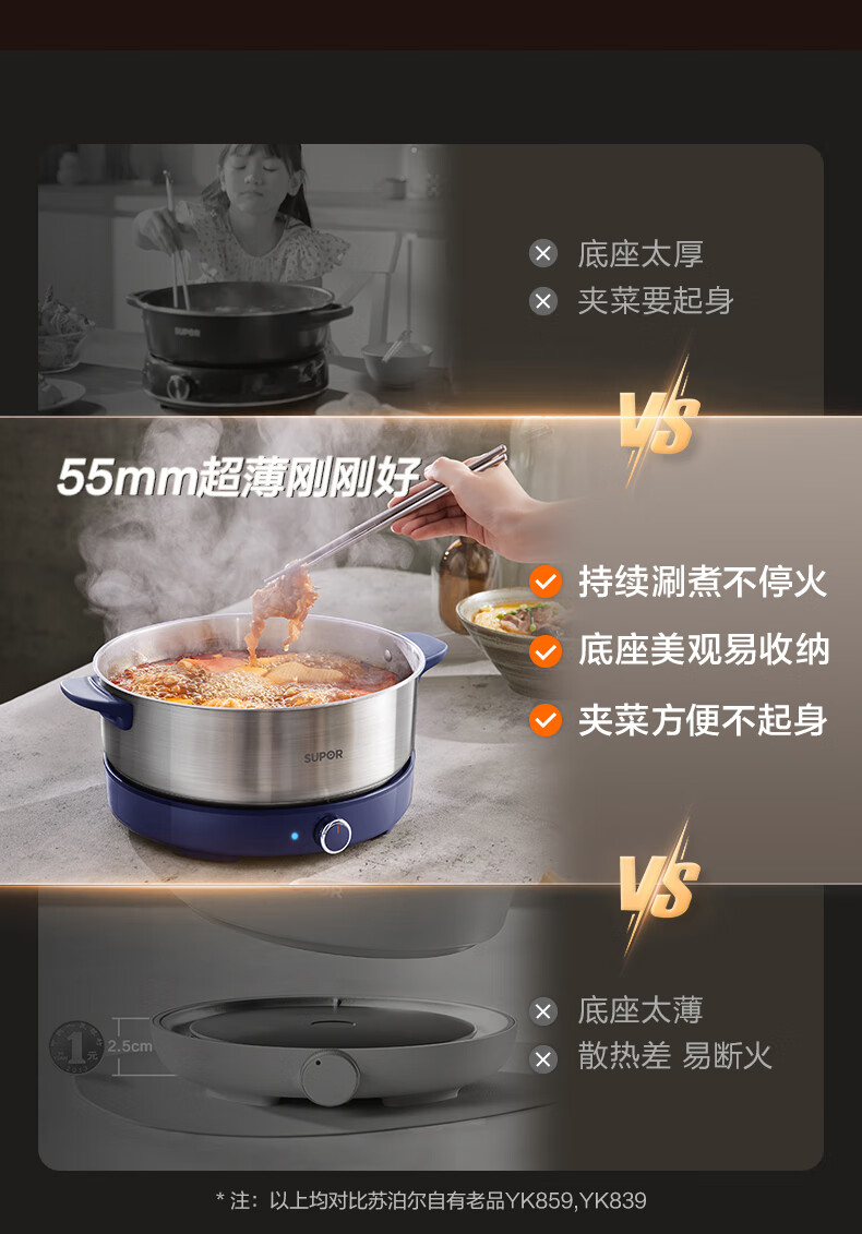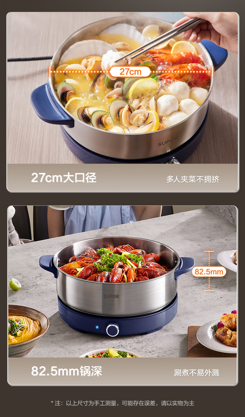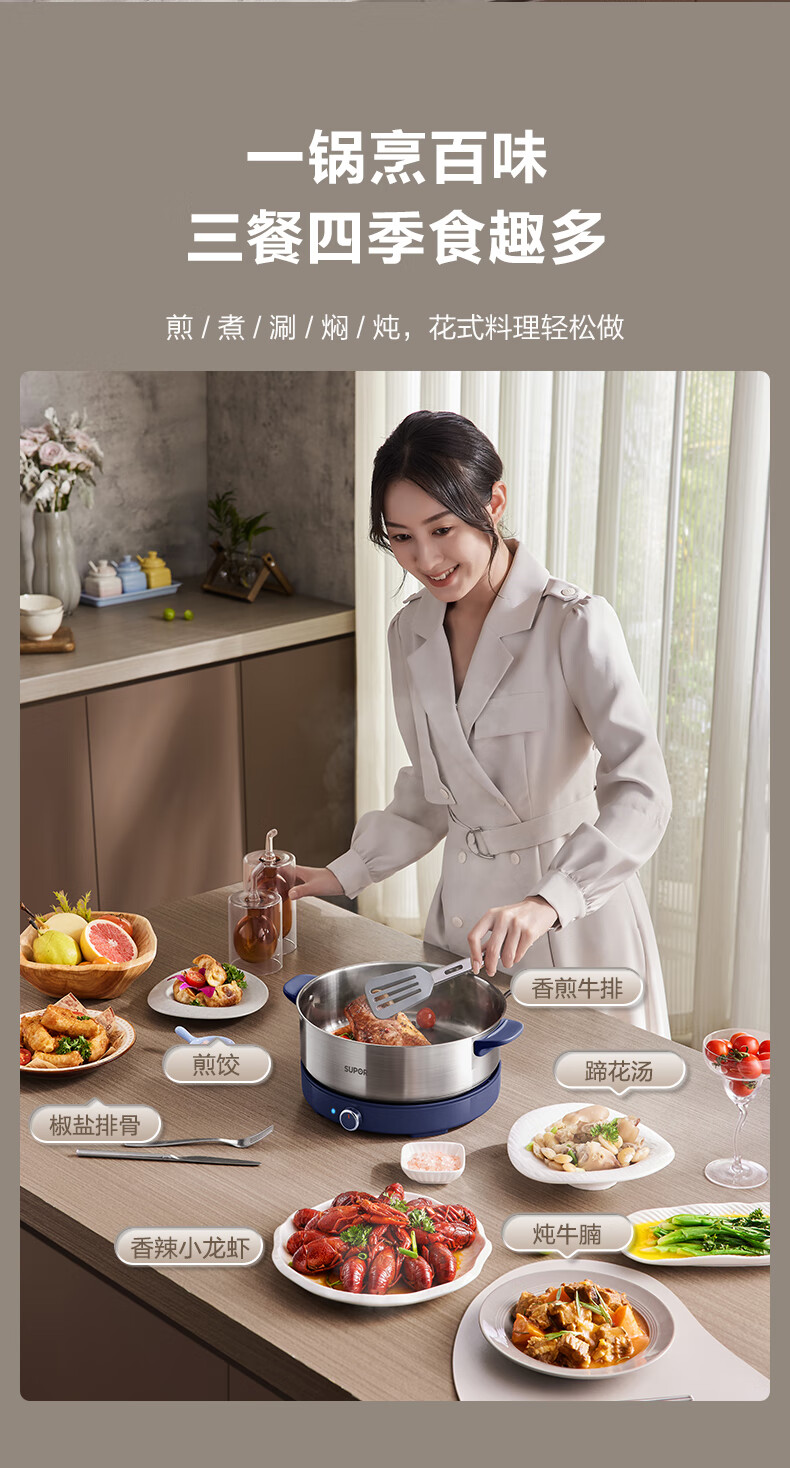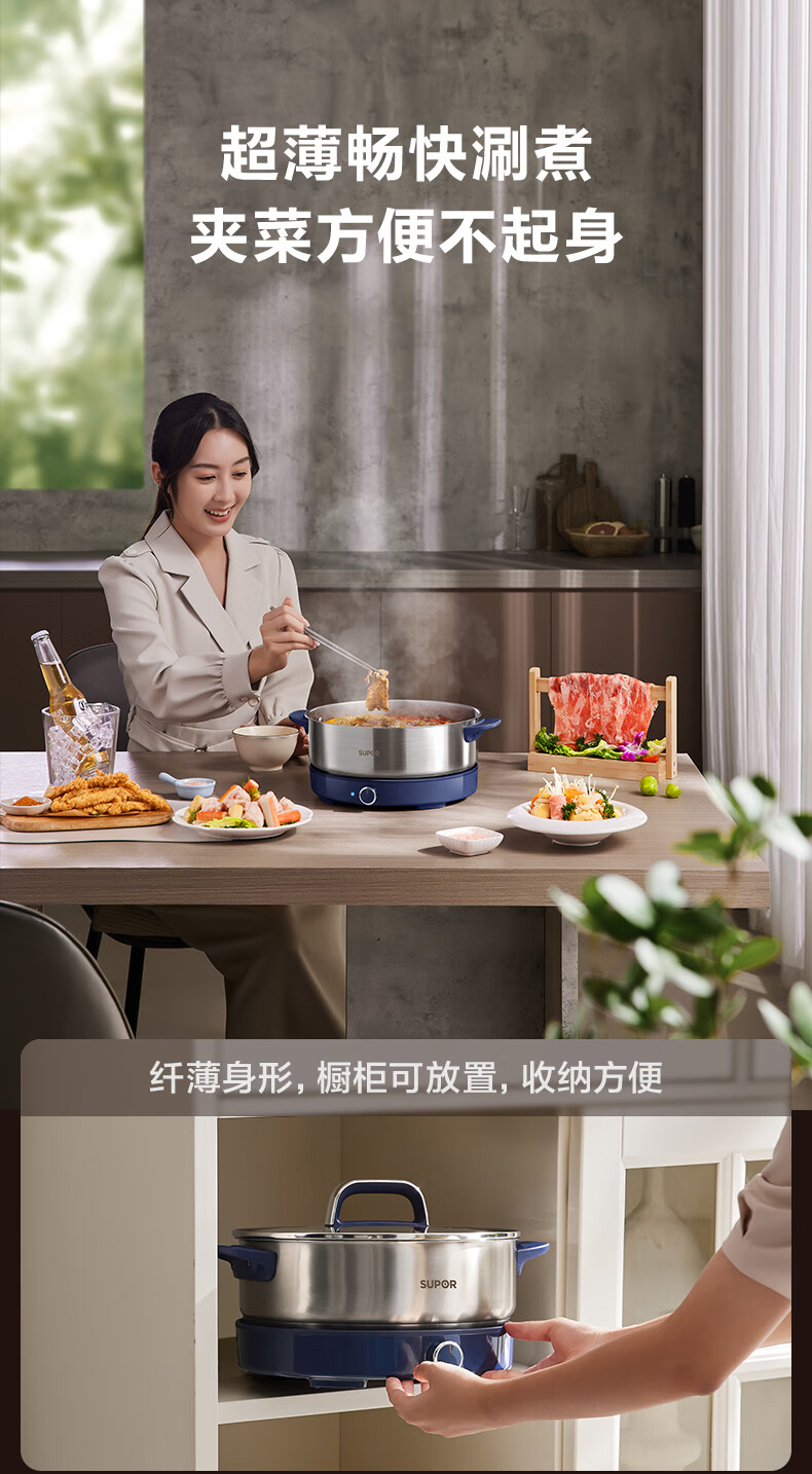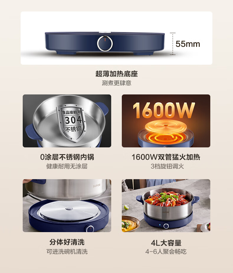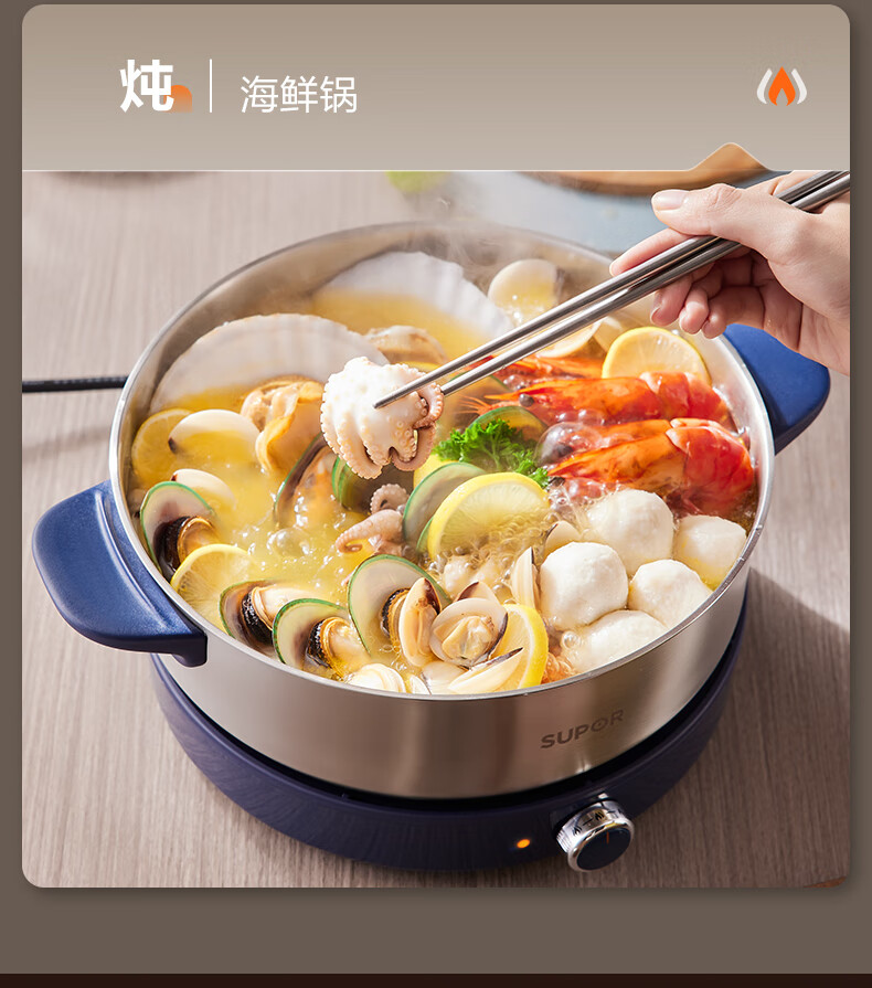 苏泊尔(SUPOR)0涂层不锈钢电火锅 超薄速沸电煮锅 火锅专用锅 家用多功能分体电热锅 4L涮肉多用途H40YK783