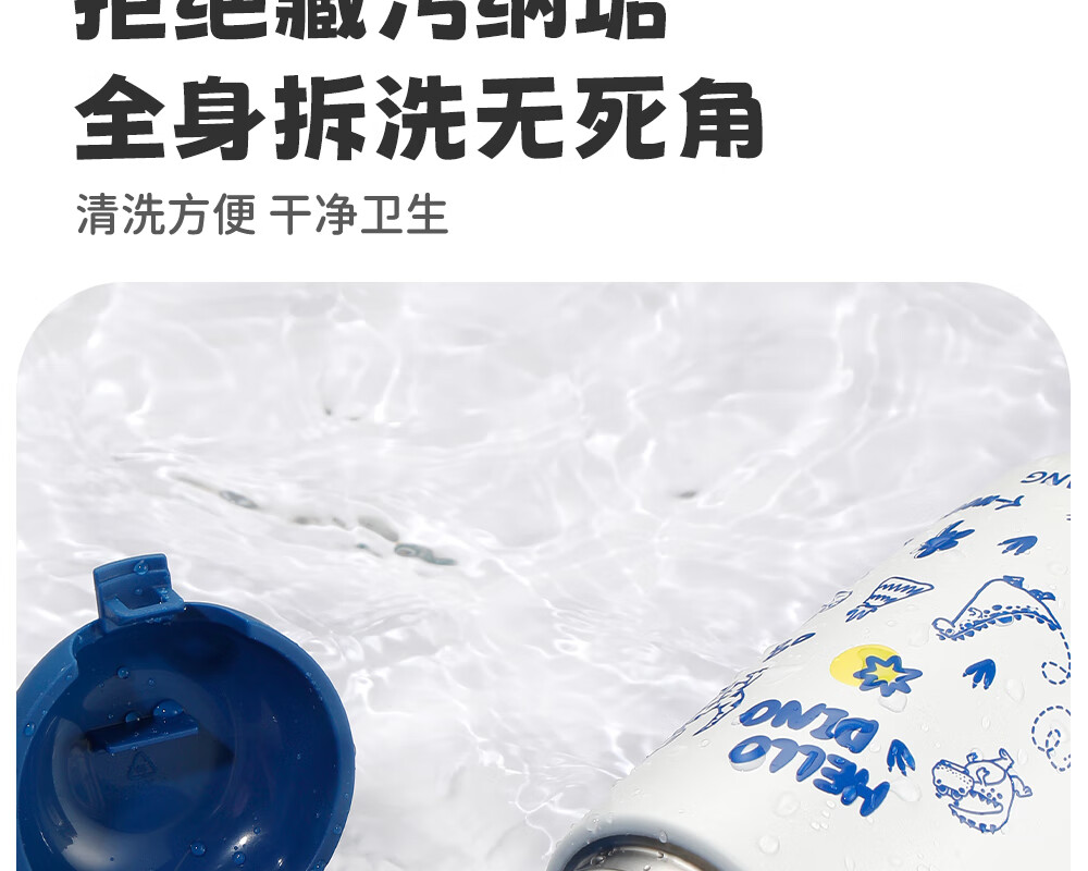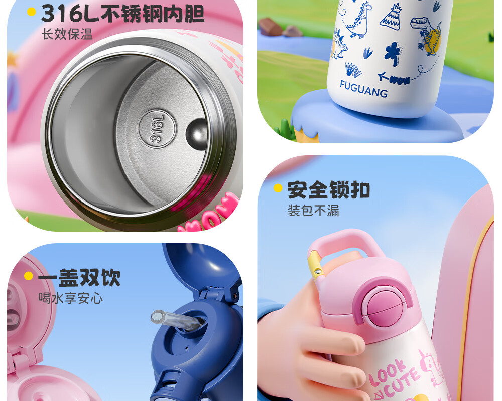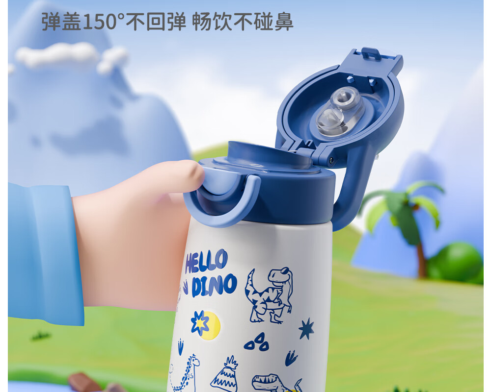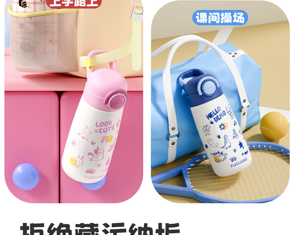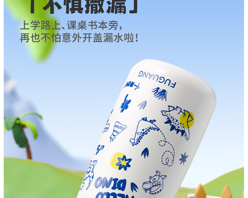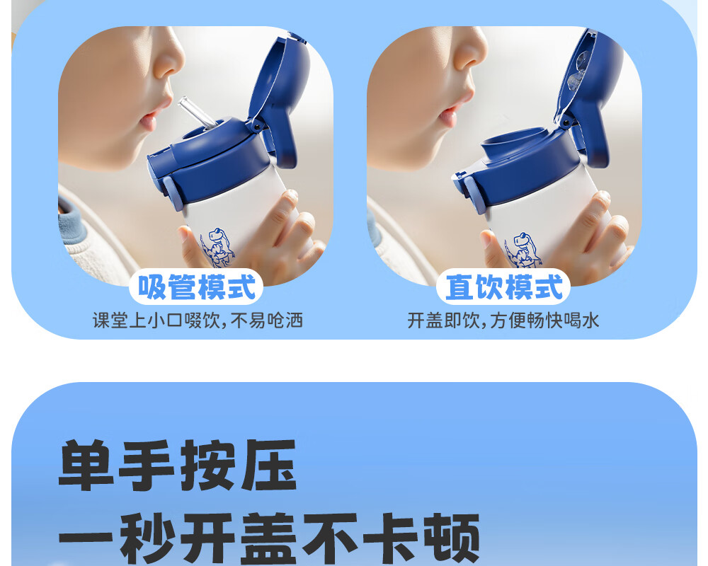 富光儿童随行保温杯男女学生新款双饮口水杯上学专用水壶吸管便携杯子 恐龙蓝500ml【一盖双饮】